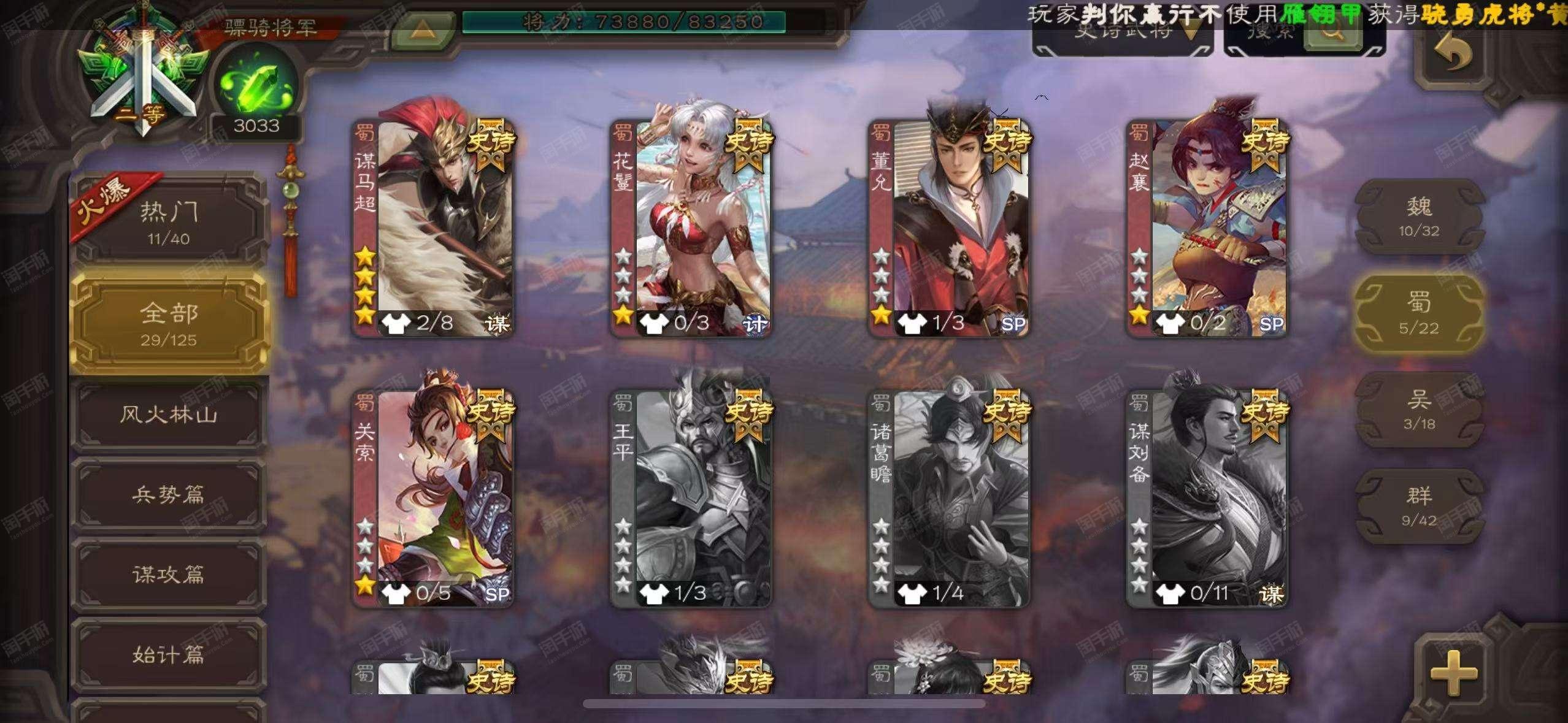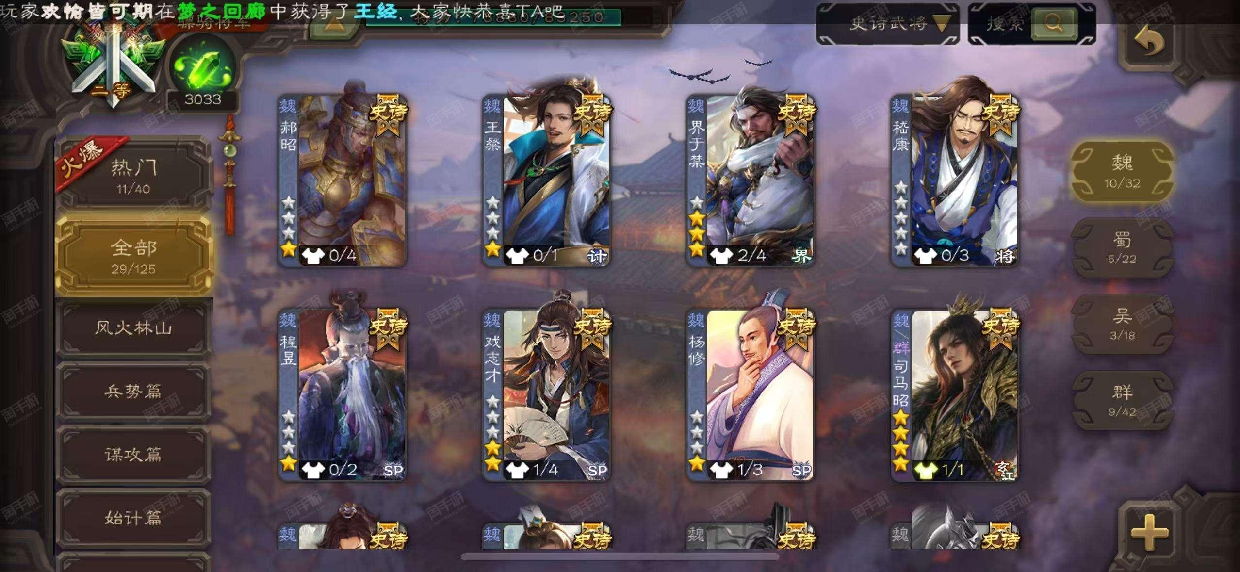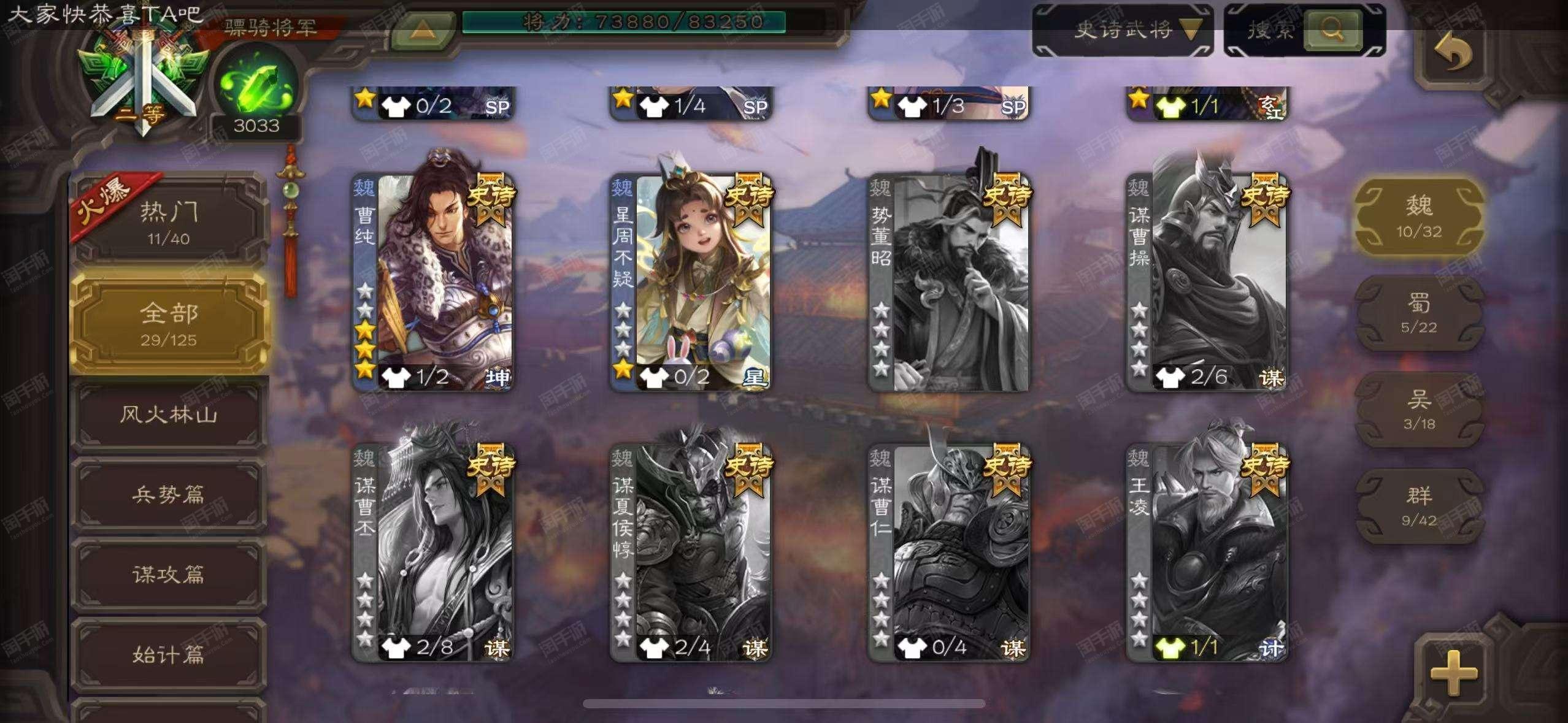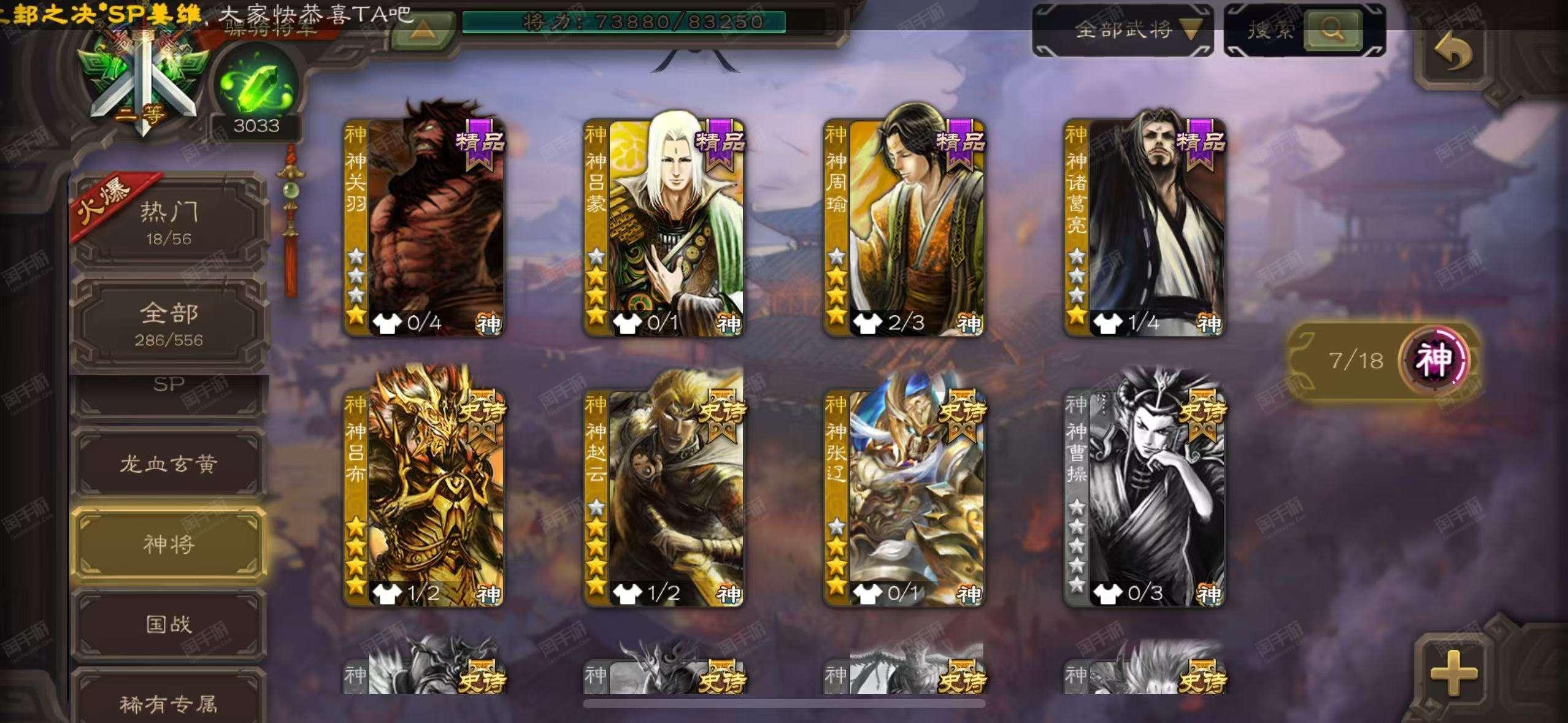 八军皇帝杜预大宝司马昭戏子水果忍者等30多个史诗武将神将吕赵辽布周葛羽7个带动皮含泪甩卖