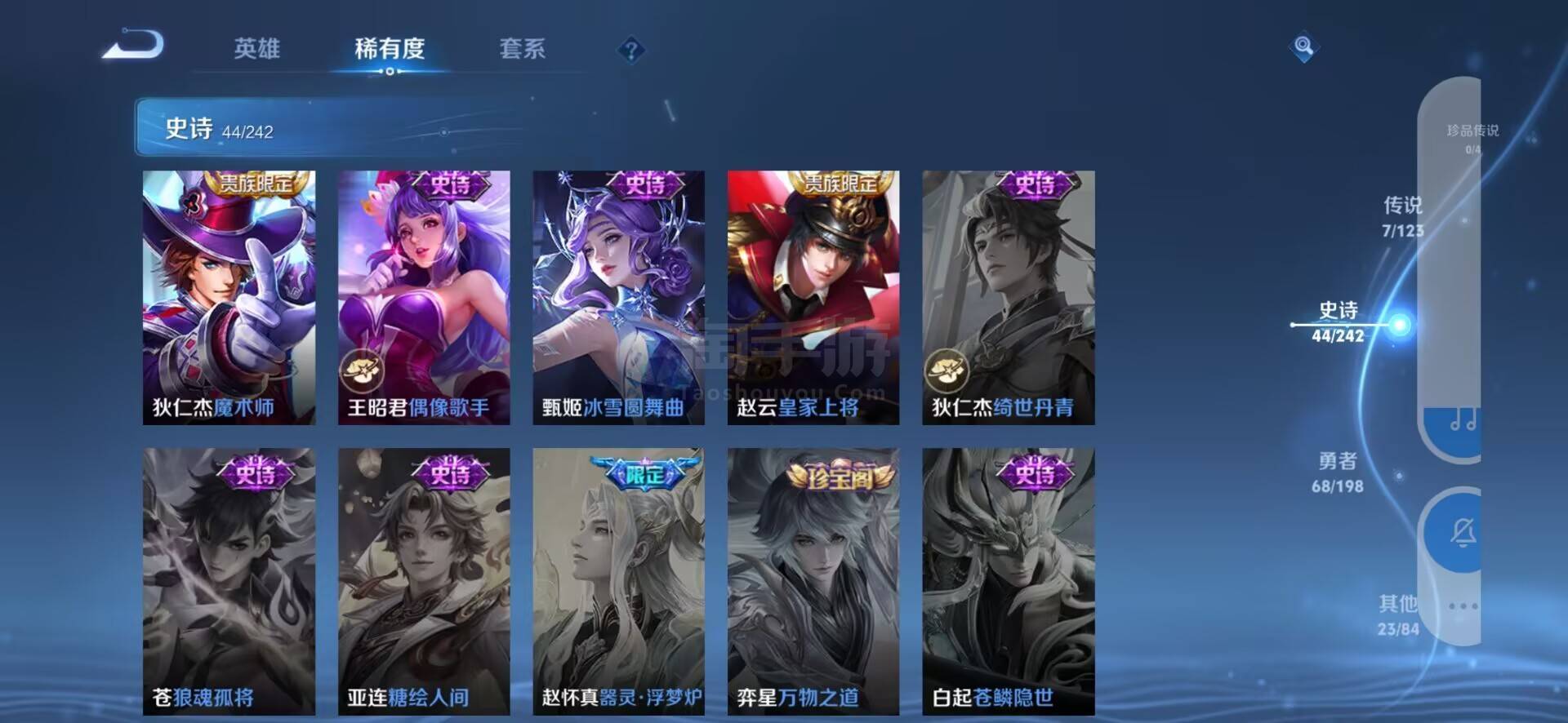 【限定皮肤】:杨戬破阵退雄兵,狄仁杰阴阳师,赵云皇家上将,赵云百木心枪,鲁班七号狮舞东方,高渐离玩趣恶龙,白起夜都怪侠,周