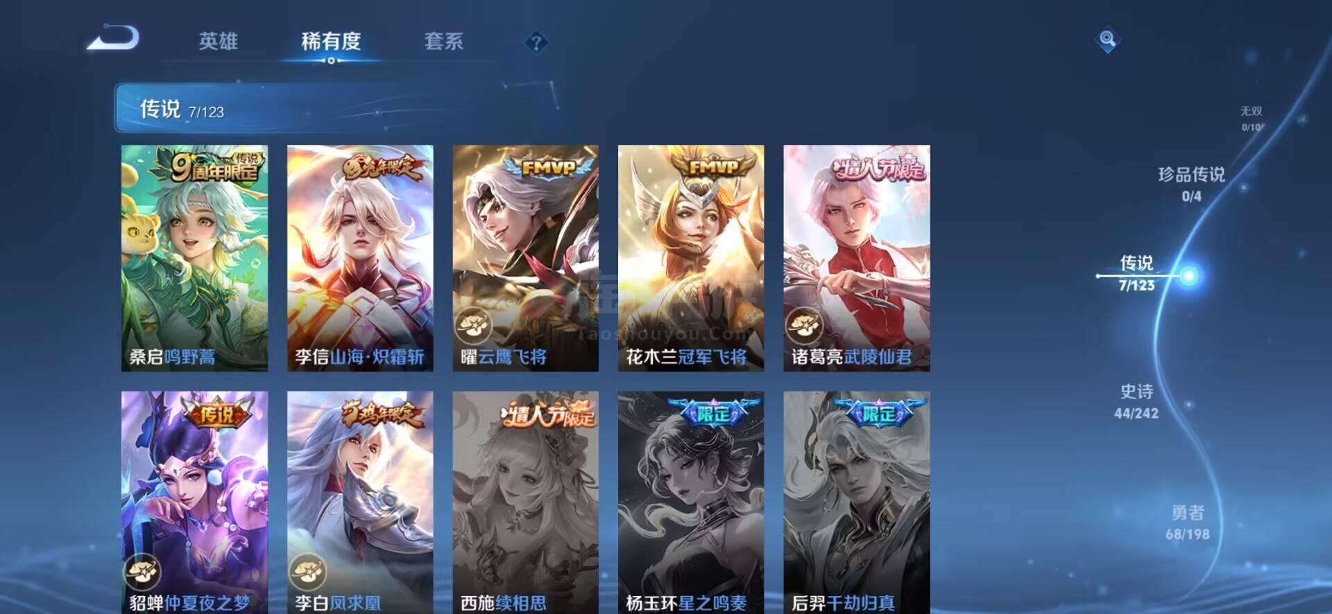【传说皮肤】:貂蝉仲夏夜之梦,花木兰冠军飞将,诸葛亮武陵仙君,李信山海炽霜斩,曜云鹰飞将,桑启鸣野蒿