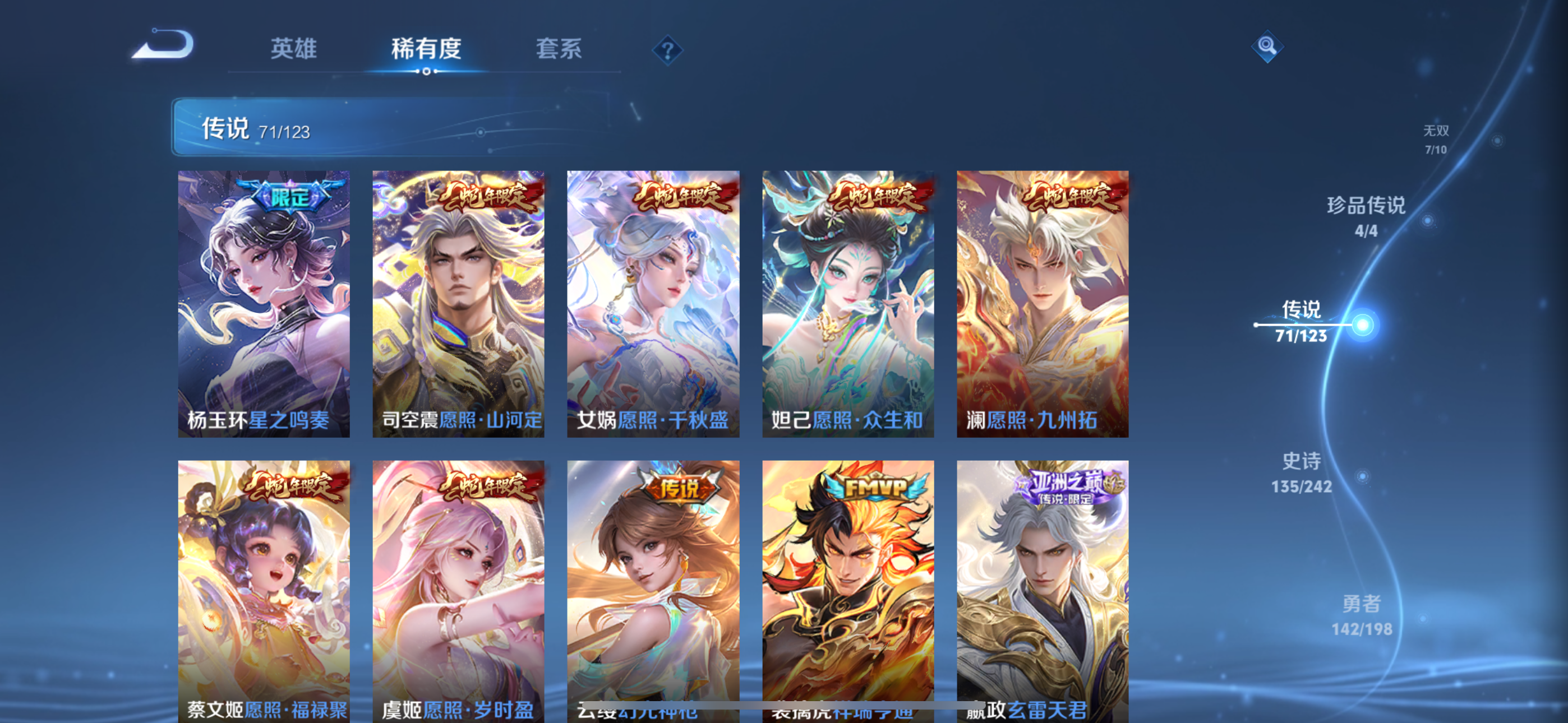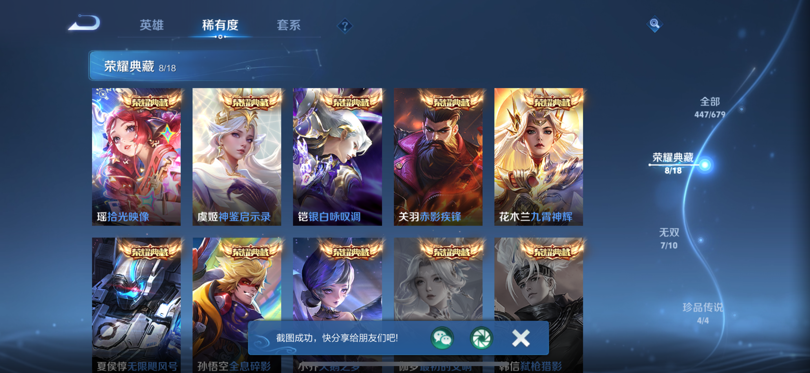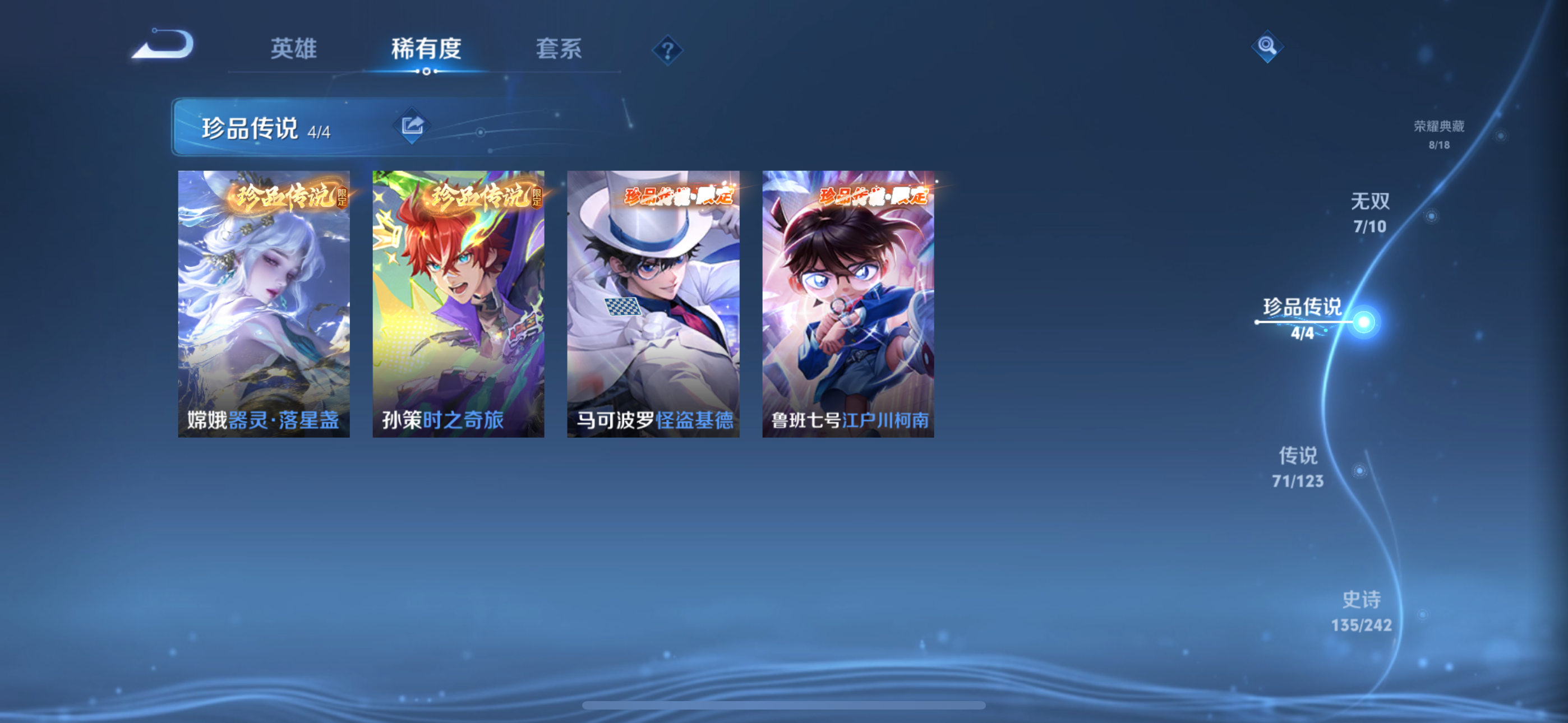 流光无双贵族,财神天幕,9水晶,7无双皮肤,3星传说,柯南和基德都有,满珍品皮肤,蛇年皮肤全满,新出的皮肤都买了,上班没时间玩了。二次还有一周出来。