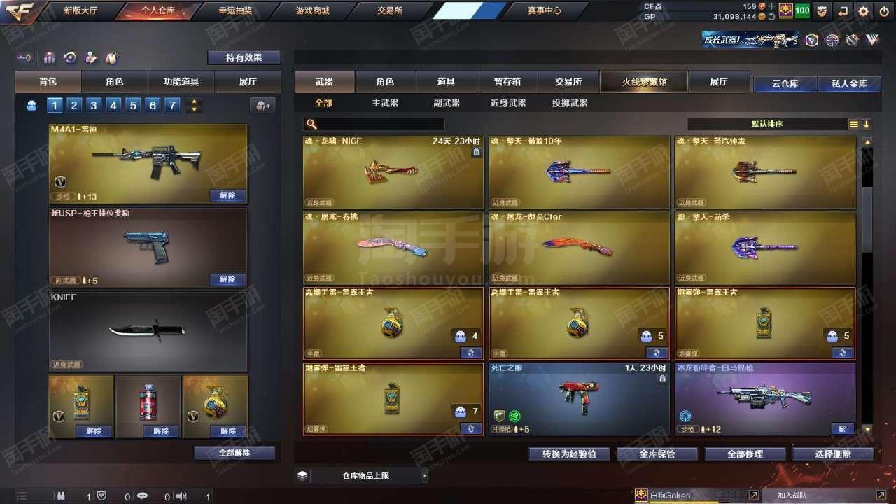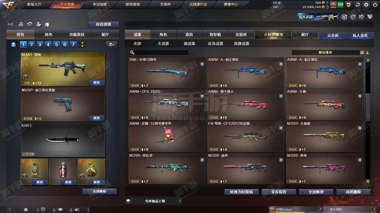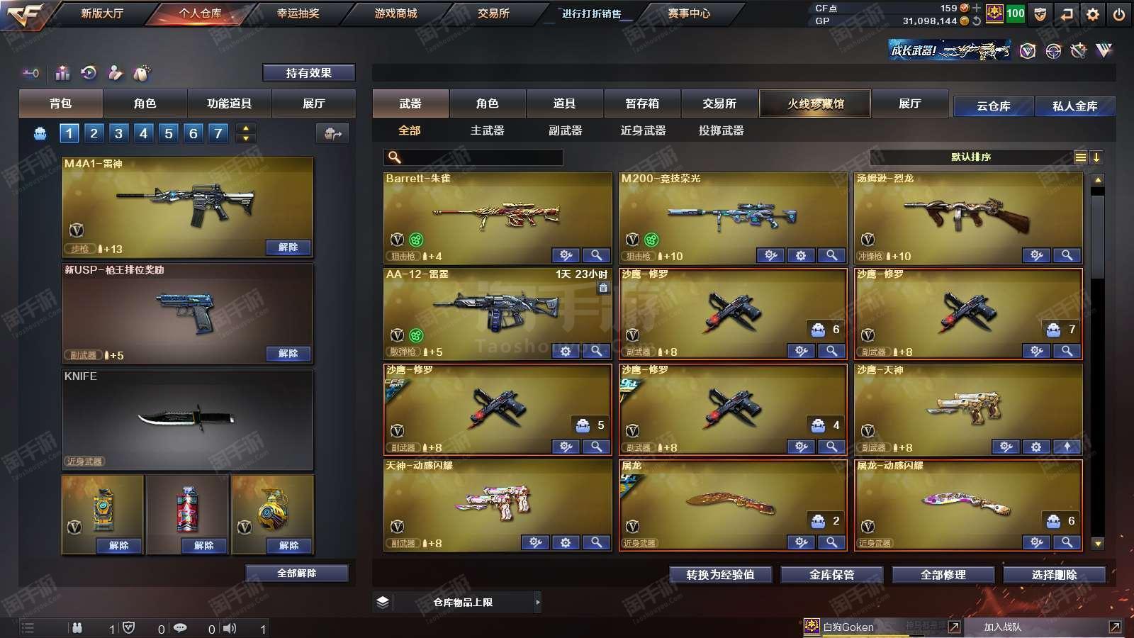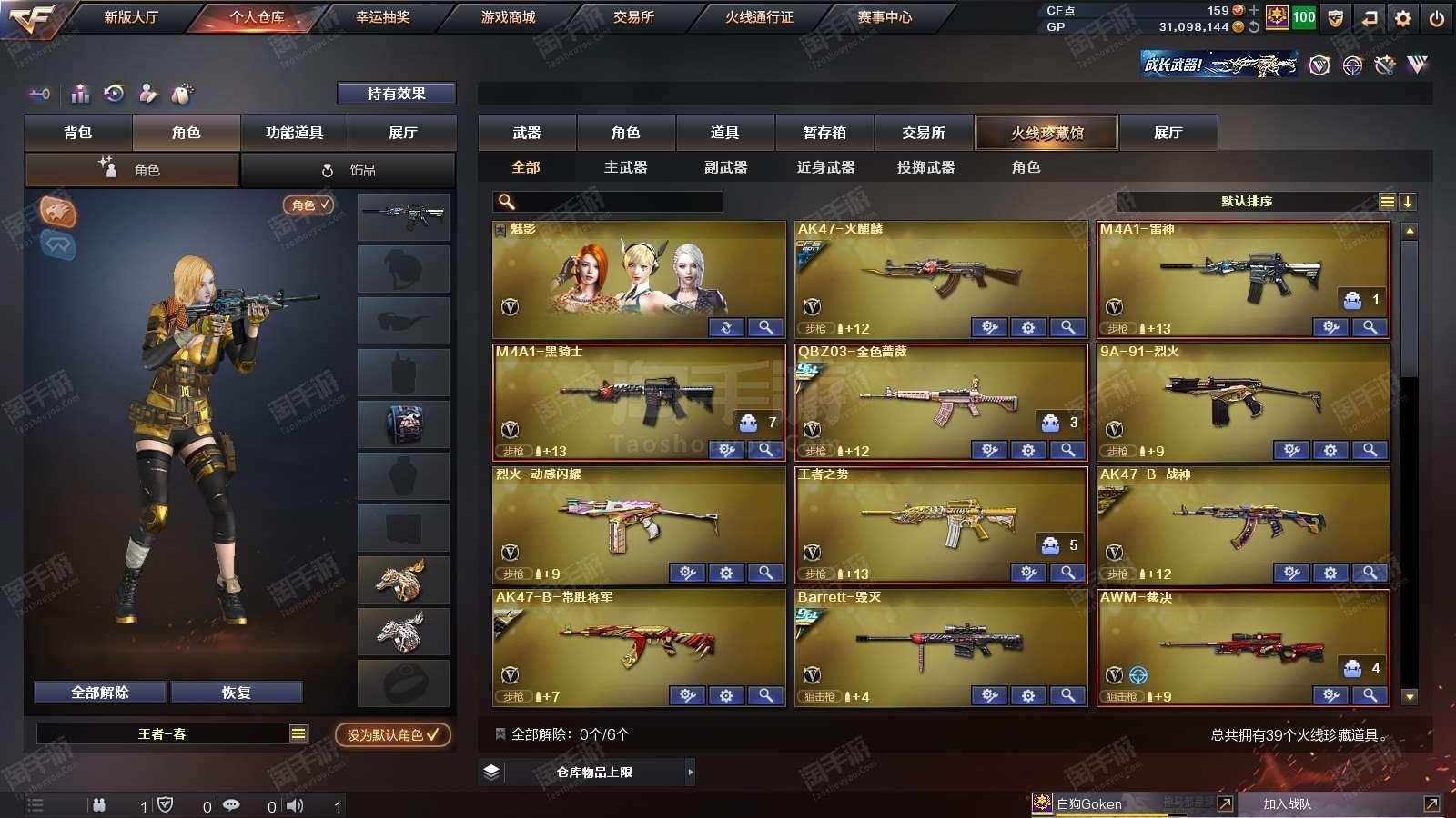 1677073_广东/南部/实名可改/38V14王者1炫金VIP6【主武器类型】 M200-幻神 (世冠白鲨+周瑜) M200-竞技荣光 Barrett-毁灭 (AG冠军+冠军之怒+音效卡) Barrett-朱雀 AWM-裁决 M4A1-雷神 (N9) QBZ03-金色蔷薇 (冠军之薇+世冠白鲨) 王者之势觉醒版 M4A1-黑骑士 (白马银枪+音效卡) AK47-火麒麟 烈火-9A-91 烈火动感