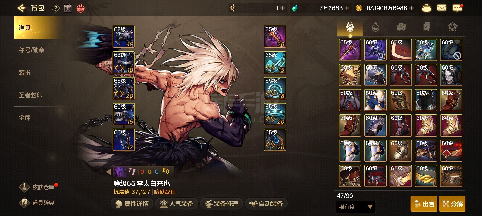 天空套狂战士37100抗魔,恐怖太刀武器强化20,装备强化15至20,微章全8级,圣者封应满12
