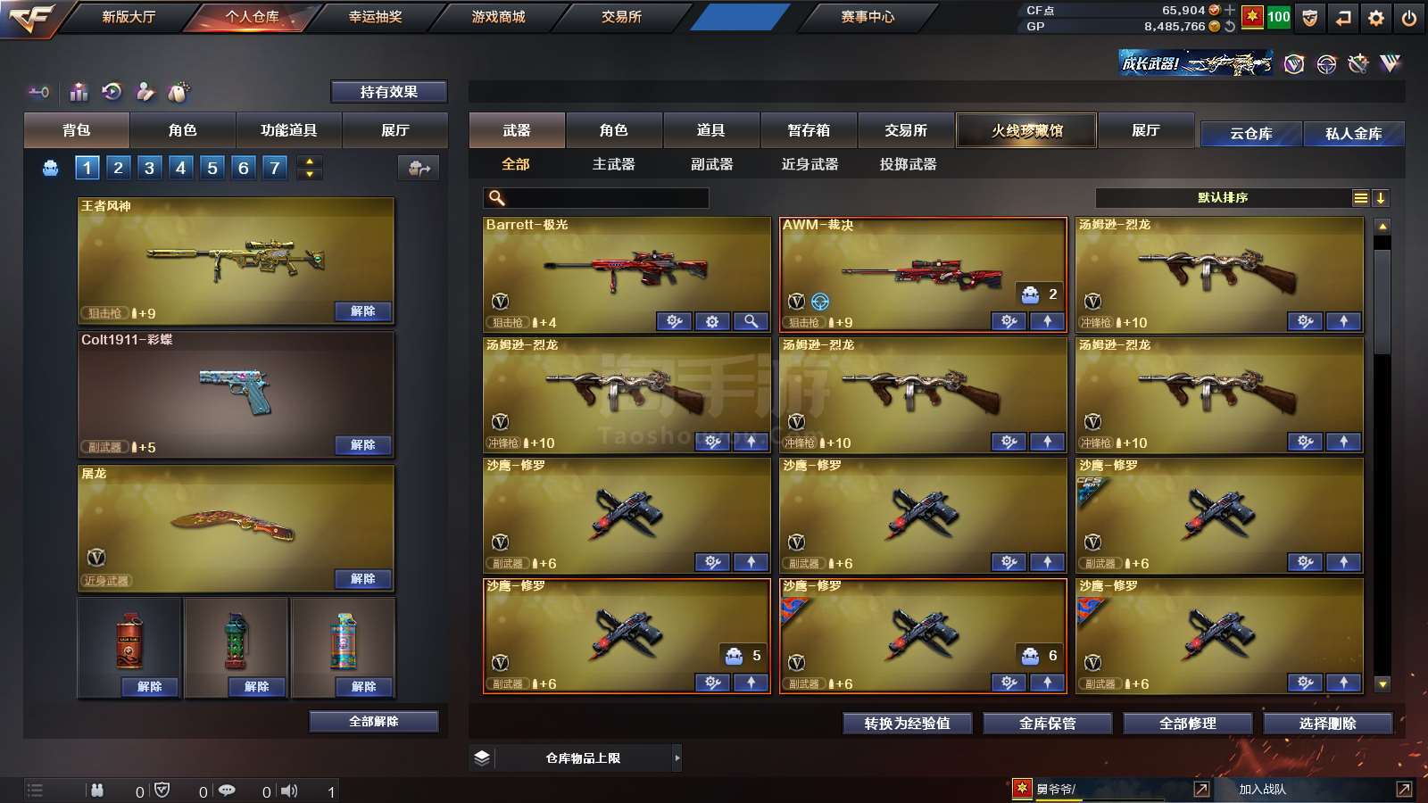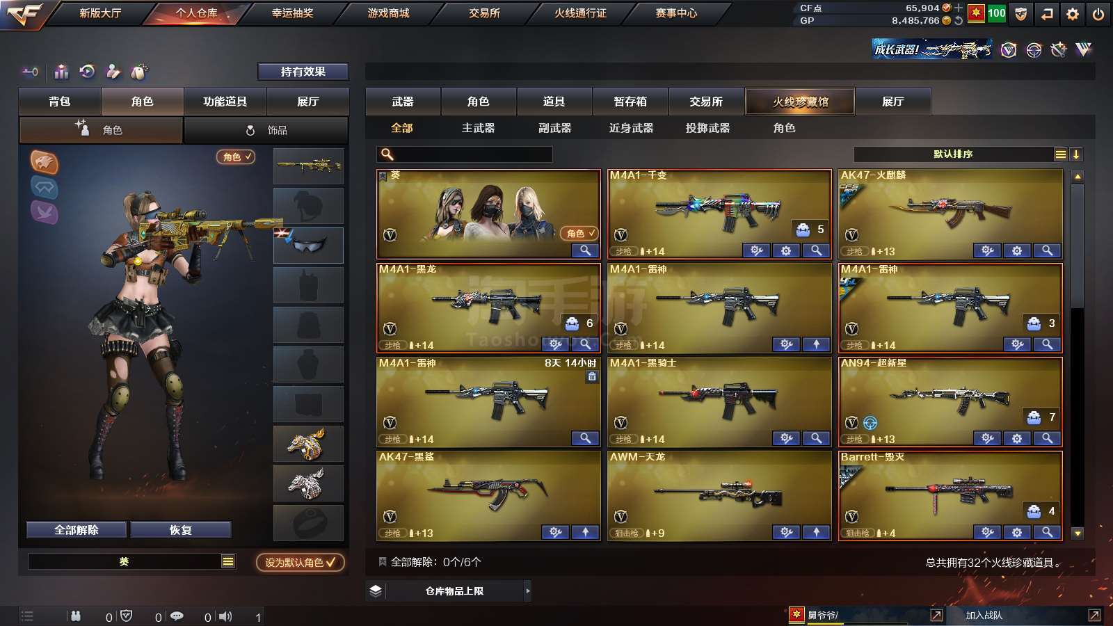 1684262_河北/北部/实名可改/31V6王者5炫金 (带6.5万点卷)【主武器类型】王者风神 4烈龙 Barrett-毁灭 (星空+音效卡) Barrett-极光 AWM-裁决 M4A1-雷神 (荣耀之魄) M4A1-黑龙 M4A1-黑骑士 M4A1-千变 AK47-火麒麟 AK47-黑鲨 AN94-超新星 汤姆逊-烈龙 *4 AWM-天龙 炫金雷神 炫金黑龙 炫金武士 炫金千变 6修罗 S