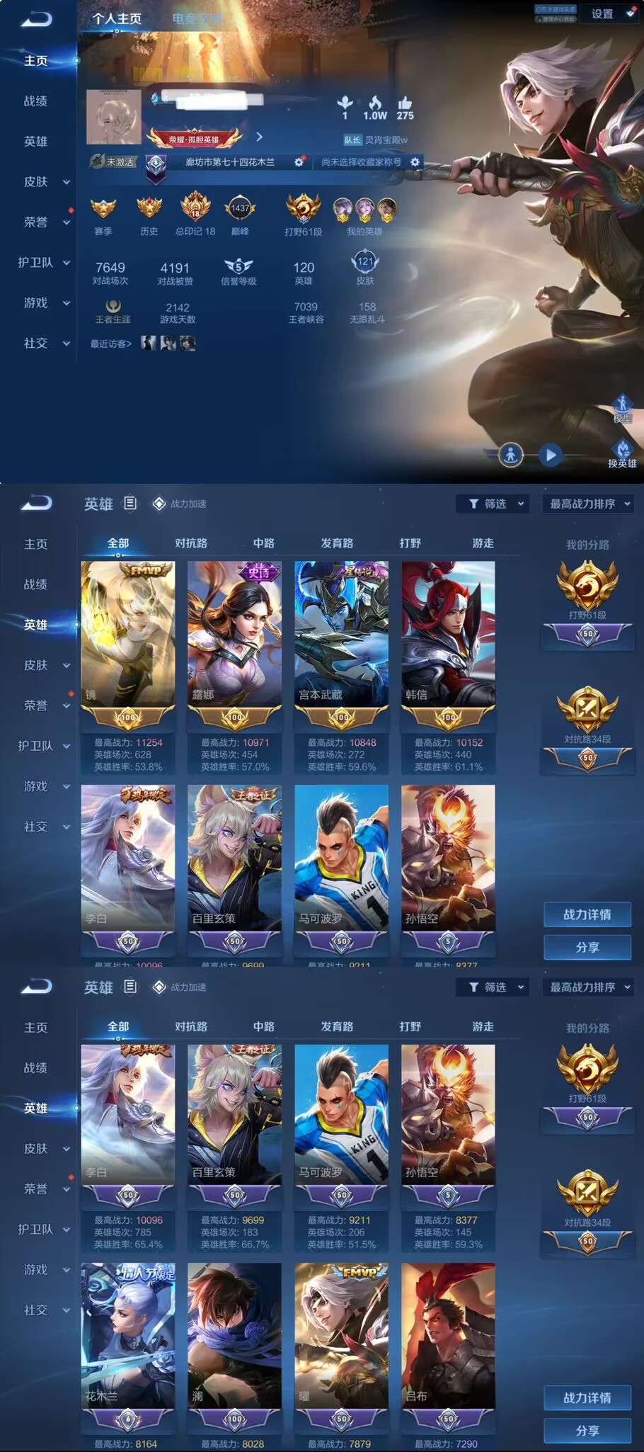 v7账号大甩卖,两万场次宿迁胜场王头衔!常规英雄都有标!李白典藏皮肤6个传说皮肤干将fmvp