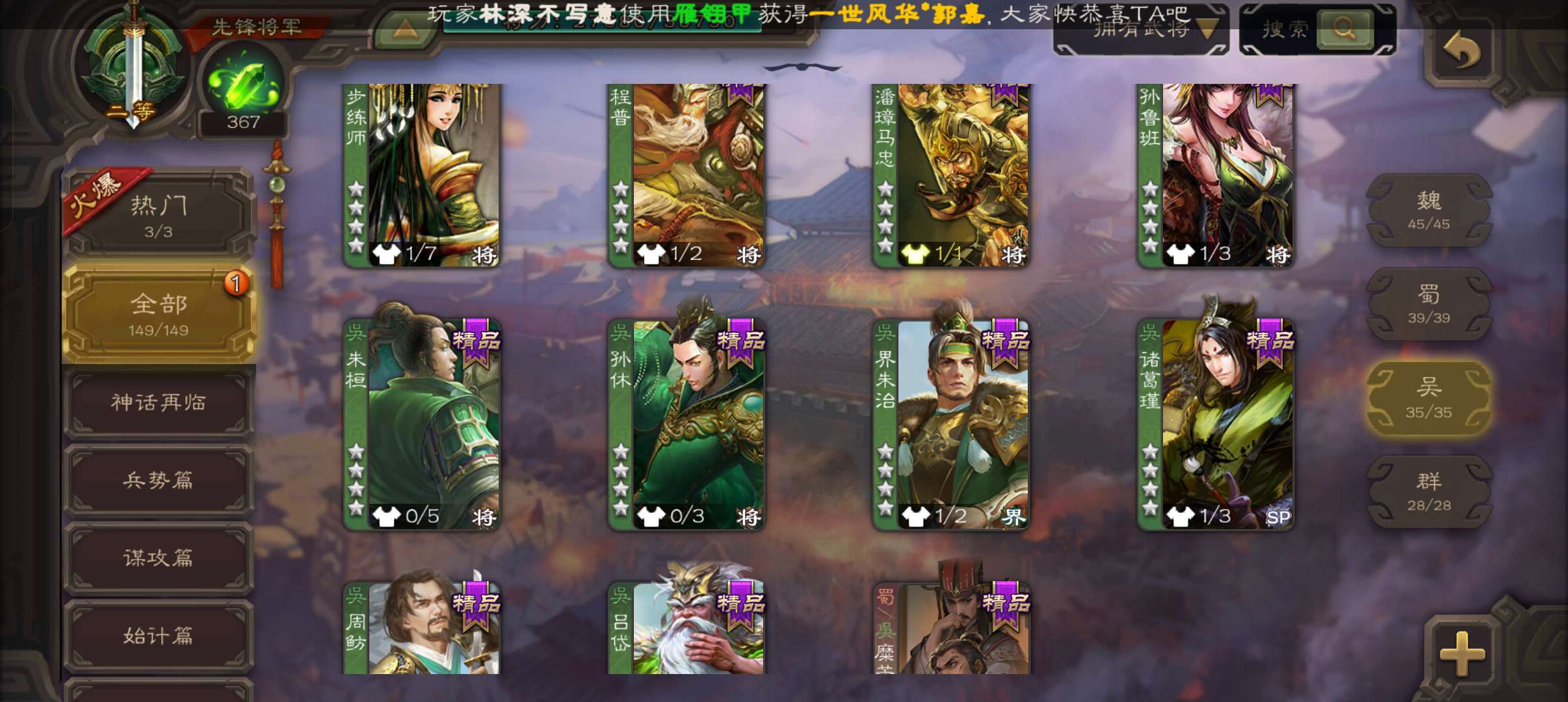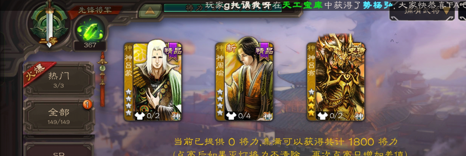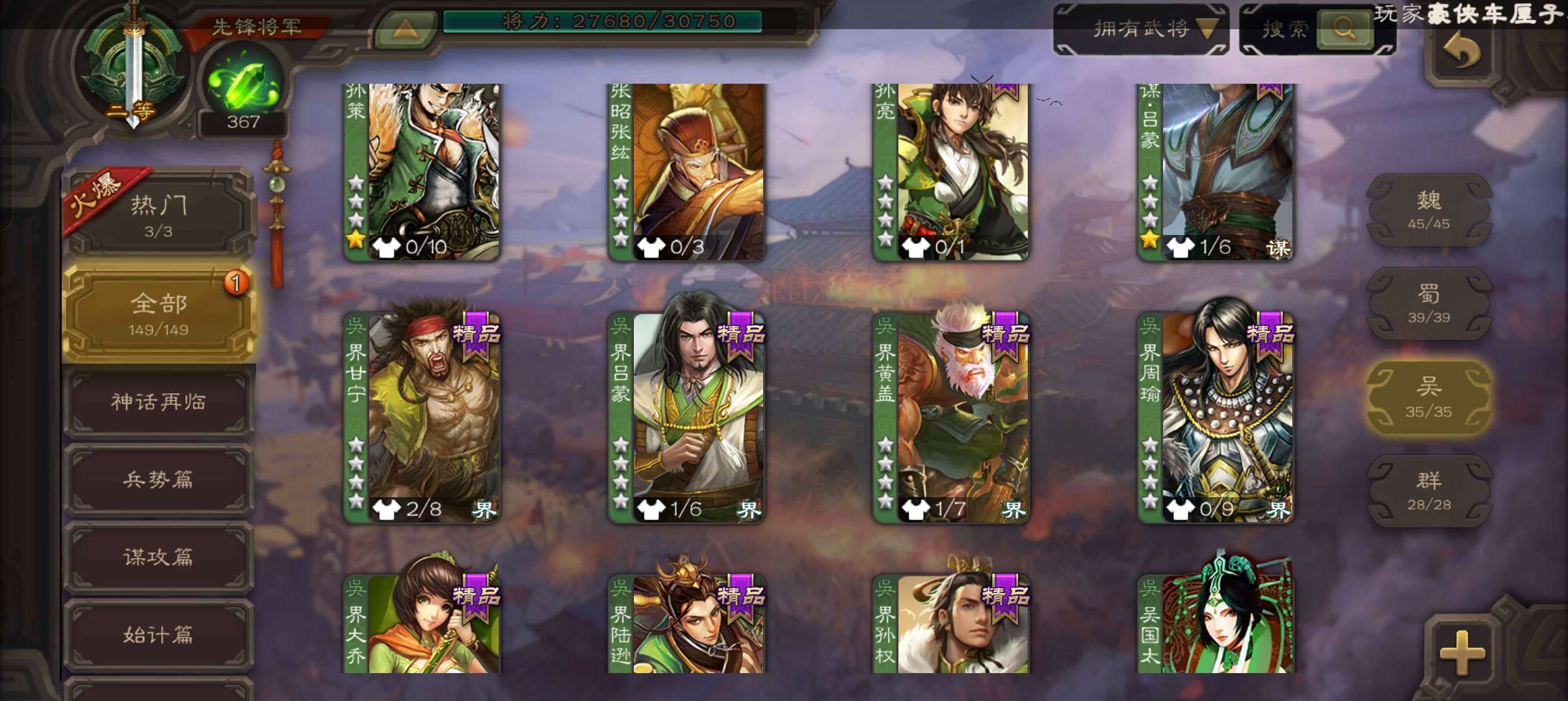 5史诗3神先锋,金皮郝昭神吕布谋夏侯惇谯周杨修5史诗,神周瑜神吕蒙界孙权谋吕蒙崔琰动态界大乔149将