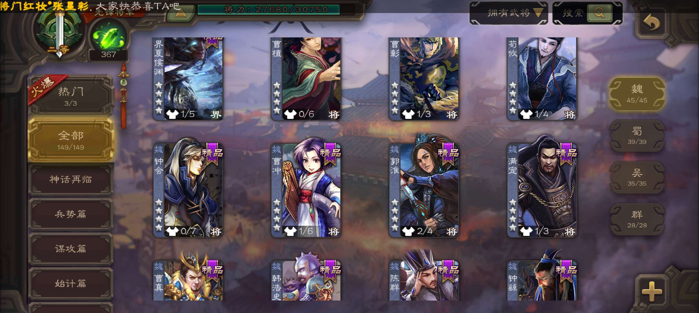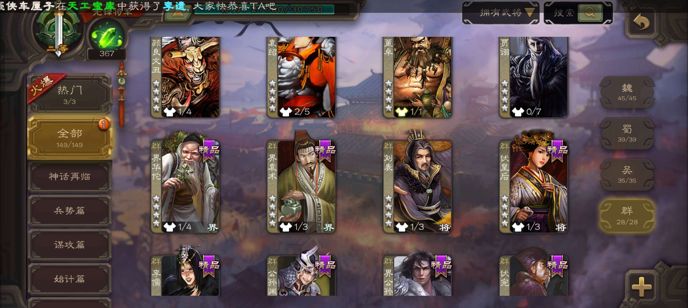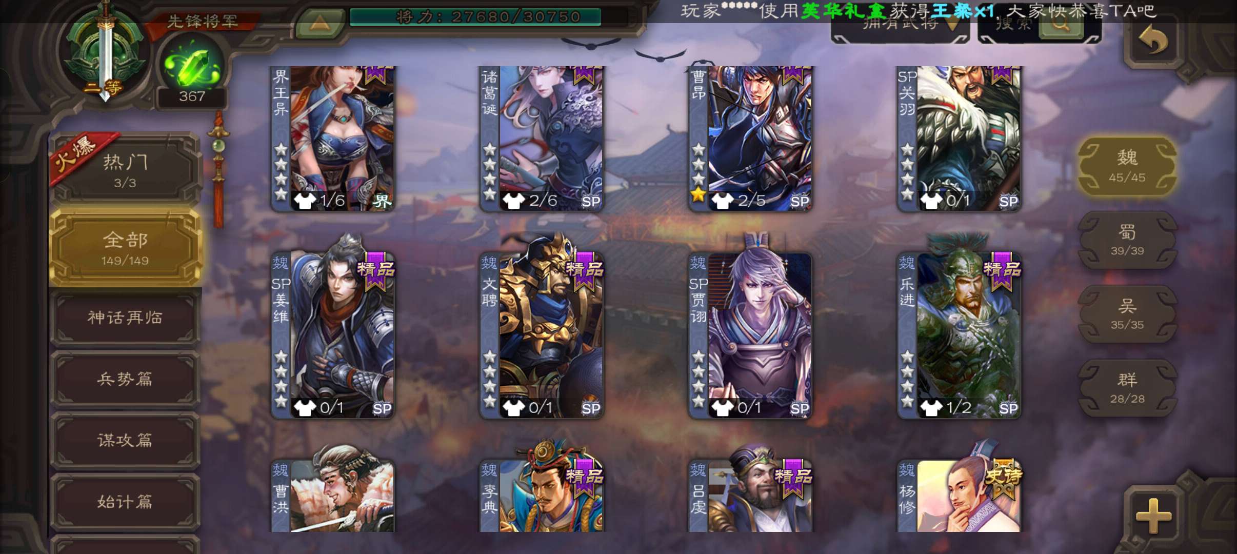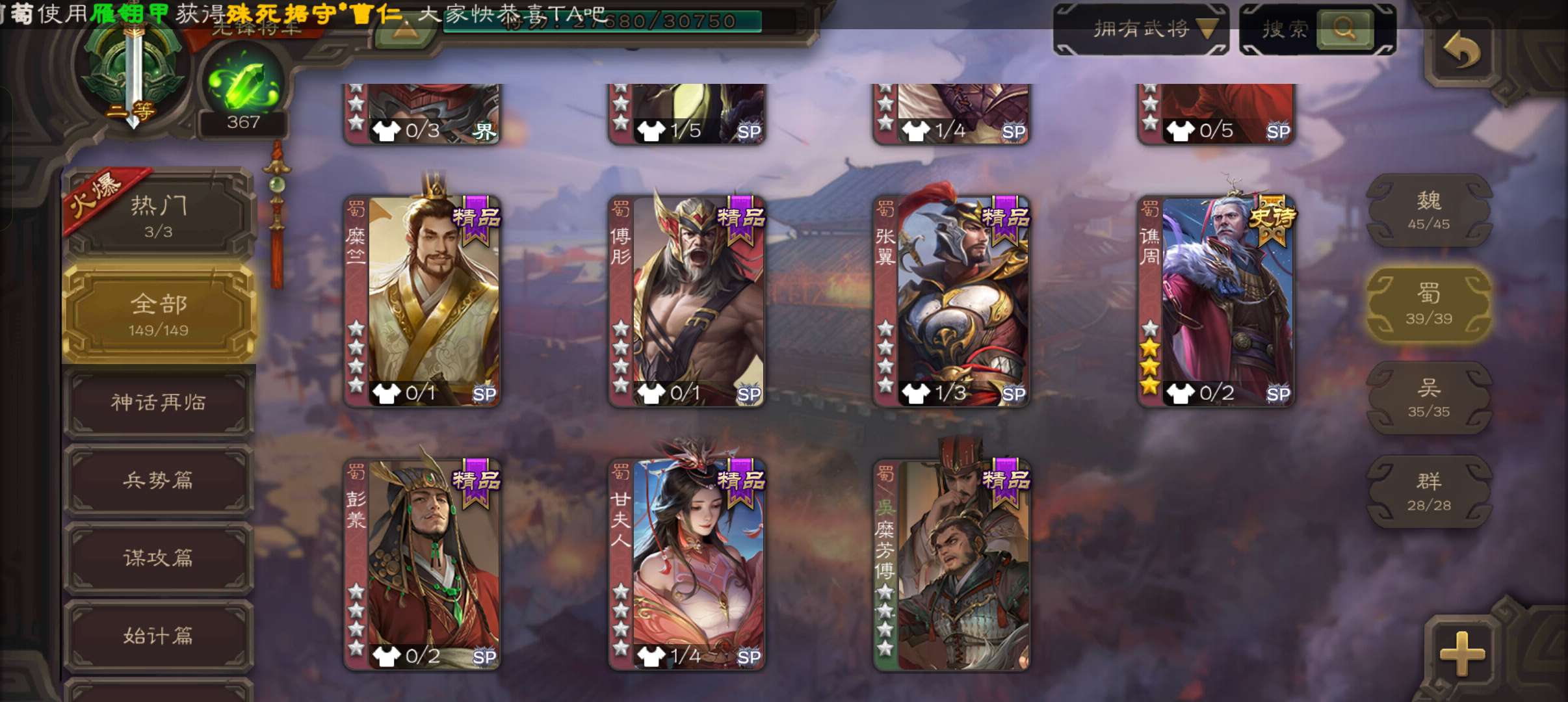 5史诗3神先锋,金皮郝昭神吕布谋夏侯惇谯周杨修5史诗,神周瑜神吕蒙界孙权谋吕蒙崔琰动态界大乔149将