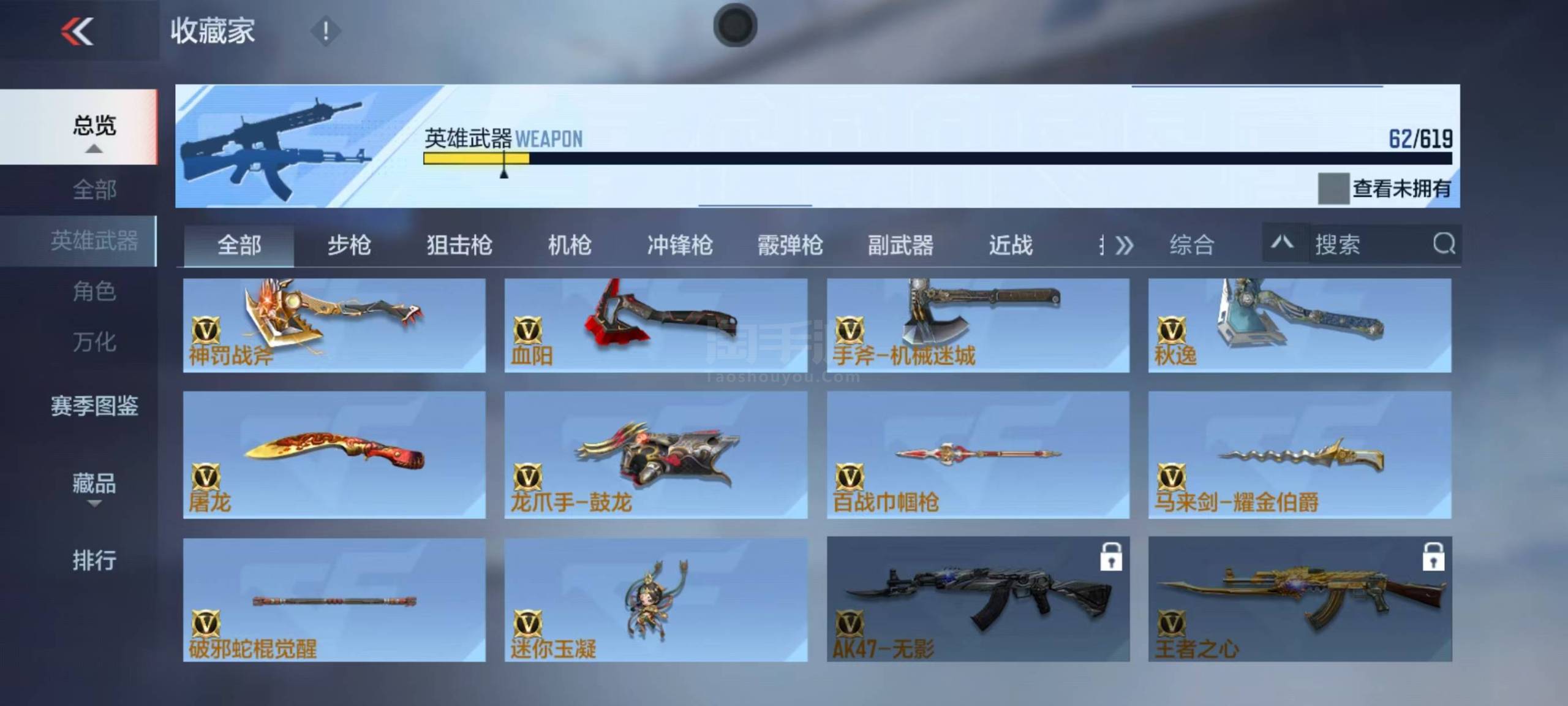 【英雄武器】:AK47-猩红传说,AK47-黑武士觉醒,AK47-血武士,M4A1-雷神,M4A1-死神,M4A1-机械迷城,M4A1-太白诗仙,SCAR-探星者,QBZ03-金色蔷薇,98K-黑骑士,加特林-炼狱,QBB95-极光,汤姆逊-烈龙,双持斯泰尔-天使,CBJ-MS-毒蜂,CZS2-血月,地狱烈炎,地狱火,地狱