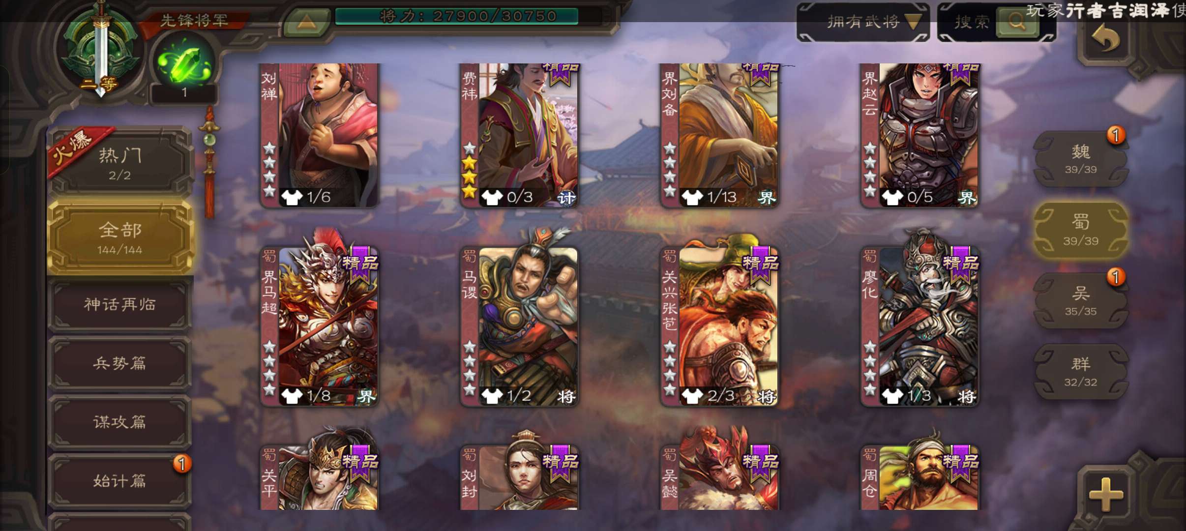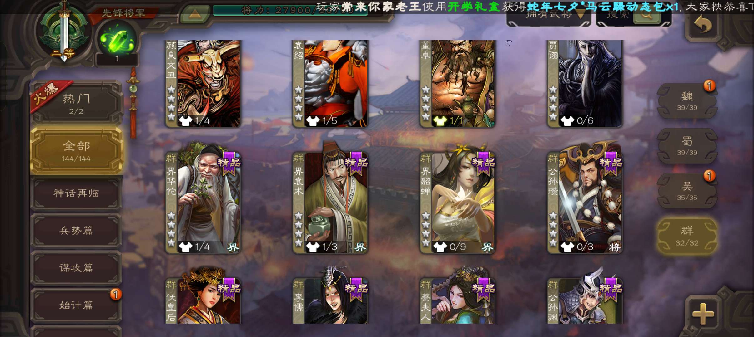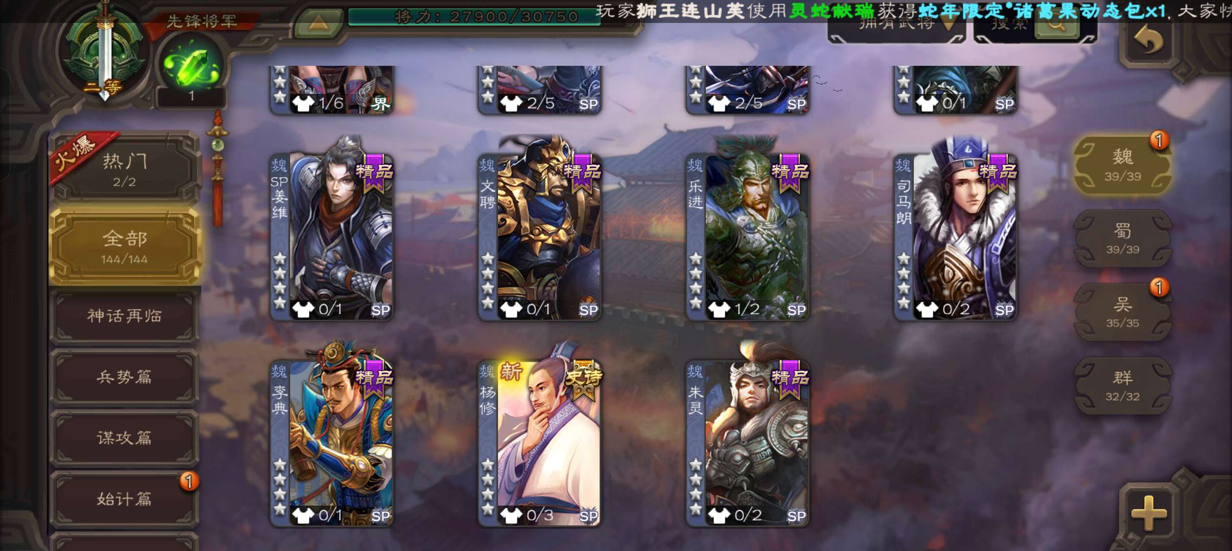回廊动白马公孙康谯周赵襄杨修贺齐6史诗先锋,费祎金皮界曹植金皮界王异彭恙144将