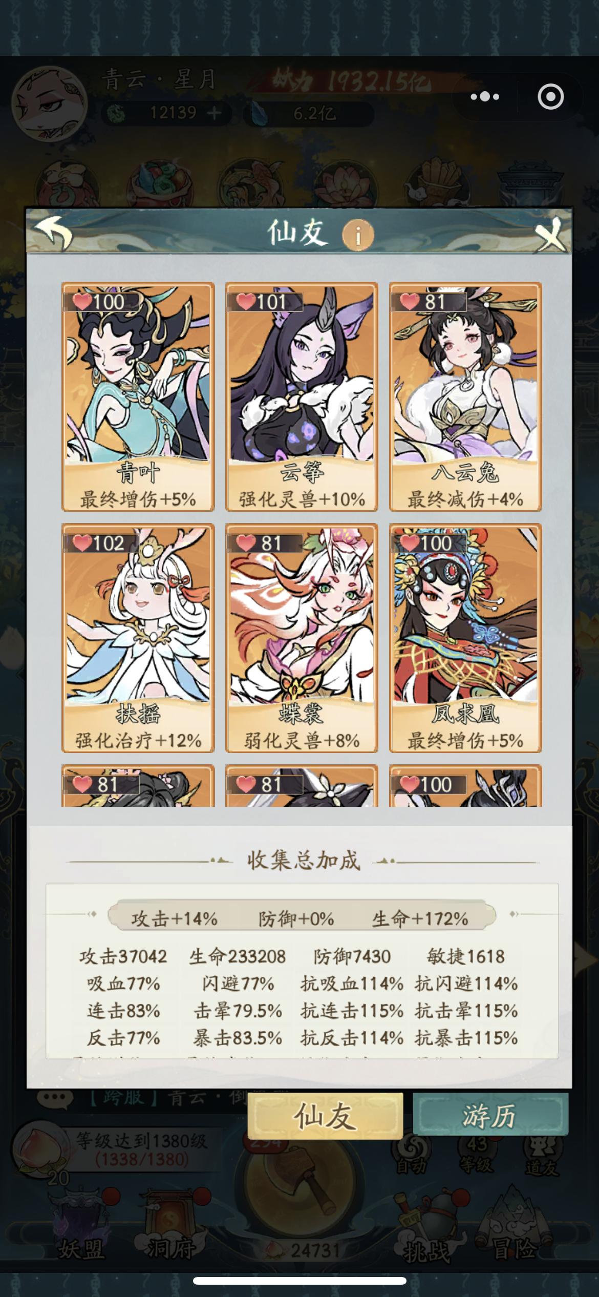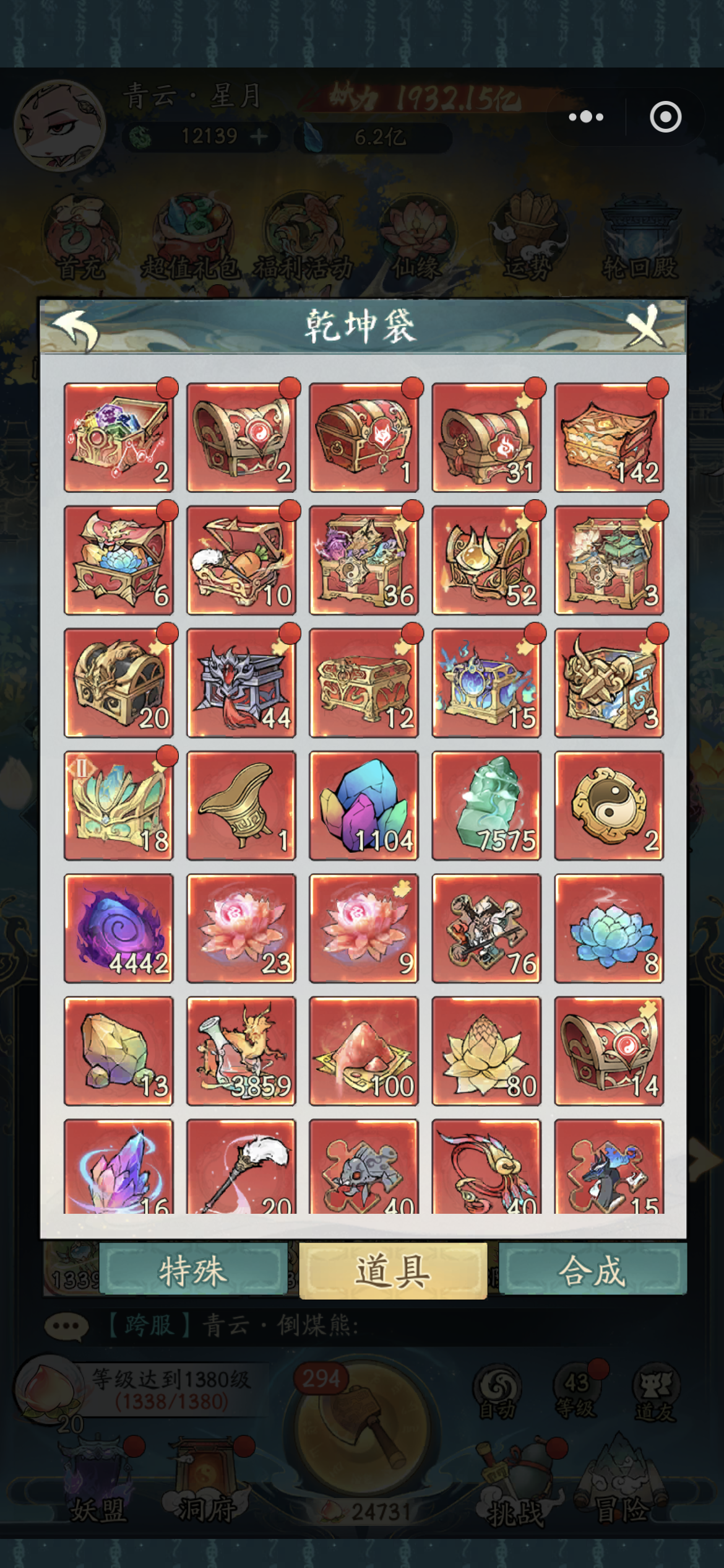 近2000亿1338级260减223增,5洪荒有两只未吃满,增减仙友基本都有