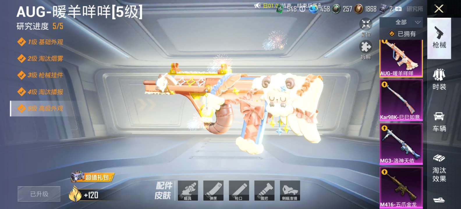 14粉装,俩车皮,四升级枪,连体王者贵八,可以先验号