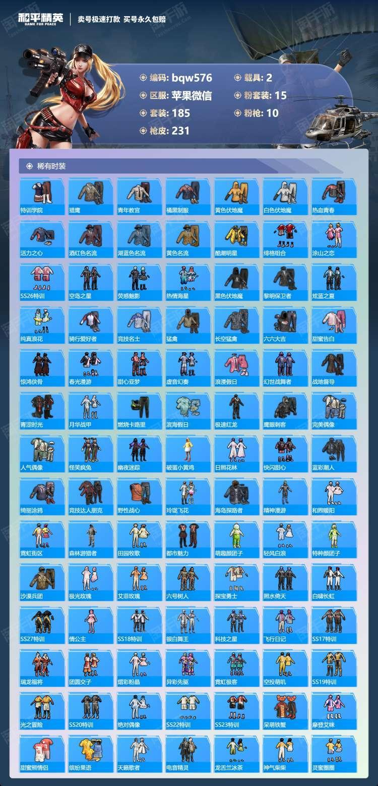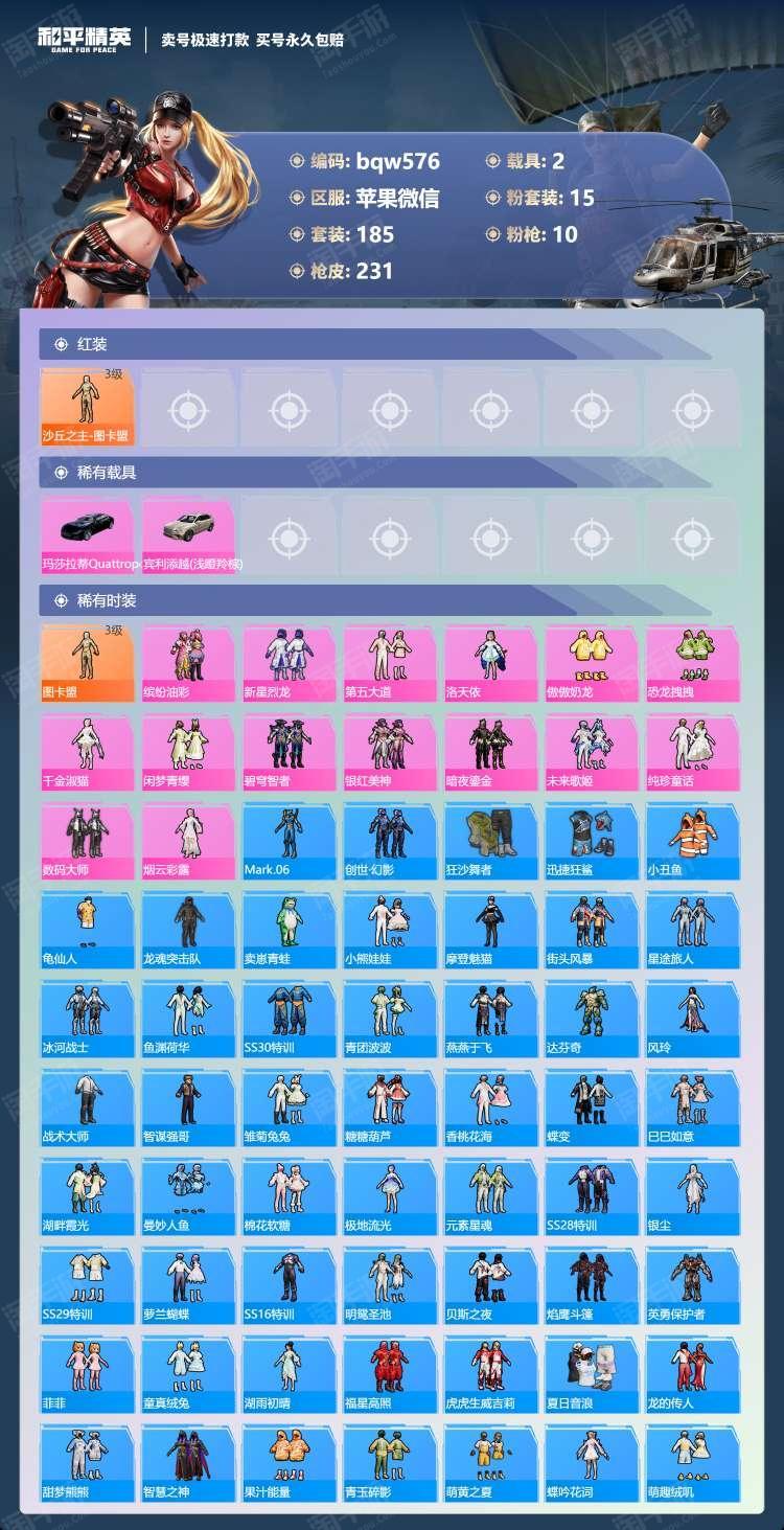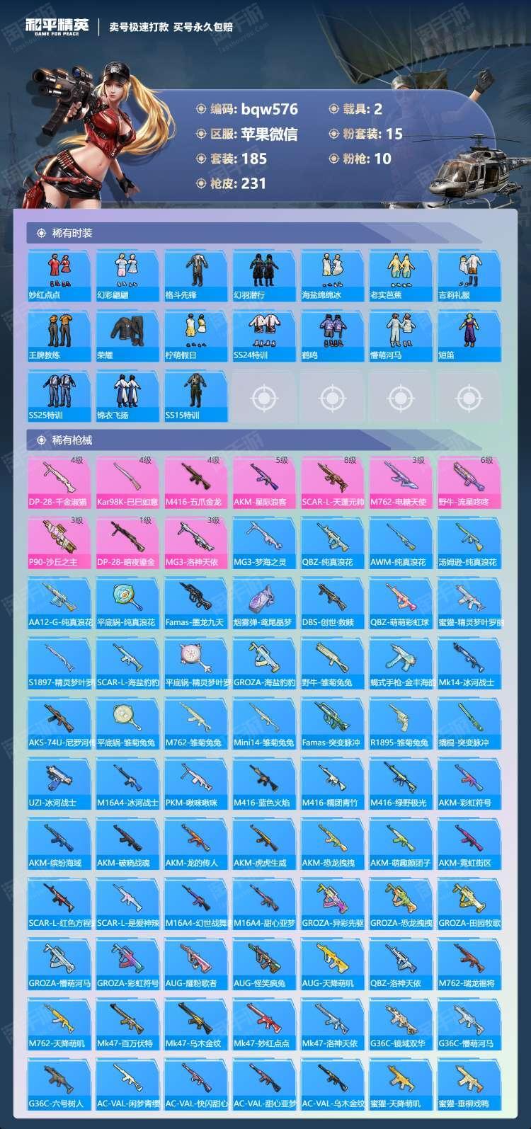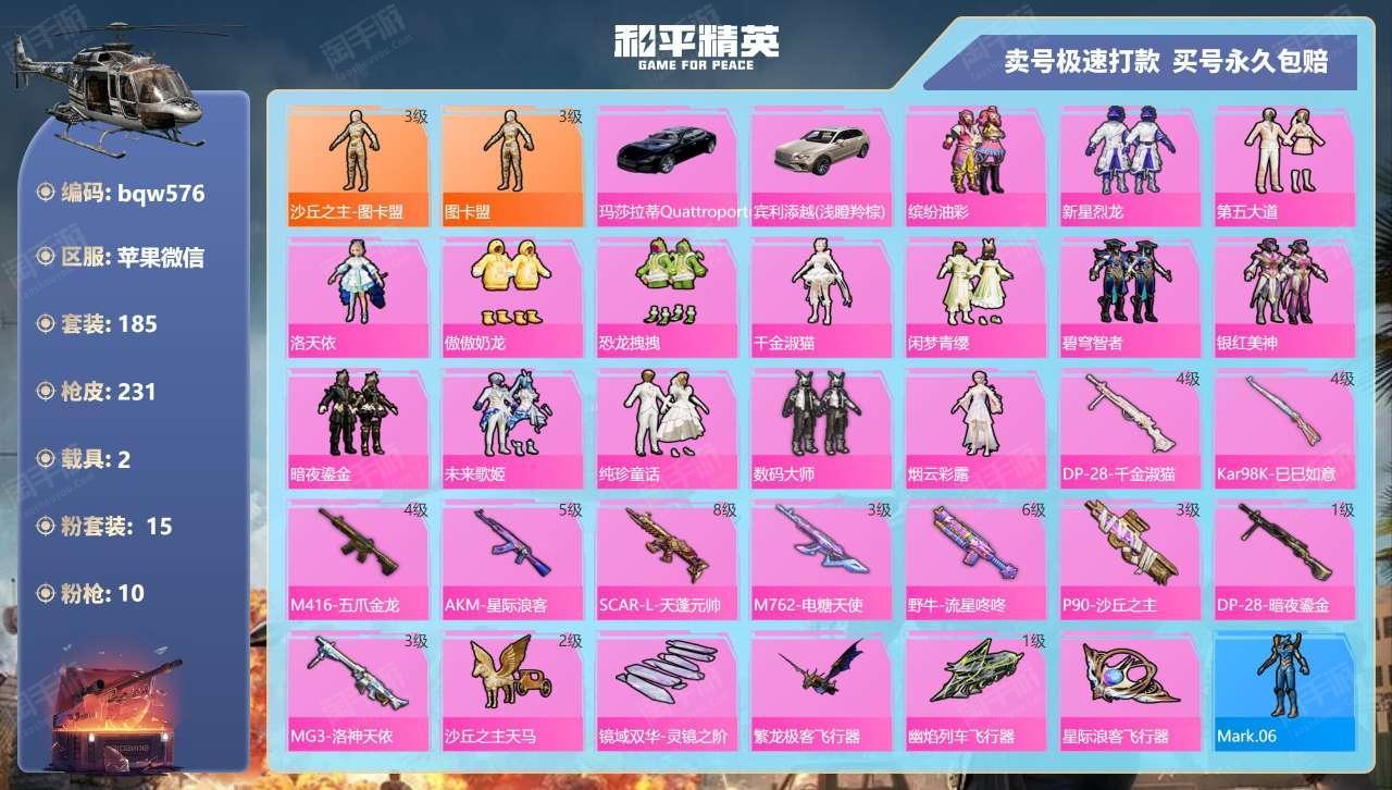bqw576/苹果微-15王牌印记-15粉装-10特效枪-2载具-87119热力值-185套装-2