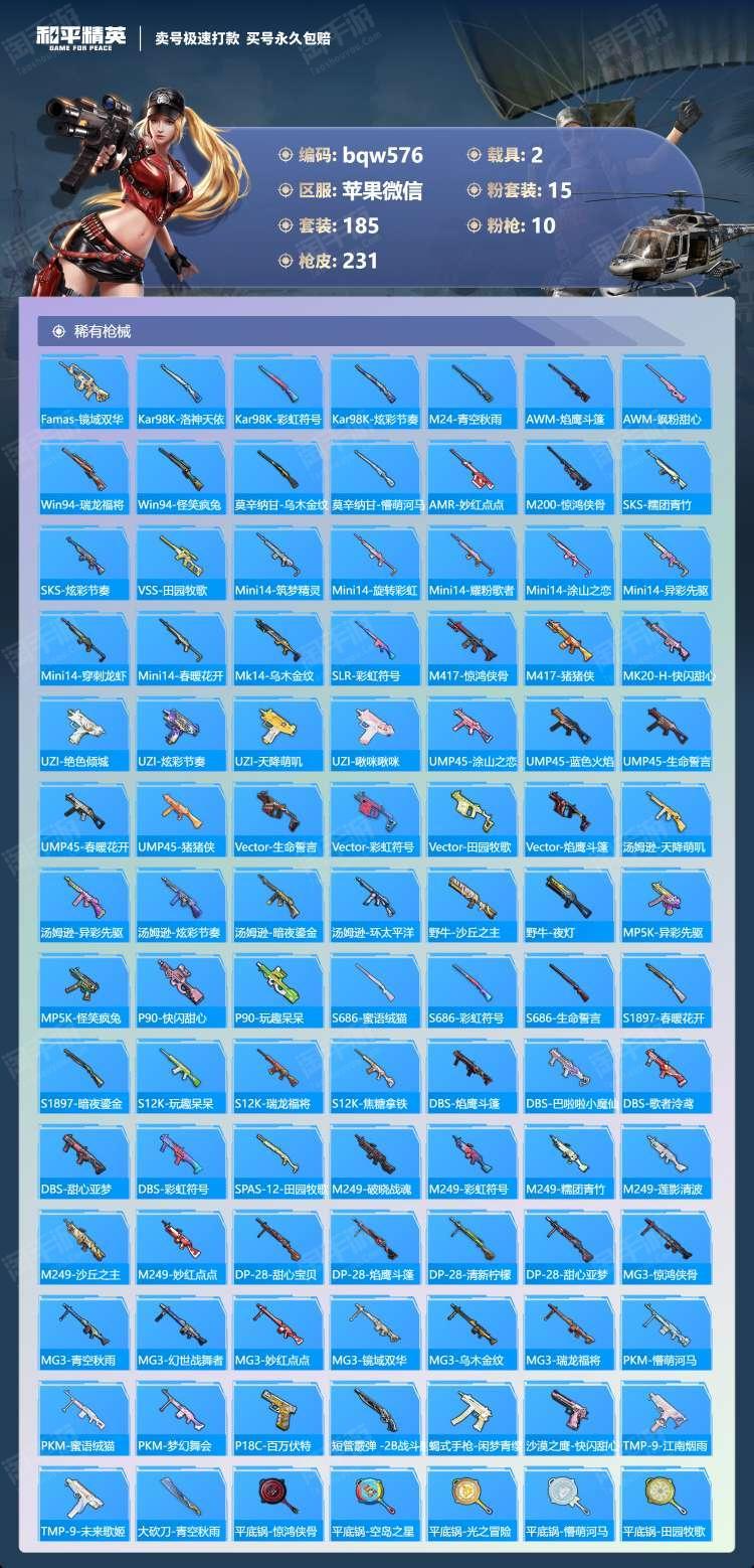 和平精英【苹果微信】bqw576/苹果微-15王牌印记-15粉装-10特效枪-2载具-87119热力值-185套装-2