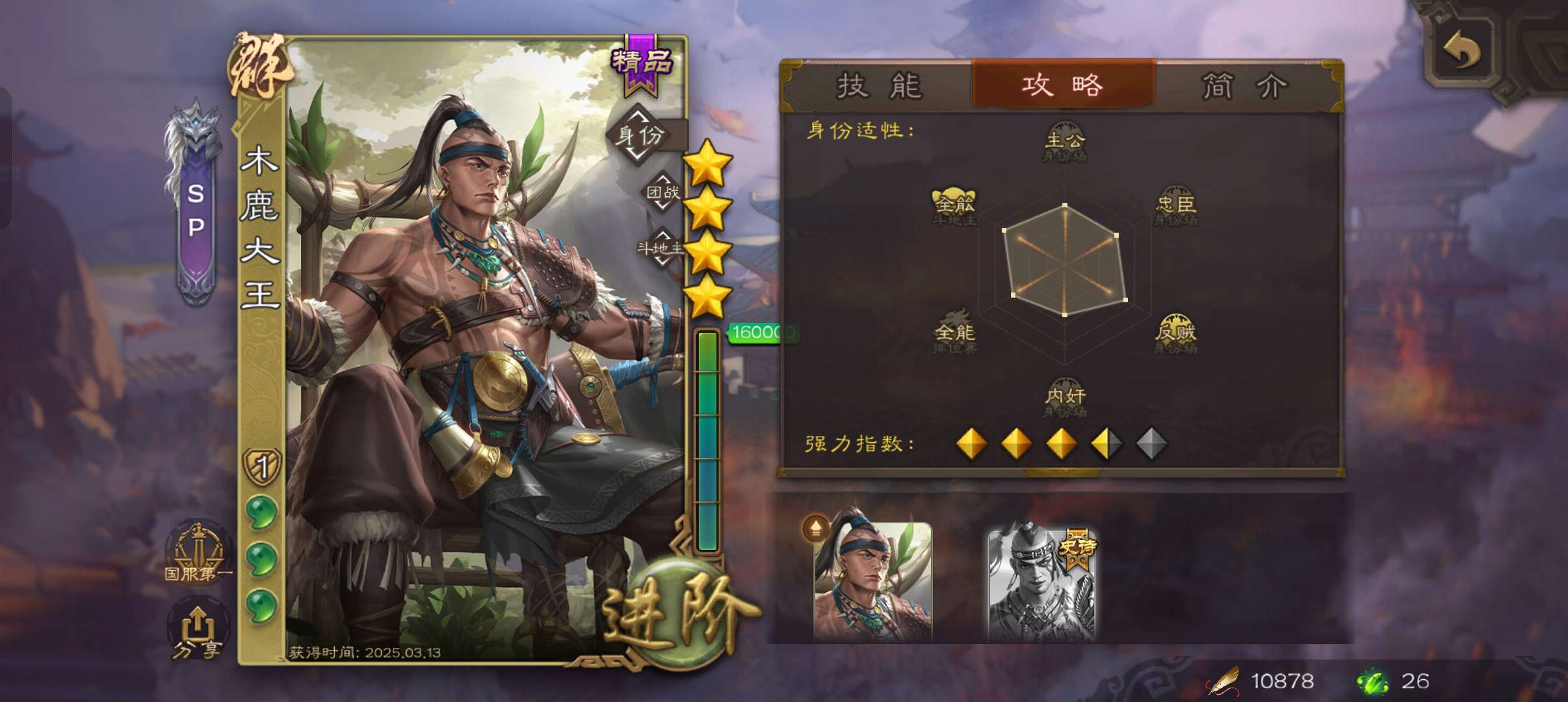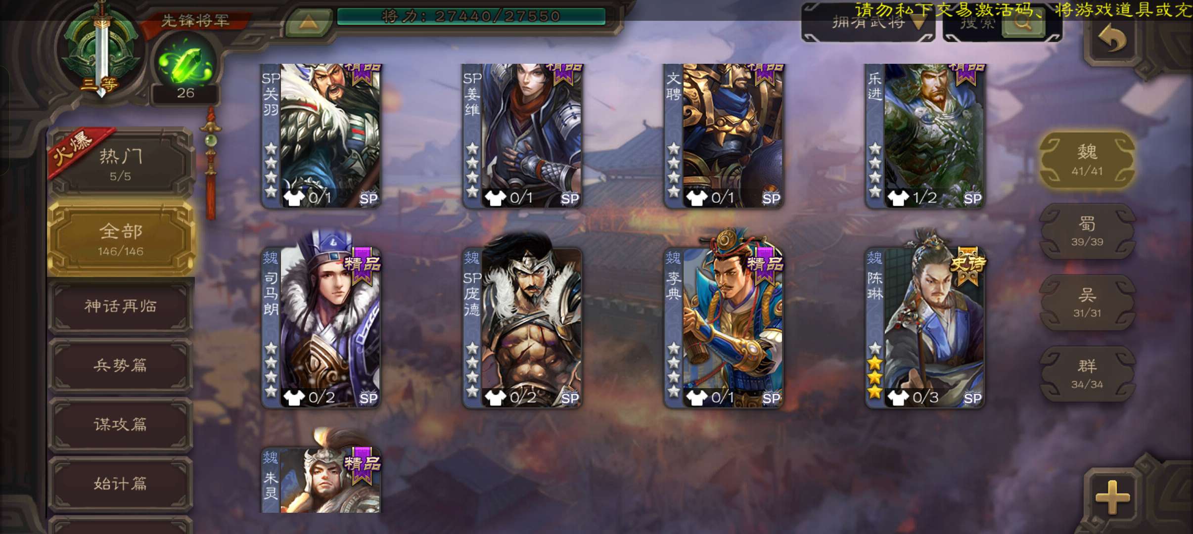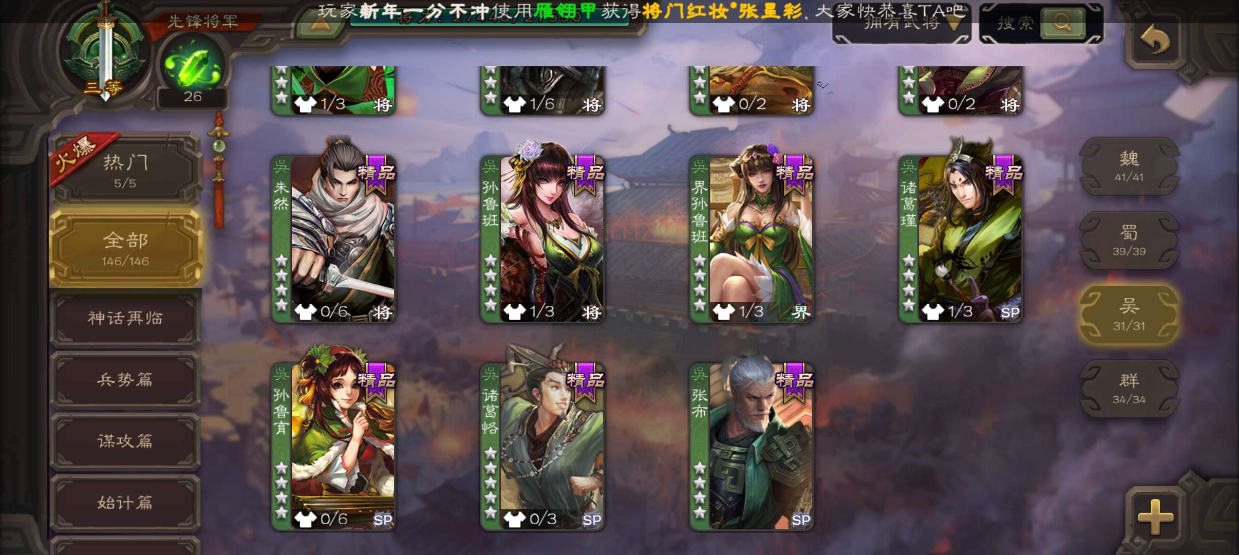 玉龙木鹿大王,半动马云騄陈琳左慈3史诗先锋,神周瑜界吕布崔琰146将