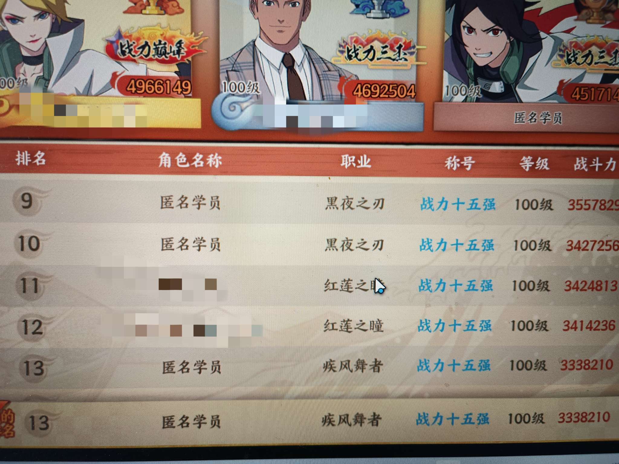 截图之前的,目前战力360,排名第十,先攻六千八,传说有四星四代,四星止水,三星死初三星鸣人可截图
