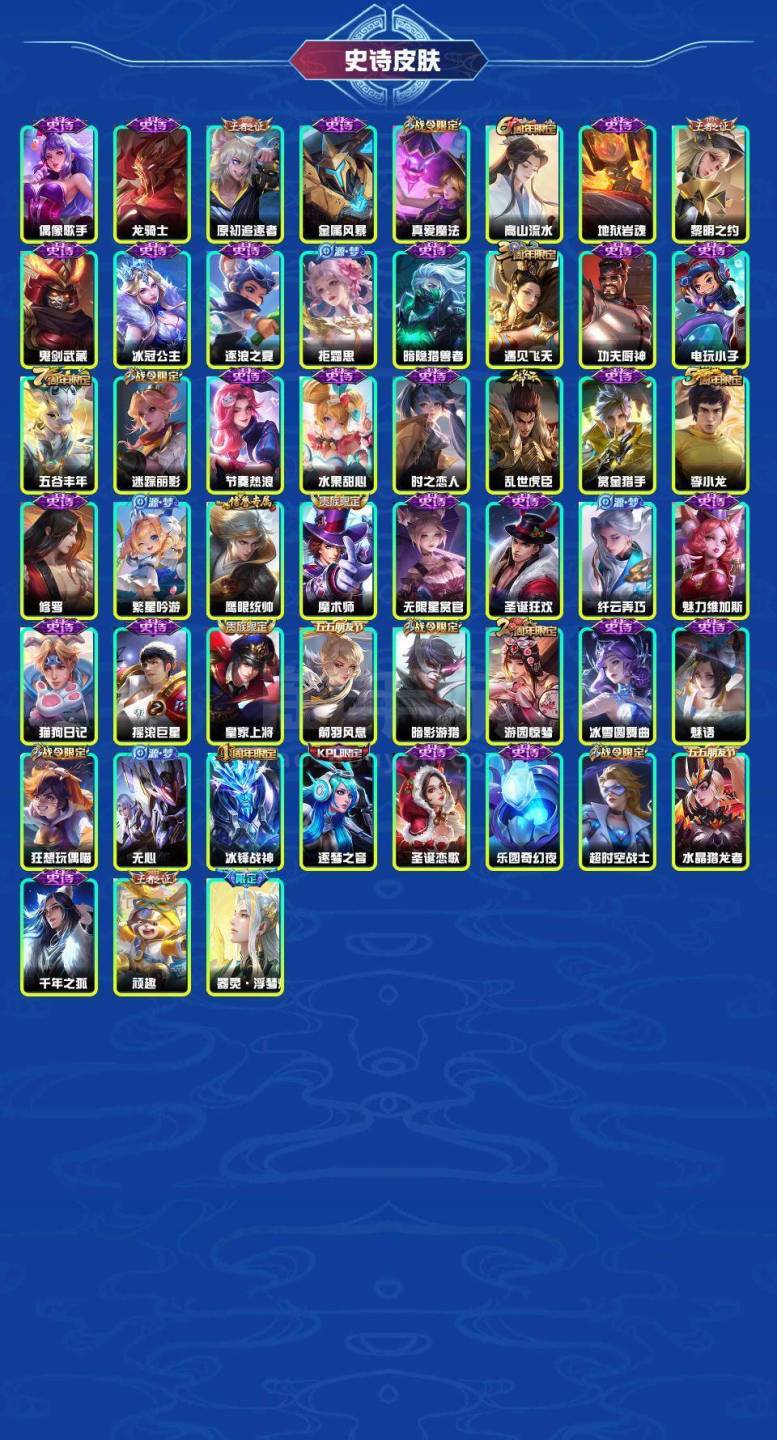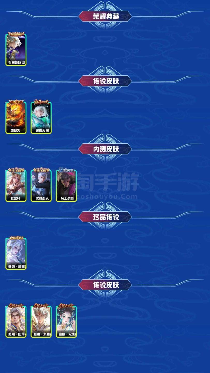 银白咏叹调 地狱火 时雨天司 女武神 优雅恋人 特工战影 器灵·落星盏 愿照·山河定 愿照·九州拓 愿照·众生和 偶像歌手 龙骑士 原初追逐者 金属风暴 真爱魔法 高山流水 地狱岩魂 黎明之约 鬼剑武藏 冰冠公主 逐浪之夏 拒霜思 暗隐猎兽者 遇见飞天 功夫厨神 电玩小子 五谷丰年 迷踪丽影 节奏热浪 水果甜心 时之恋人 乱世虎臣 赏金猎手 李小龙 修罗 繁星吟游 鹰眼统帅 魔术师 无限星赏官 圣