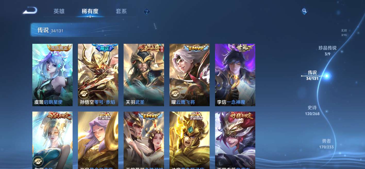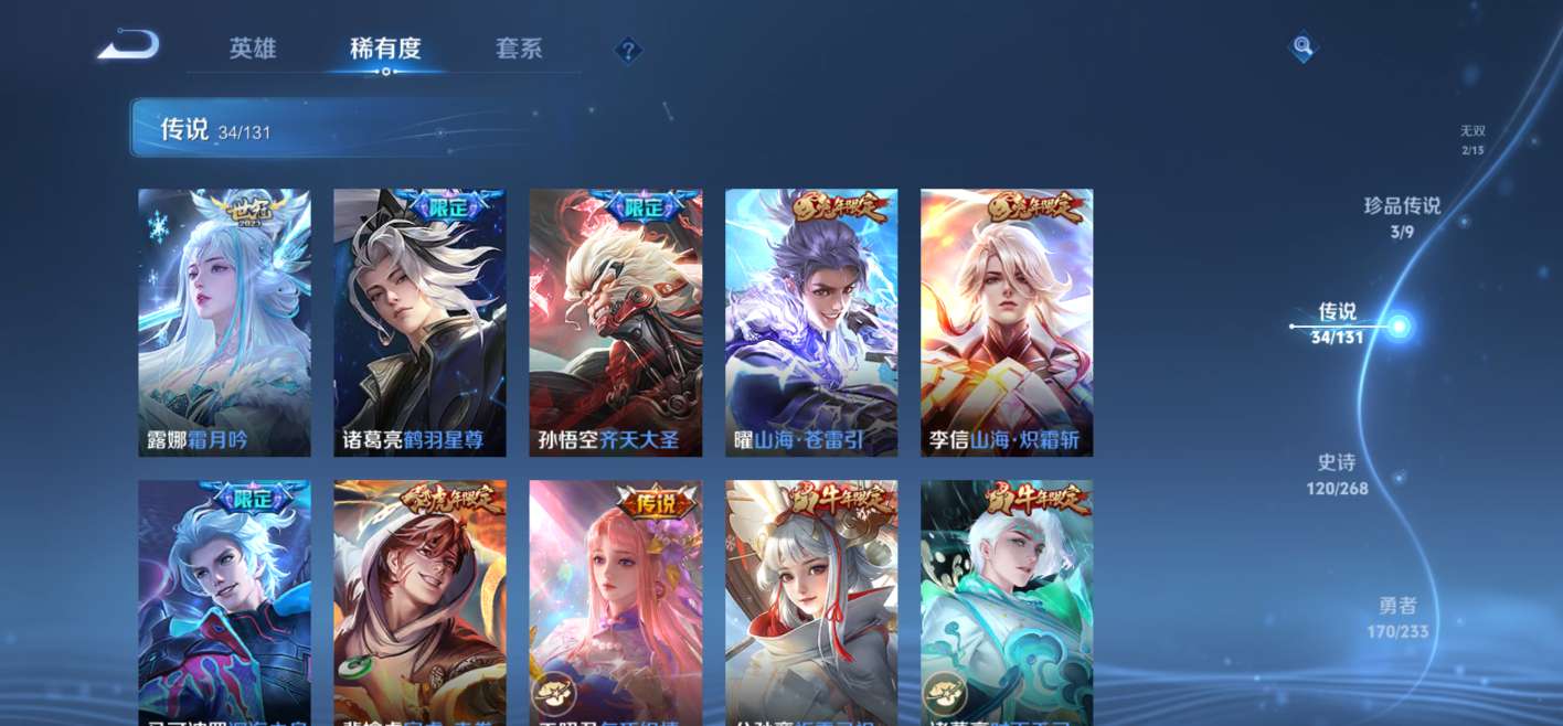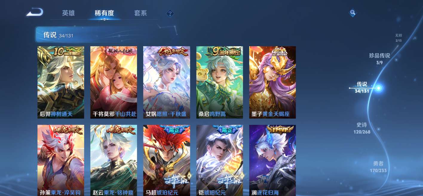 1典藏,2无双,3珍品传说,34传说还有很多史诗皮,1个诸葛亮的天幕