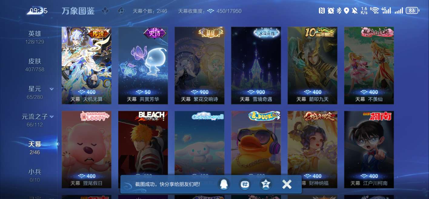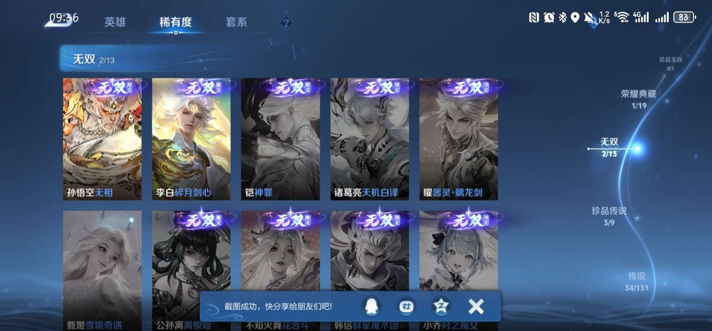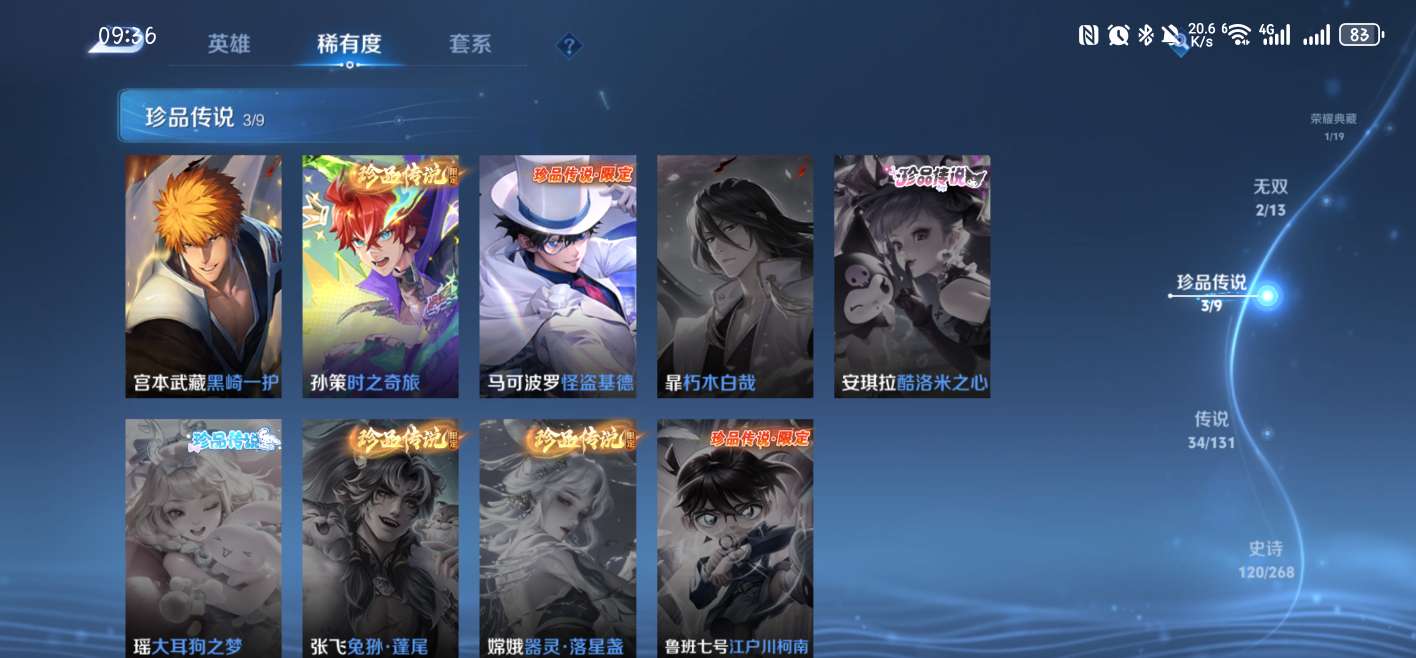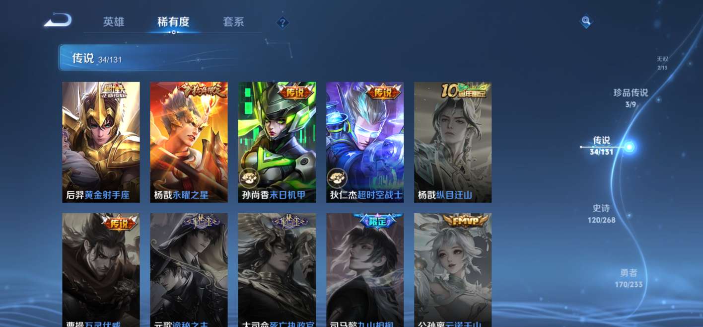 1典藏,2无双,3珍品传说,34传说还有很多史诗皮,1个诸葛亮的天幕
