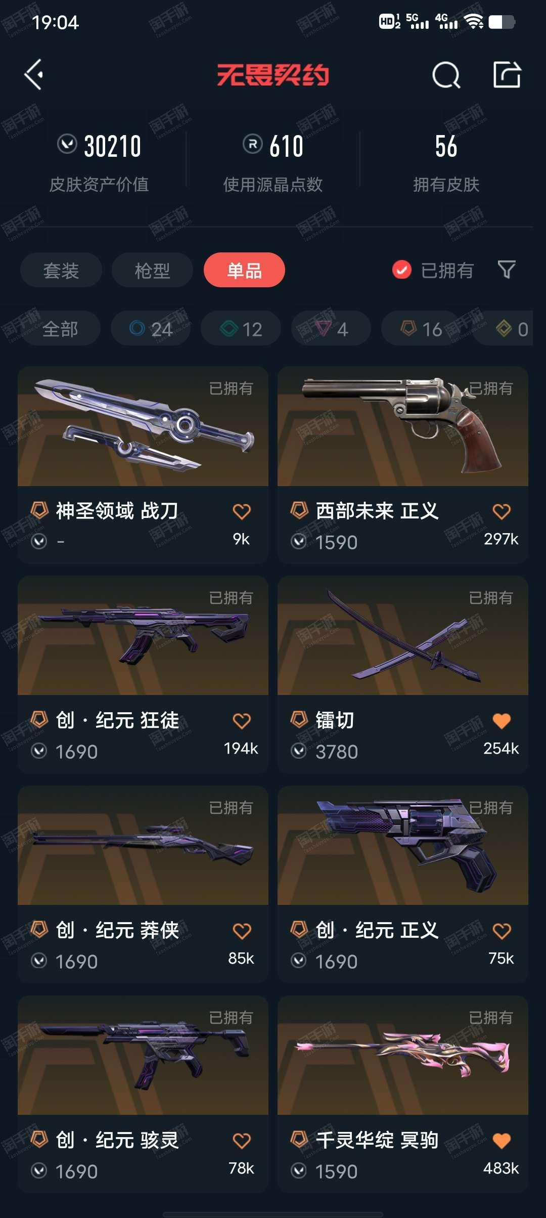 出售无畏契约账号,qq,皮肤如上。16橙皮,4紫皮。皮肤价值30210,价格可刀。