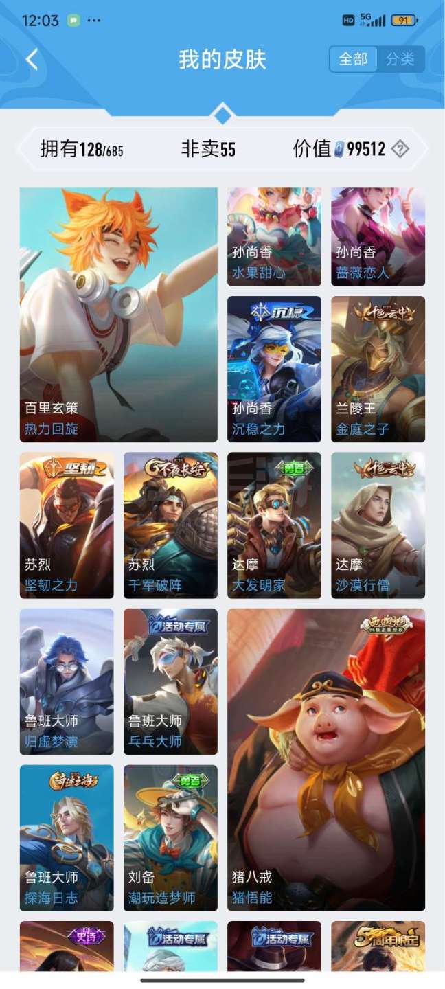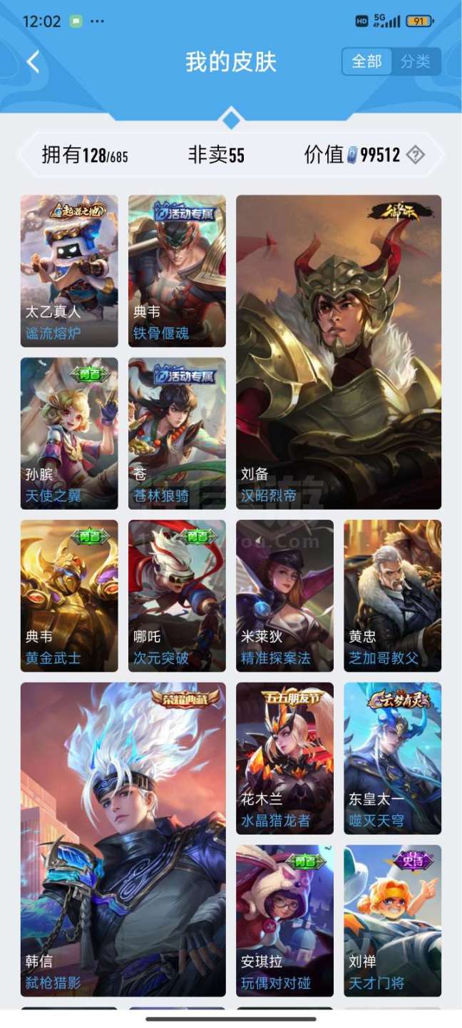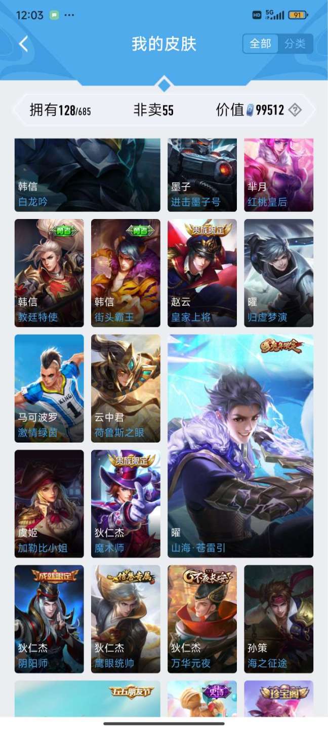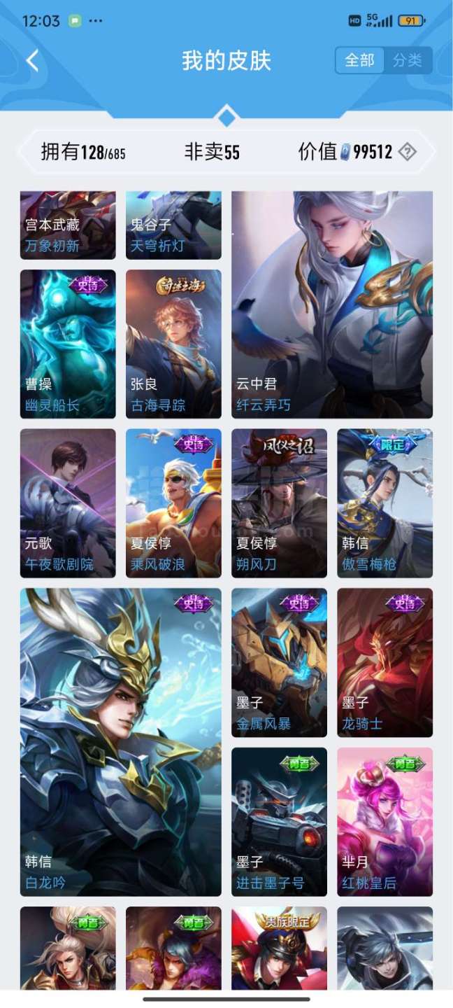 韩信荣耀典藏两限定传说一个普通传说共128皮肤v6差两百块v7和平精英连体号有个广东省省标
