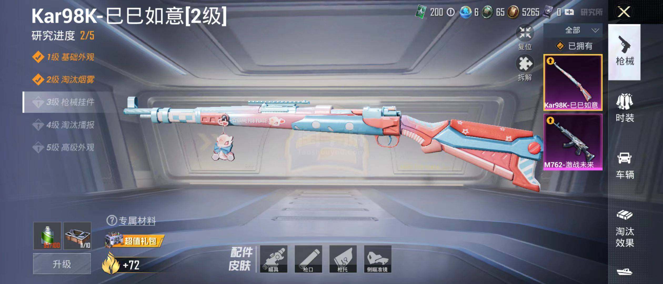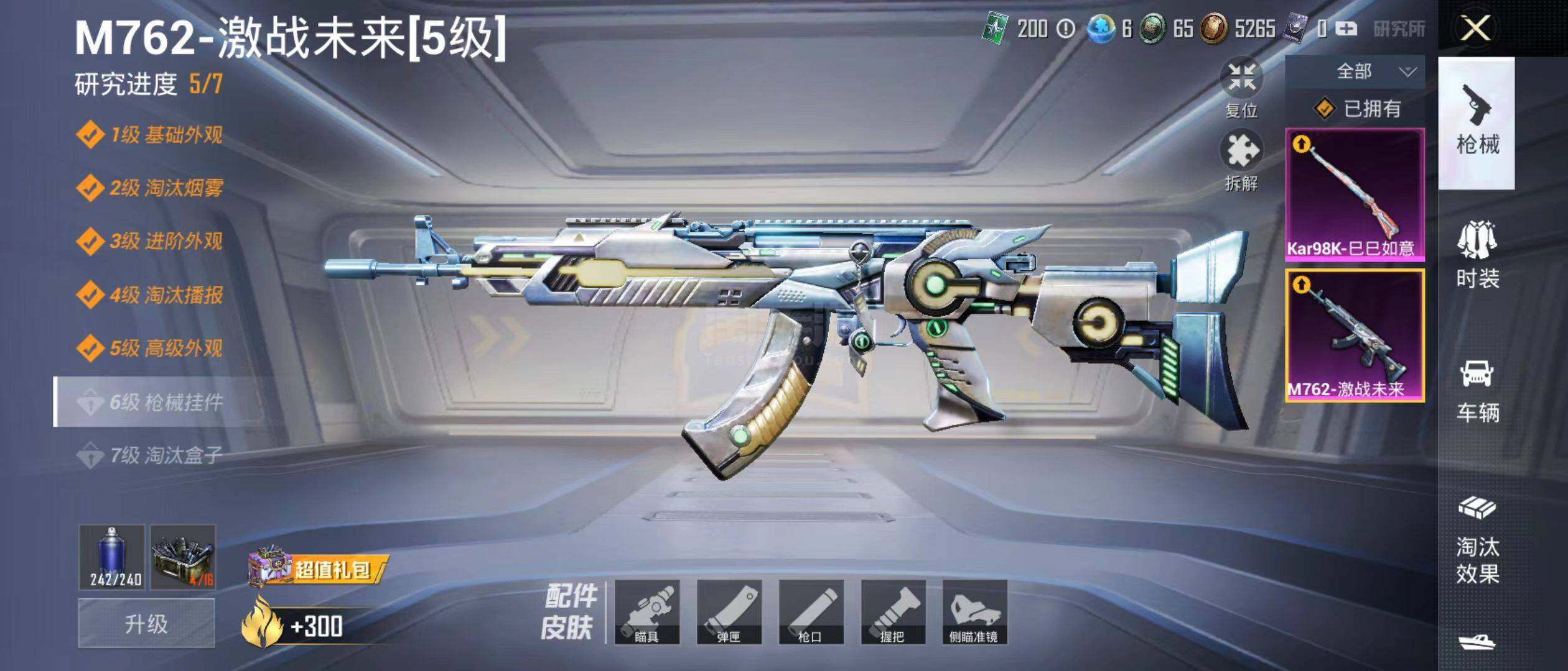 【特效枪等级】:M762-激战未来(五级M762-激战未来),Kar98K-巳巳如意(二级Kar98K-巳巳如意)