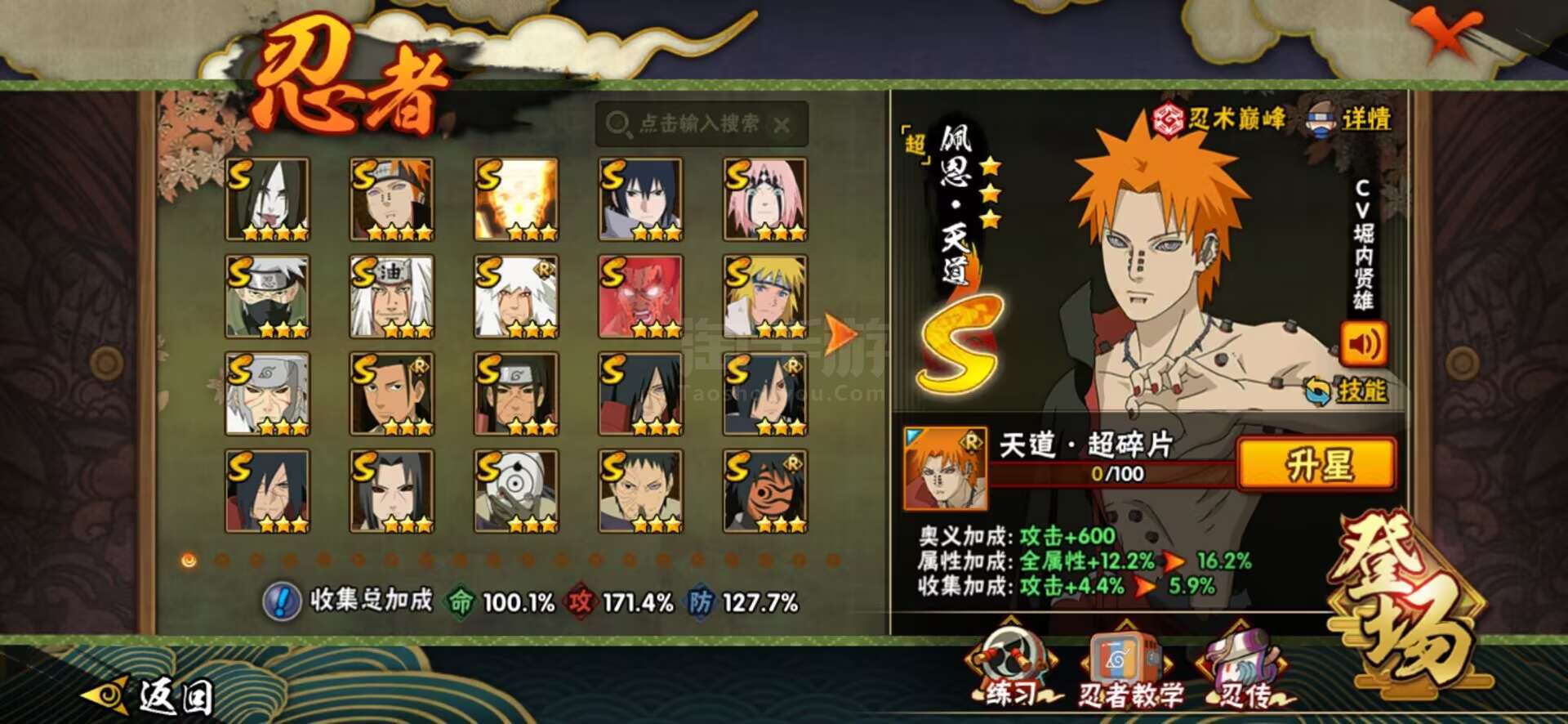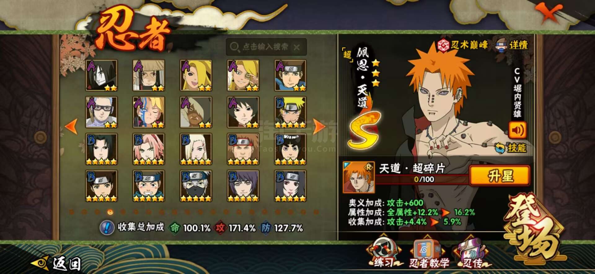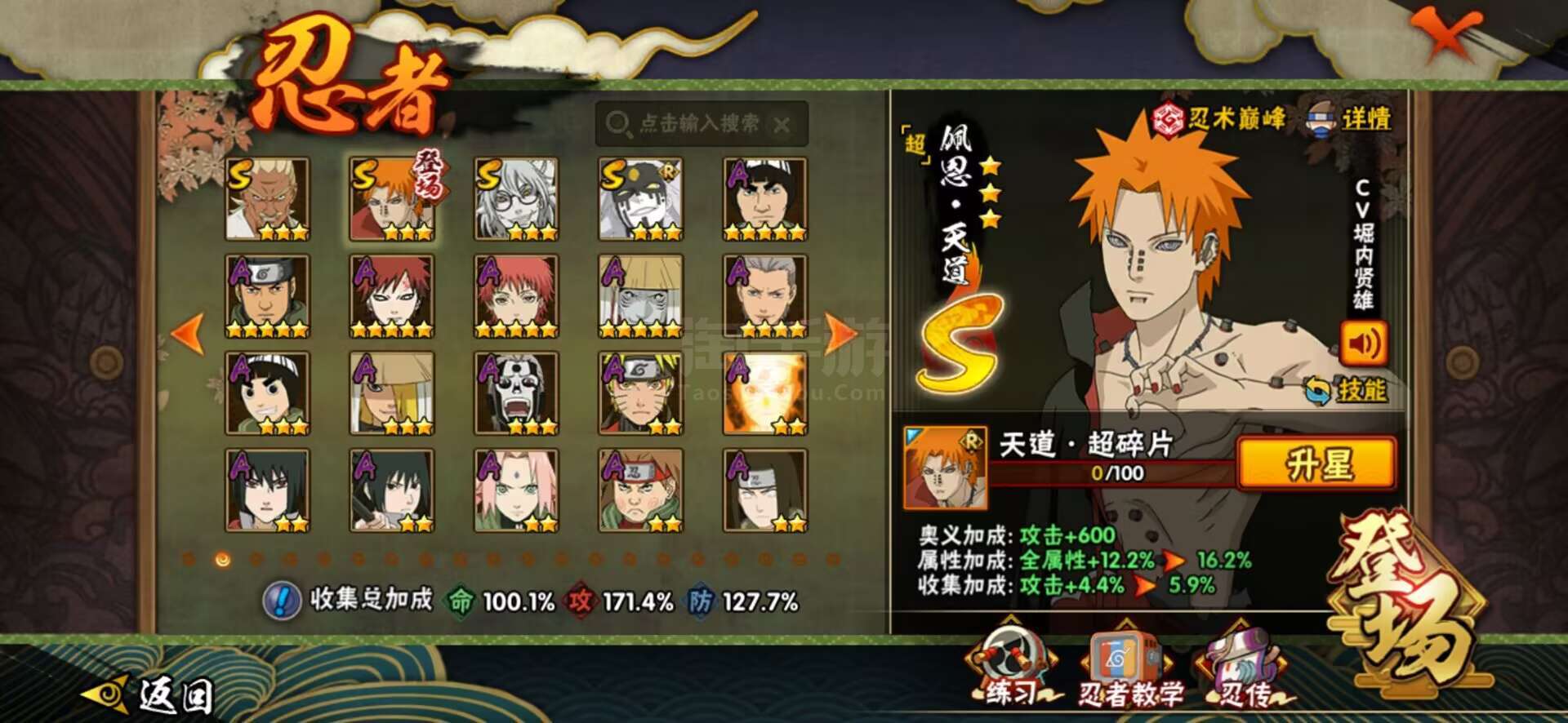 【S级忍者】:千手扉间「秽土转生」(3星千手扉间「秽土转生」),千手柱间「秽土转生」(3星千手柱间「秽土转生」),宇智波鼬「秽土转生」(3星宇智波鼬「秽土转生」),宇智波斑「秽土转生」(3星宇智波斑「秽土转生」),宇智波斑「秽土转生·解」(3星宇智波斑「秽土转生·解」),春野樱「忍界大战」(3星春野樱「忍界大战」),宇智波带土「
