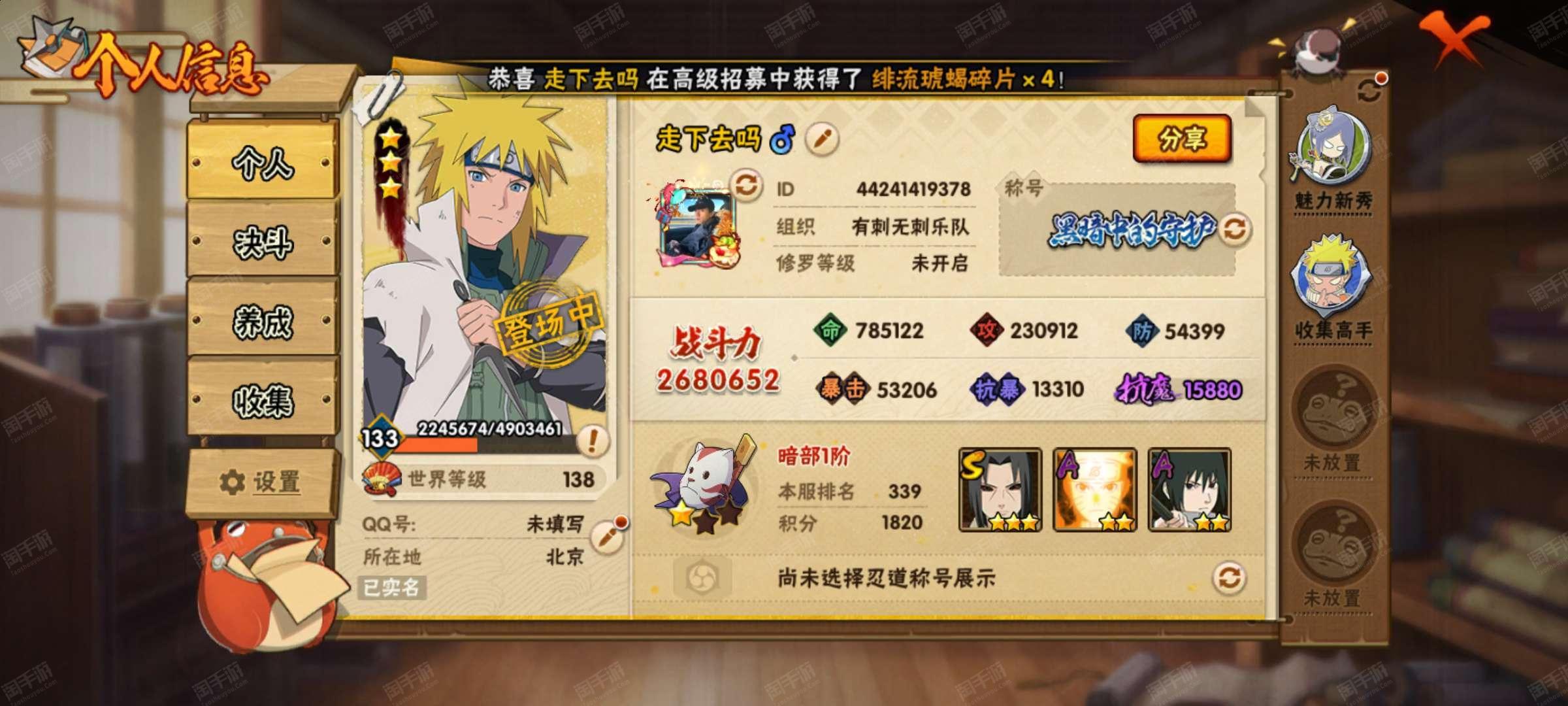 火影忍者【安卓QQ】秽土鼬号,绯流琥蝎首付50已付!A忍金鸣骨架黑土奇拉比,s忍佩恩还可以拿,战力还可以提一波