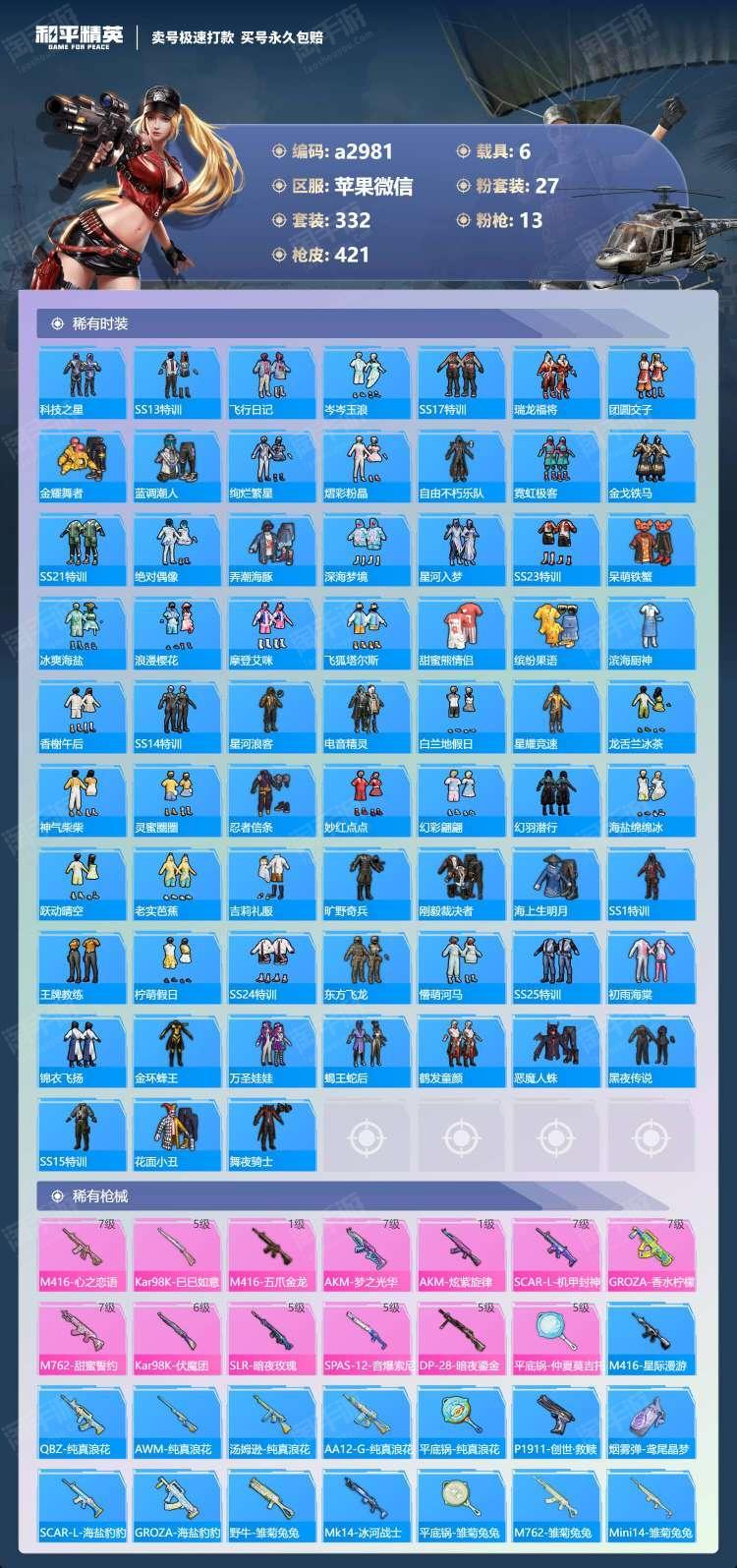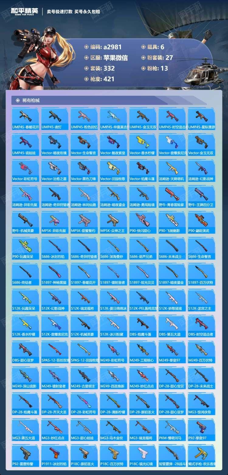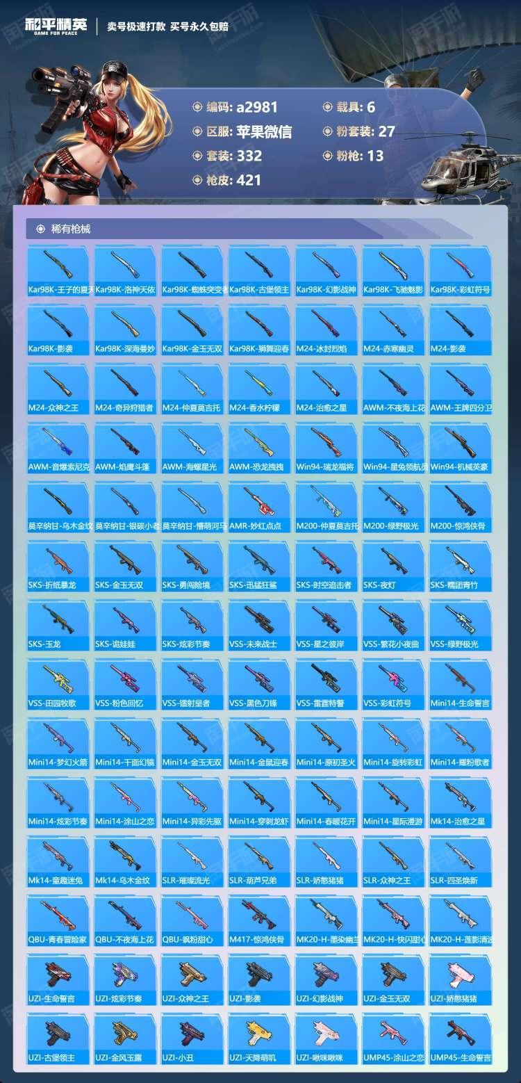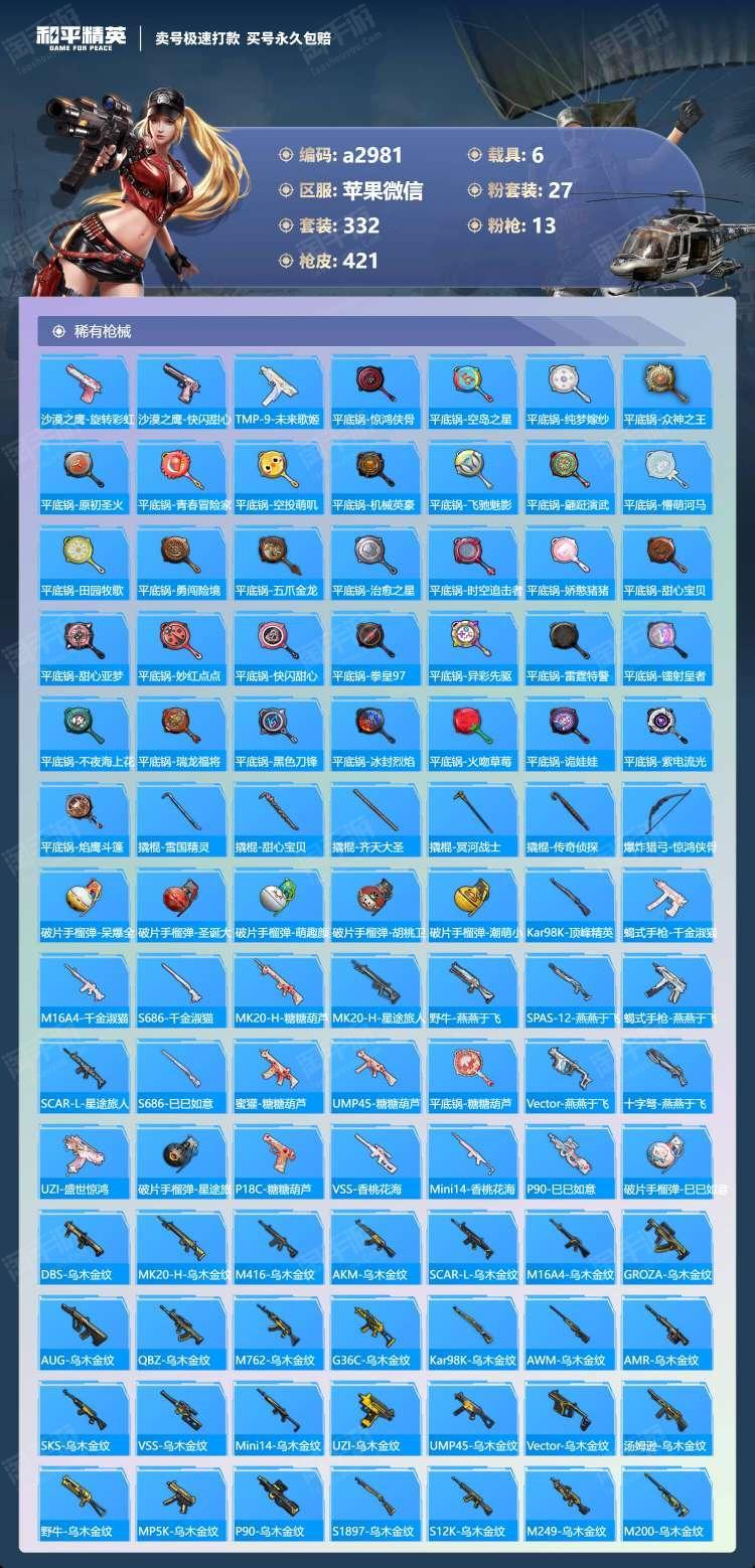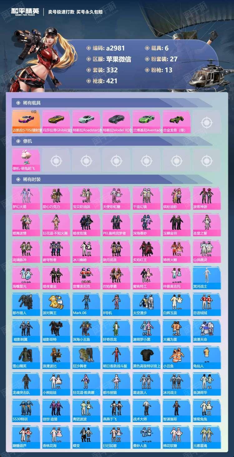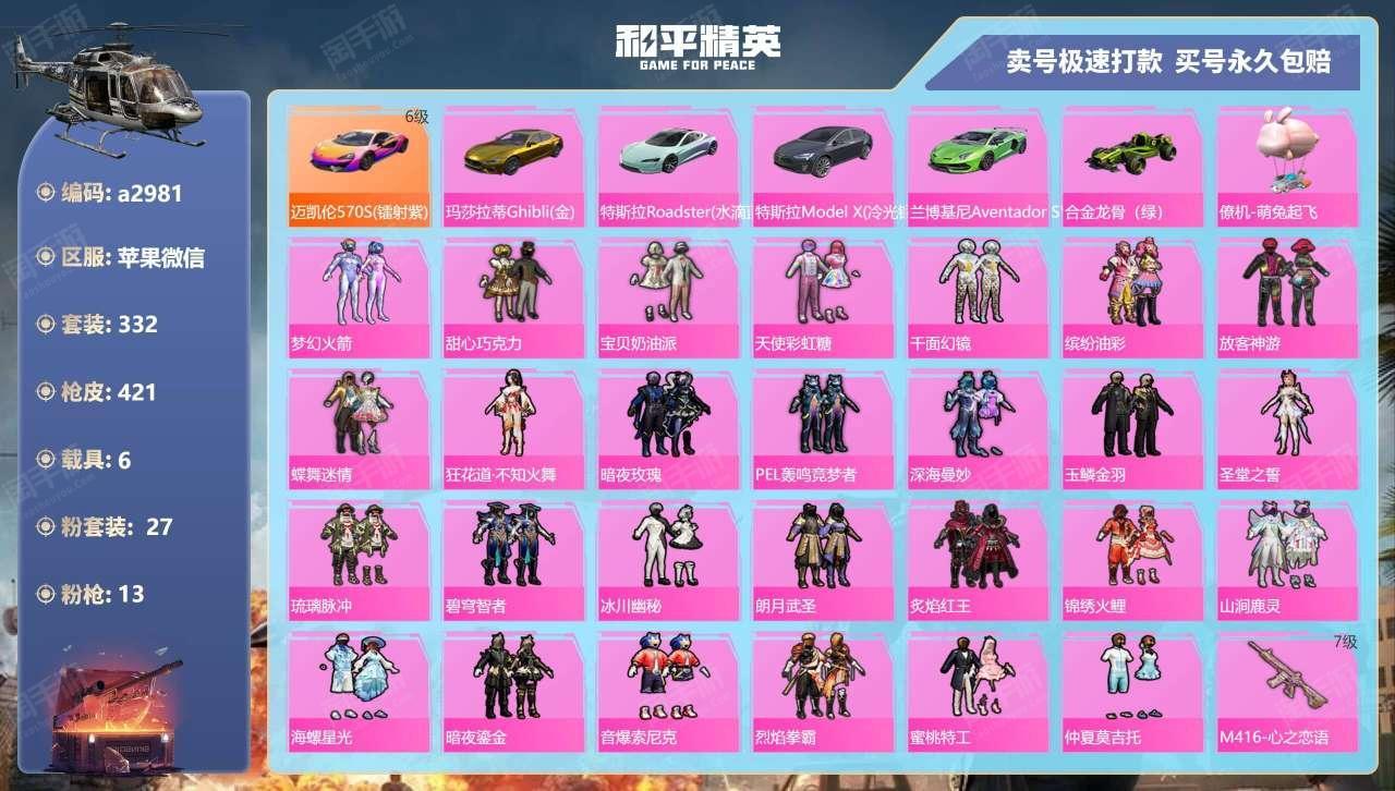和平精英【苹果微信】a2981/苹果微/热门套装/满级迈凯伦/-28王牌印记-27粉装-13特效枪-6载具-16722