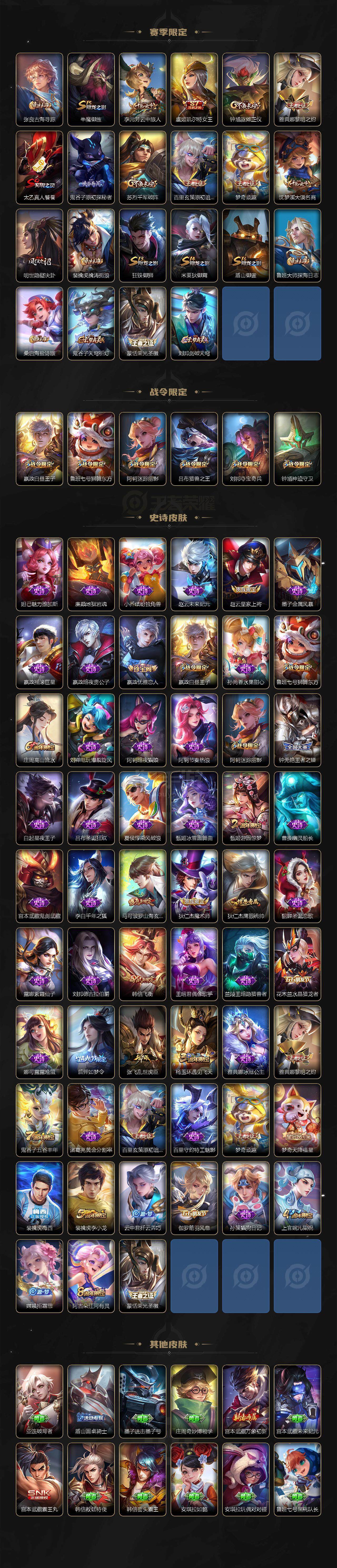 【限定皮肤】:白起狰,狄仁杰阴阳师,虞姬凯尔特女王,赵云皇家上将,嬴政优雅恋人,嬴政白