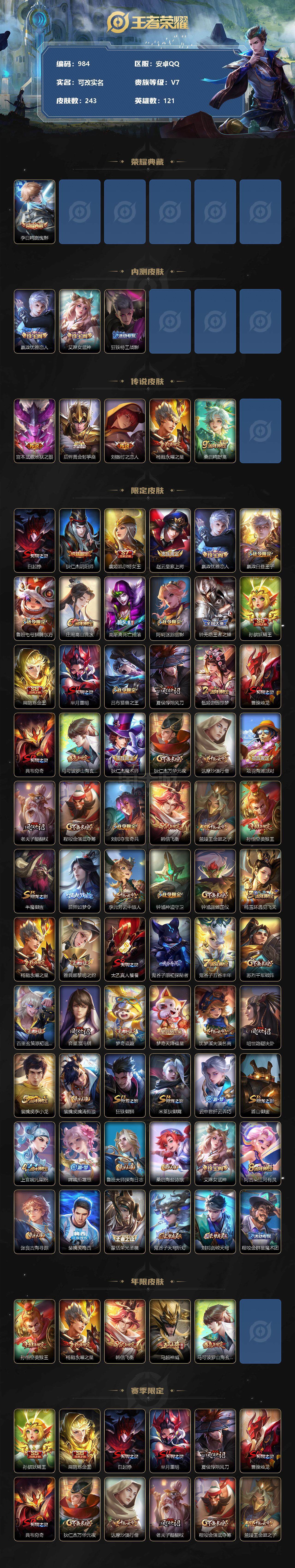 【商品标题】:安卓Q-V7-最强王者段位-121英雄-243皮肤-1典藏-0无