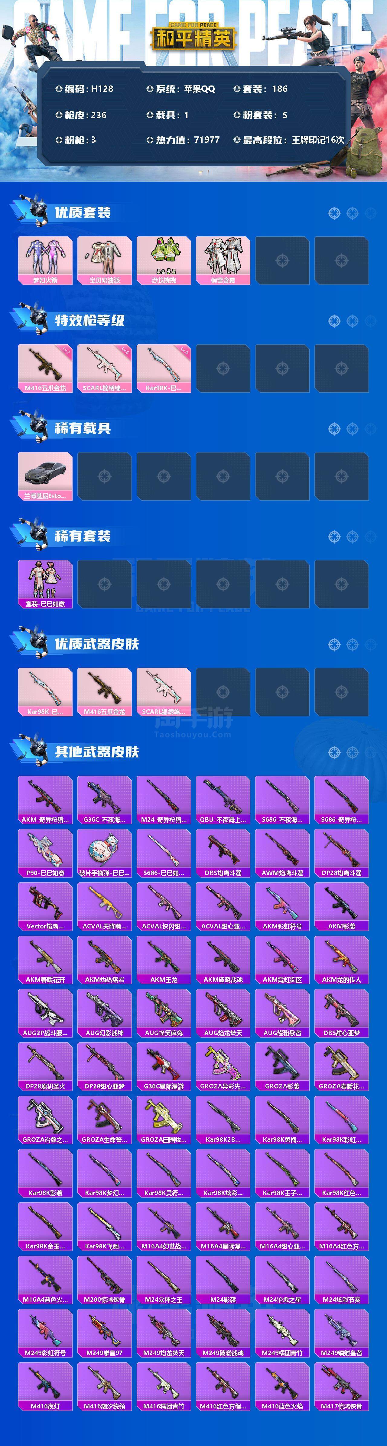 【H10213】【商品标题】:苹果 手Q-5粉装-3特效枪-1载具-71977热力值-0印记-186套装-236枪皮