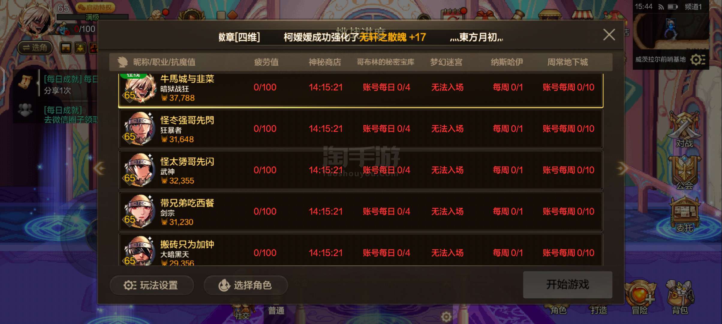 DNF手游【安卓微信】阿甘左区3.7剑圣,卢克西区3.6剑圣,歌兰蒂斯3.7狂战,凯丽3.1漫游,想玩哪区玩哪区