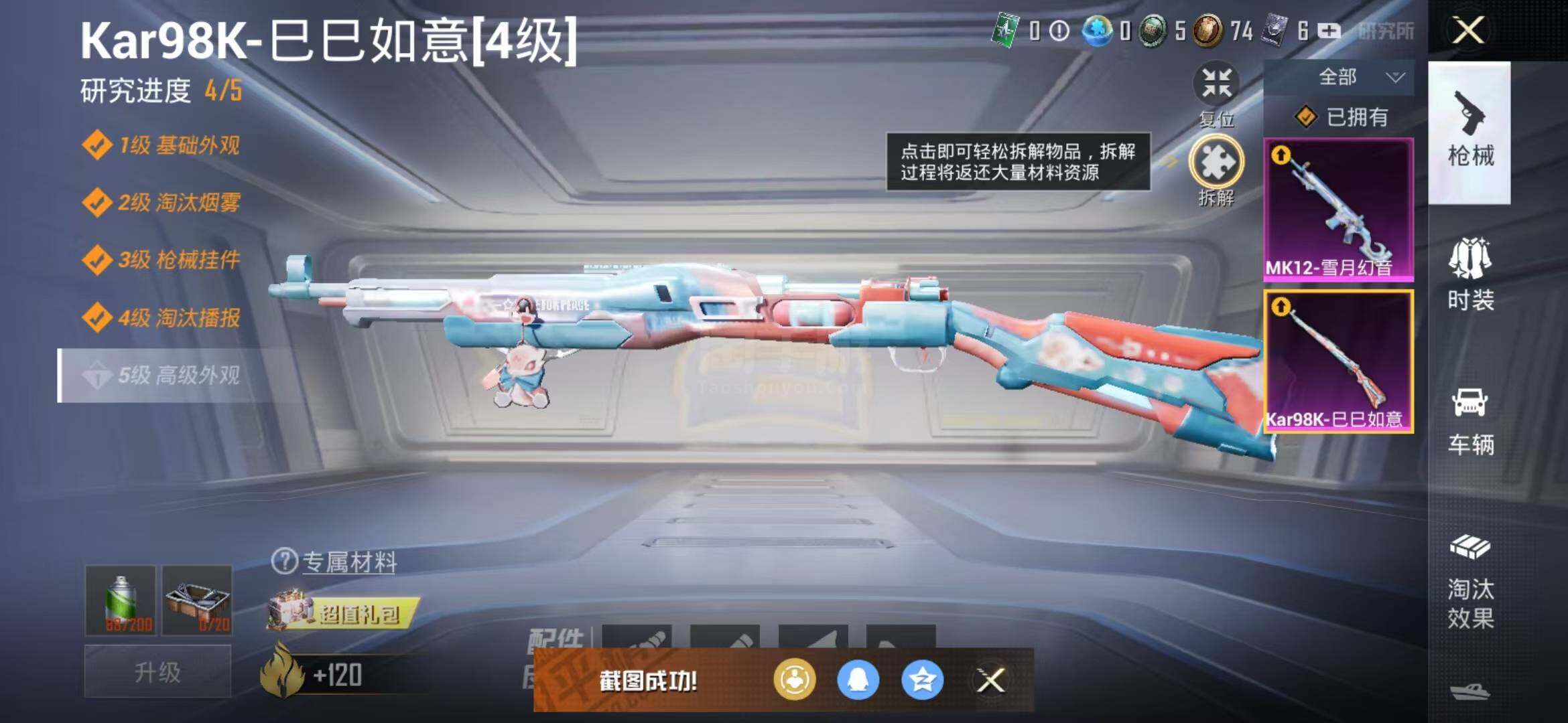 【特效枪等级】:Kar98K-巳巳如意(四级Kar98K-巳巳如意),MK12-雪月幻音(四级MK12-雪月幻音)
