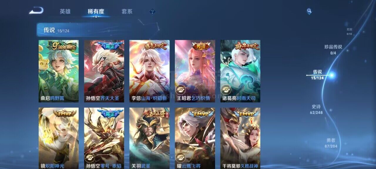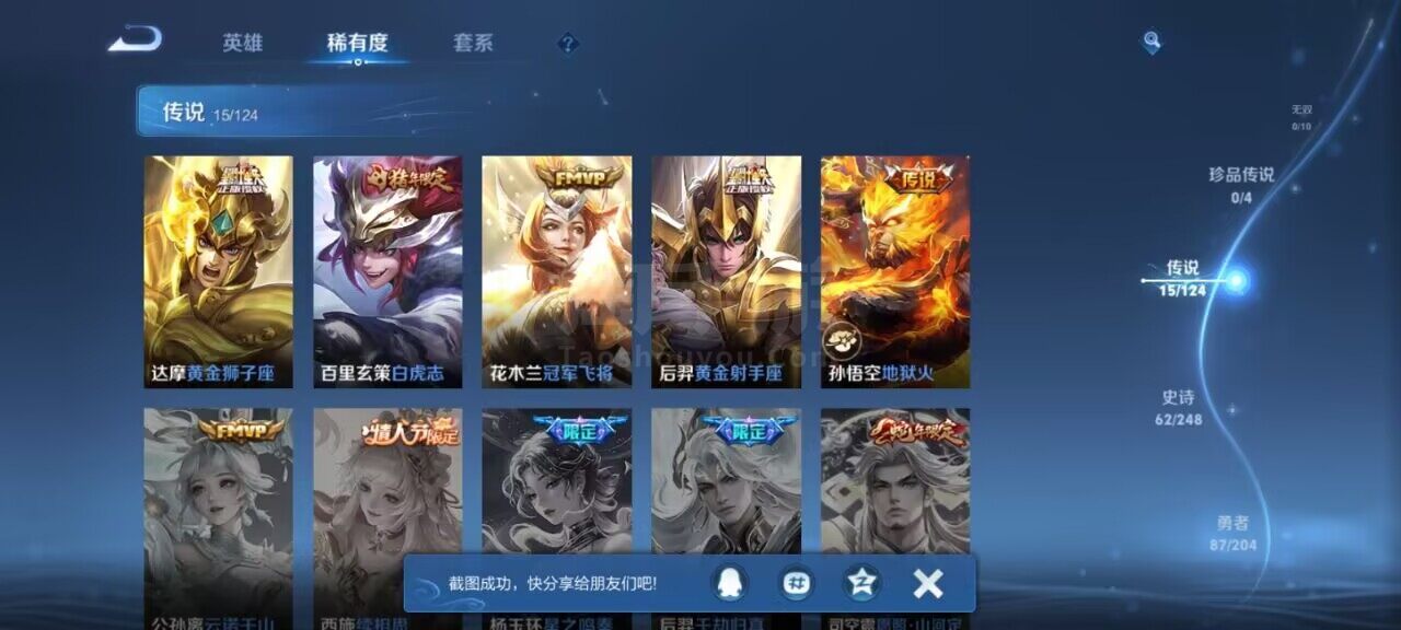 【传说皮肤】:达摩黄金狮子座,关羽武圣,花木兰冠军飞将,孙悟空地狱火,孙悟空零号赤焰,孙悟空齐天大圣,后羿黄金射手座,干将莫邪久胜战神,诸葛亮时雨天司,百里玄策白虎志,李信山海炽霜斩,曜云鹰