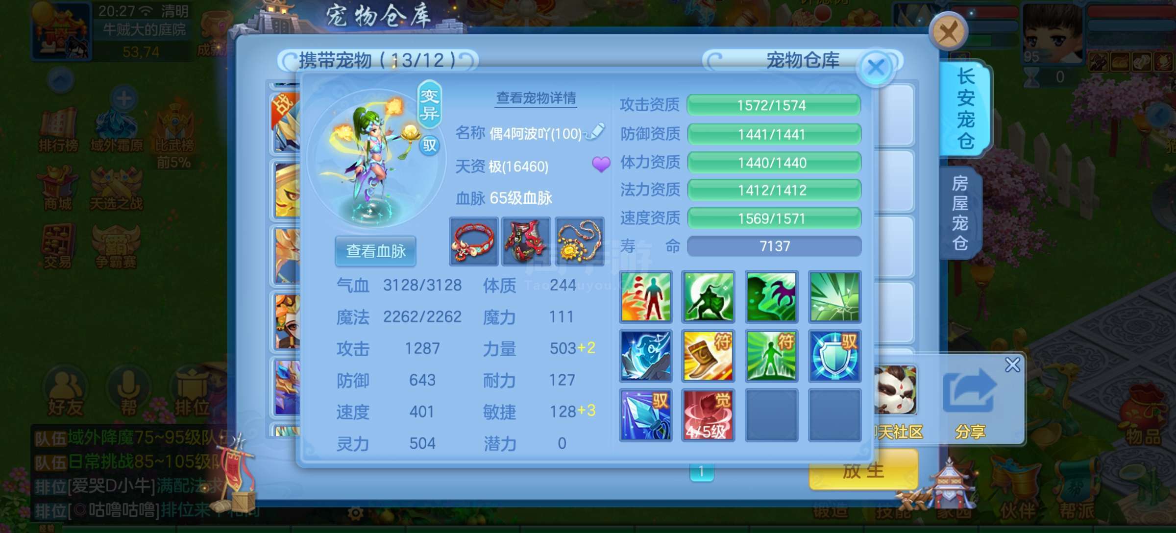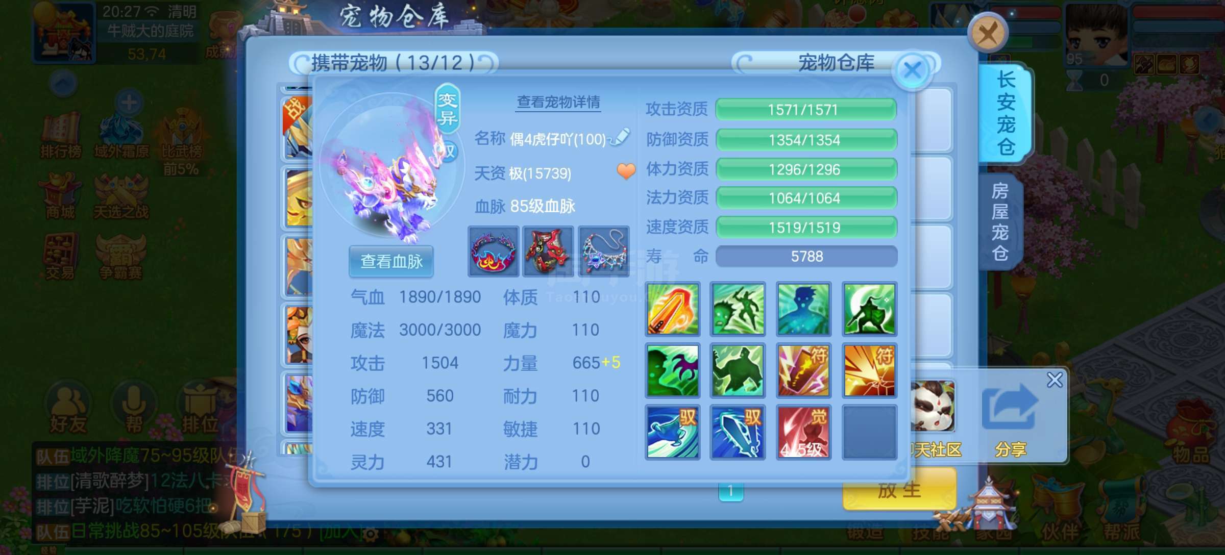5技能玉龙,两个高级皮肤宝宝,95满技能宝宝3个。