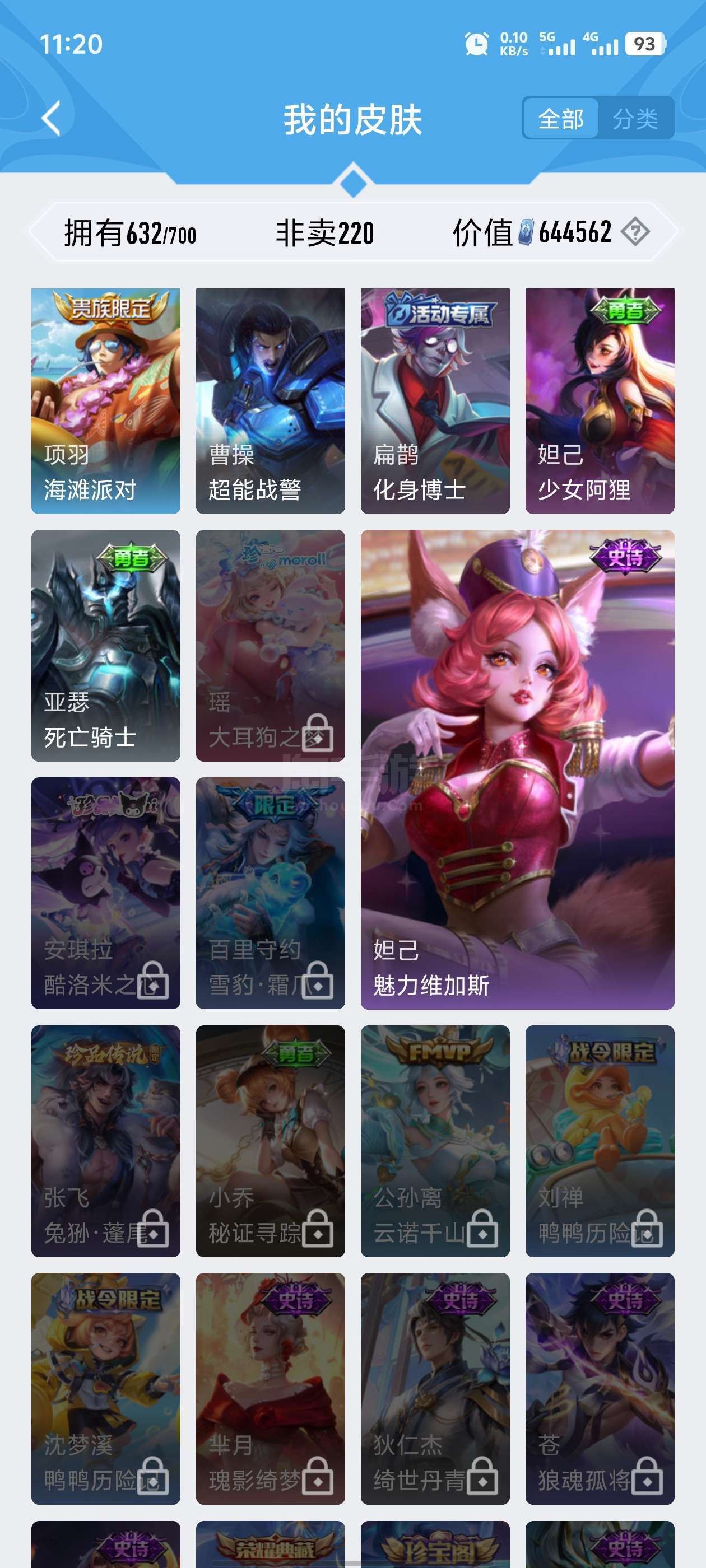 王者荣耀【安卓QQ】贵族10有天幕,传说皮肤很多,全无双皮,有很多金标银标