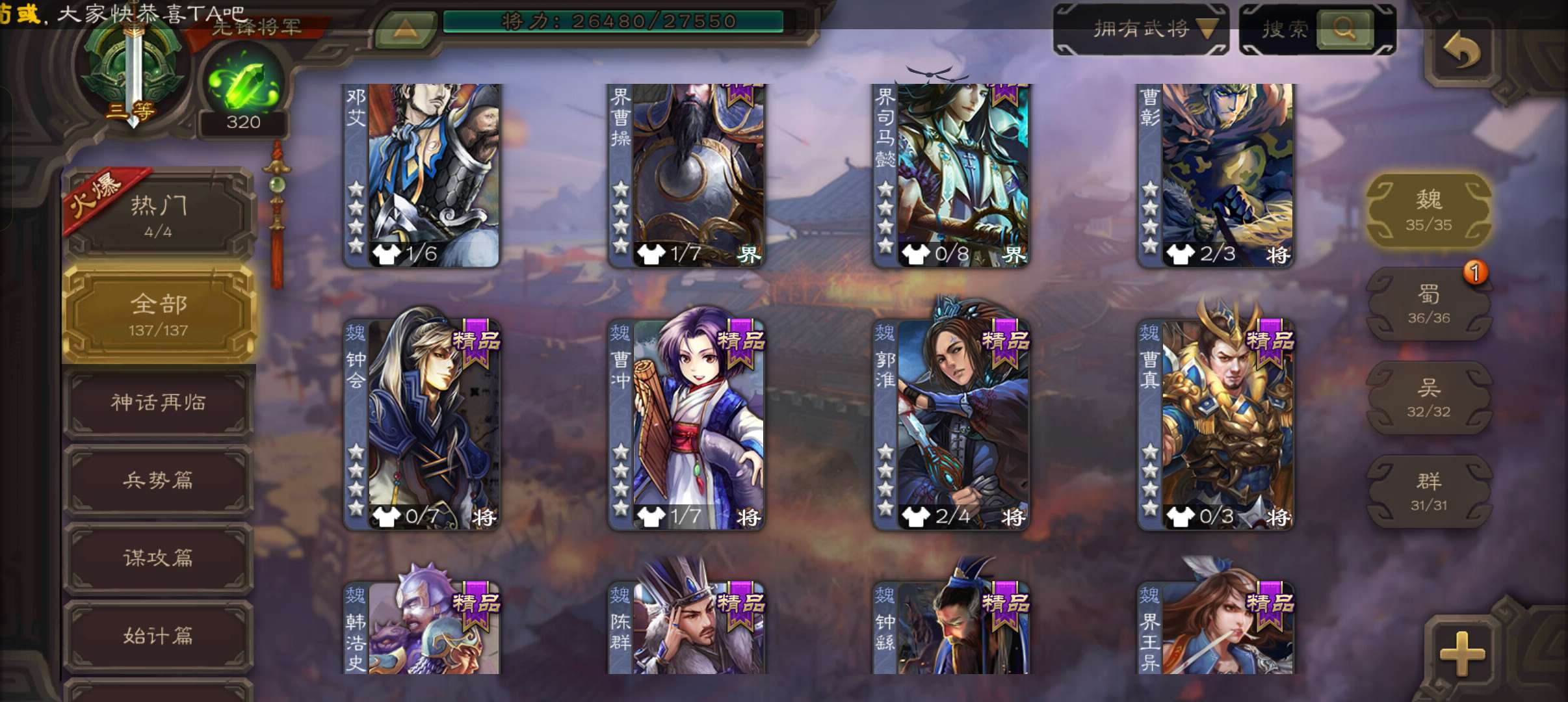 5史诗3神先锋,5万豆,回廊动白马戏志才神刘备谯周马云騄,金皮神周瑜神吕蒙动谋小乔桥公甘夫人137将