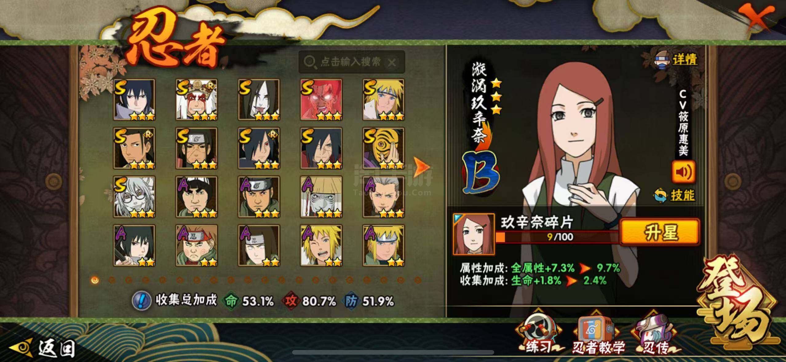 【S级忍者】:千手柱间「秽土转生」(3星),宇智波斑「秽土转生·解」(3星),宇智波斑「木叶创立」(3星),千手柱间「木叶创立」(3星),自来也「舞之豪杰」(3星),大蛇丸(3星),波风水门(3星),药师兜「仙人模式」(3星),神秘面具男(3星),迈特凯「死门」(3星),宇智波佐助「永恒万花筒」(3星)
