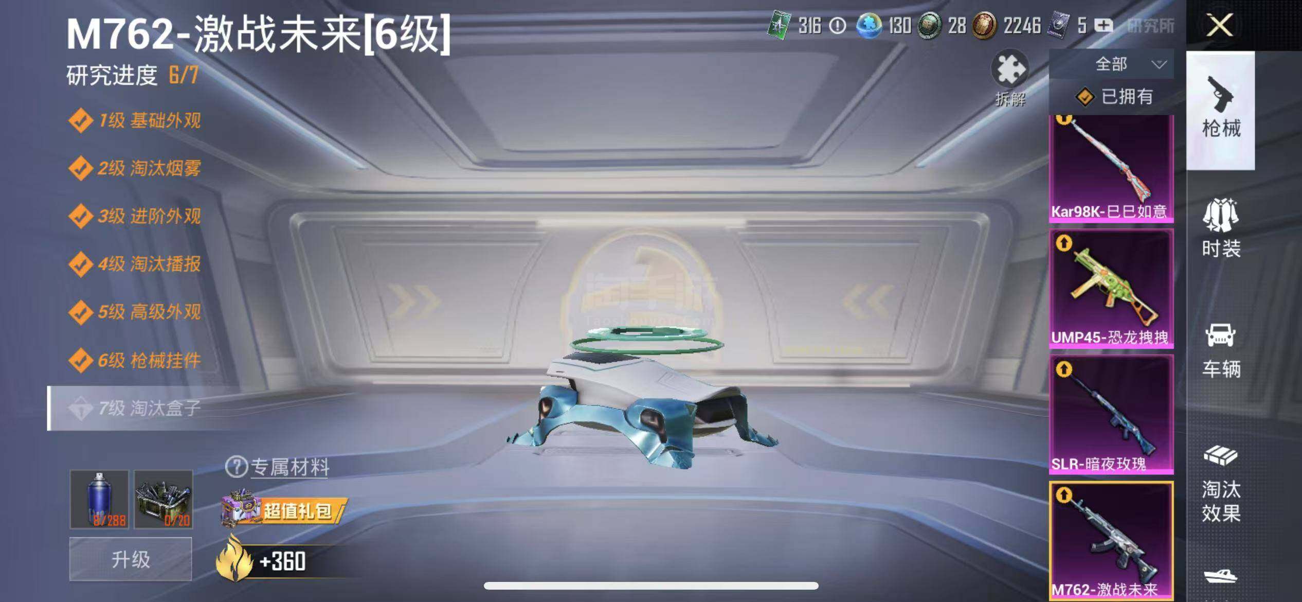 【特效枪等级】:M762-激战未来(六级),UMP45-恐龙拽拽(四级),Kar98K-巳巳如意(四级),SLR-暗夜玫瑰(三级)