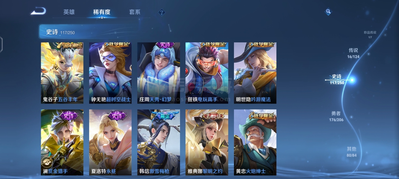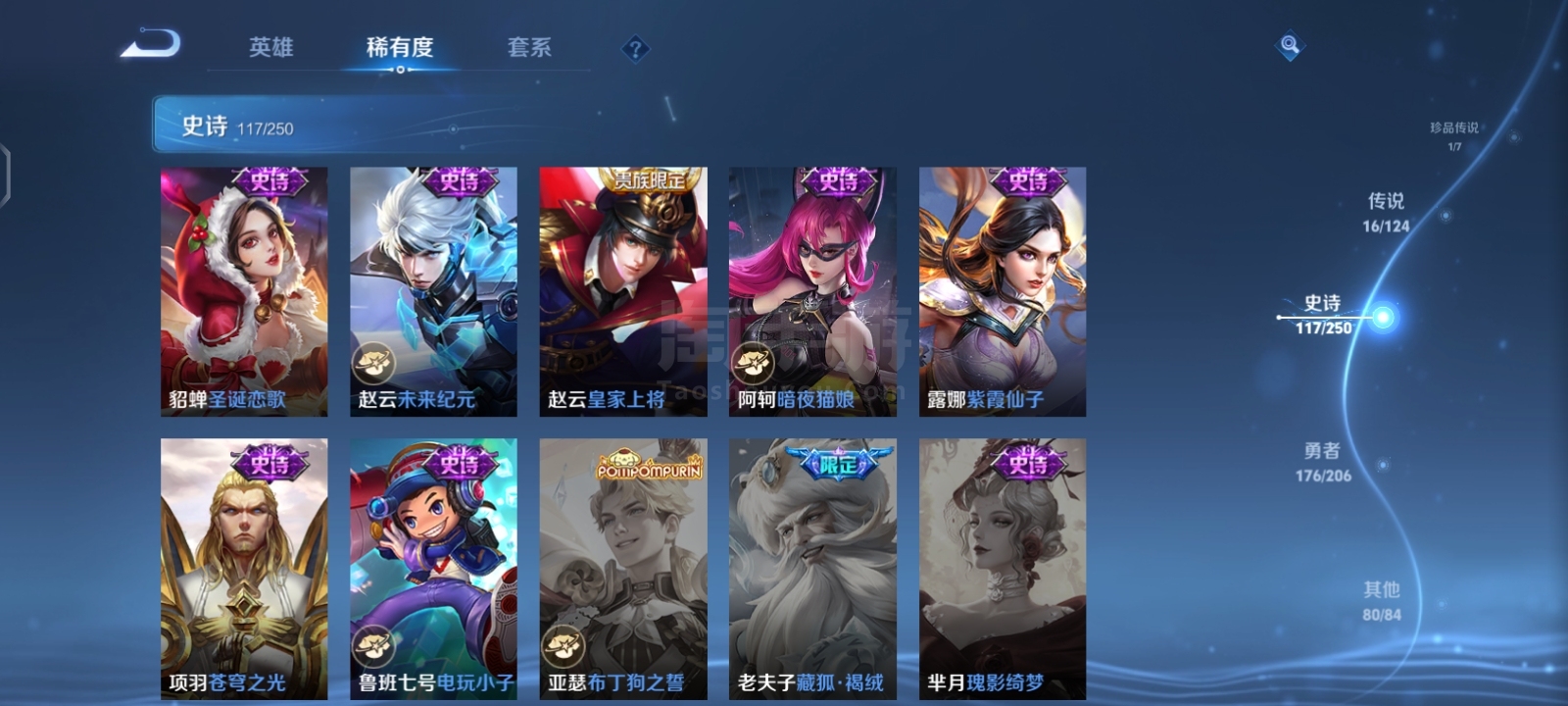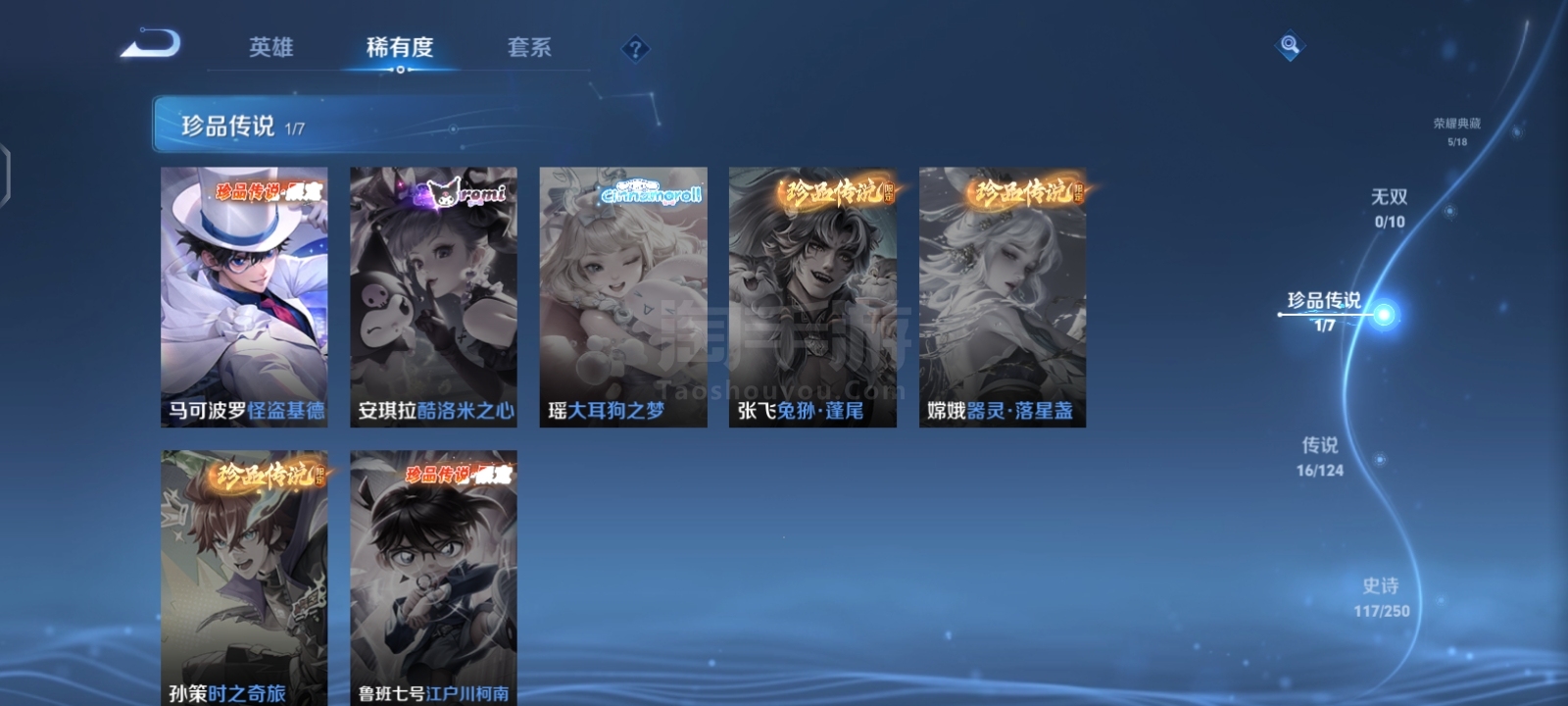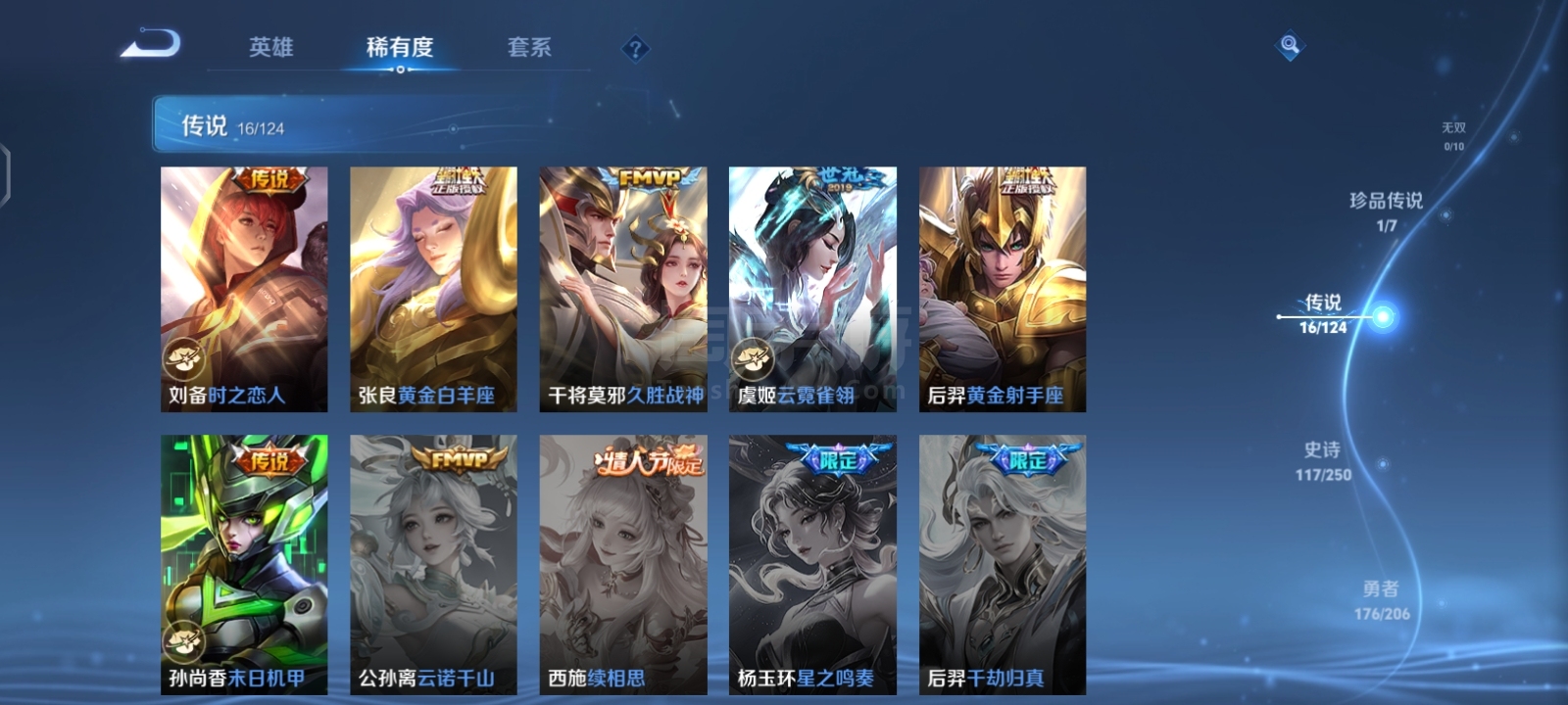 贵9,6典藏1珍品16传说,满英雄,满铭文,16印记历史荣耀,赏金已开,很多个星史诗,紫星币,可二次