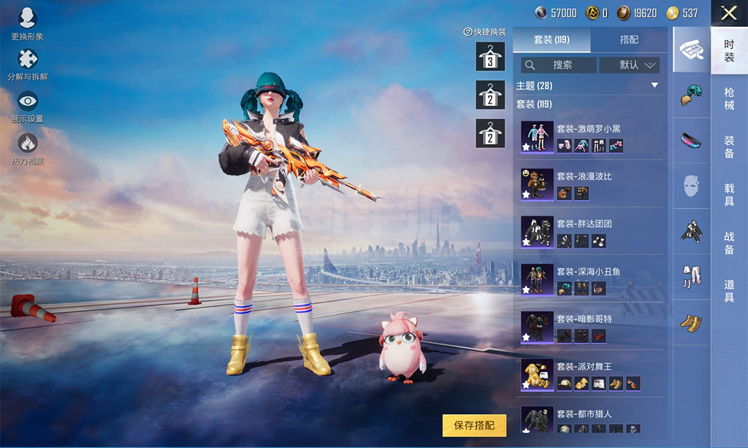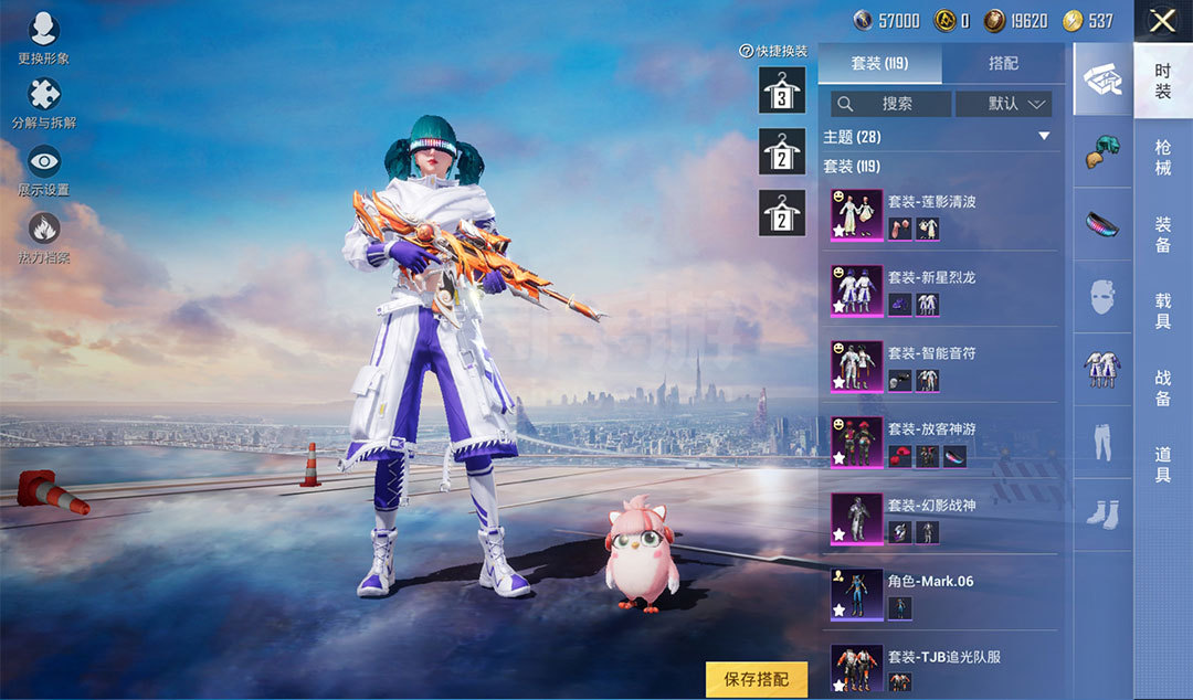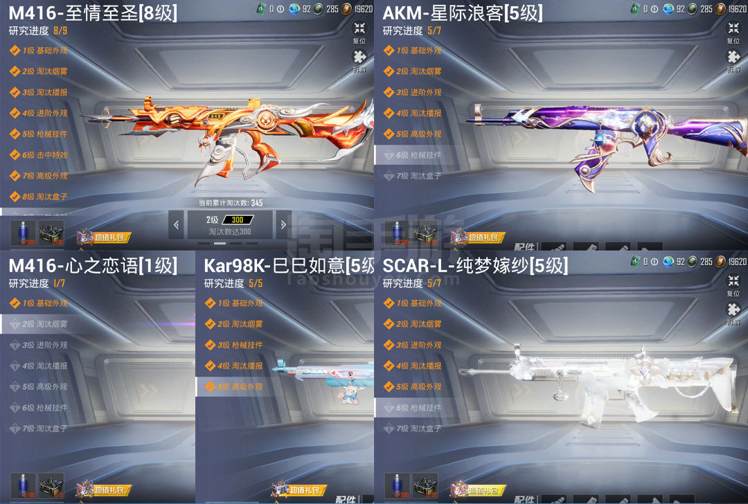 特效枪5:M416-至情至圣8级,M416-心之恋语1级,AKM-星际浪客5级,SCAR-L-纯梦嫁莎5级,Kar98k-巳巳如意5级