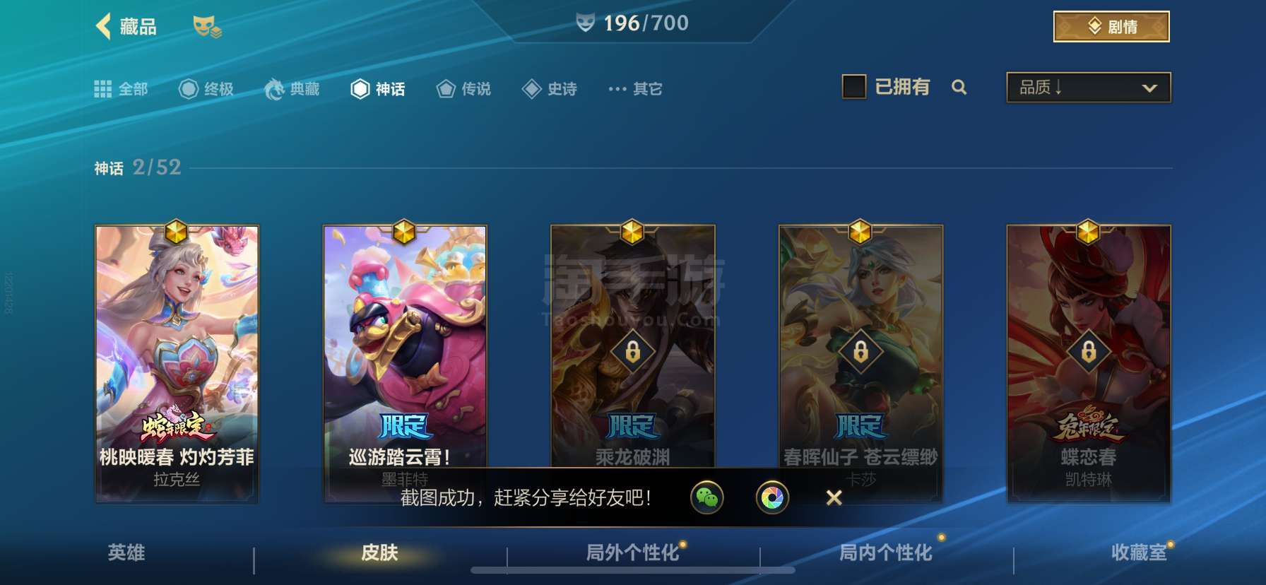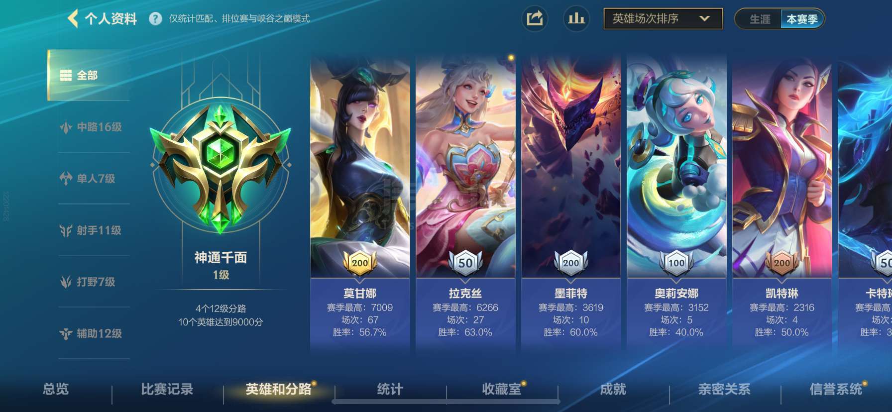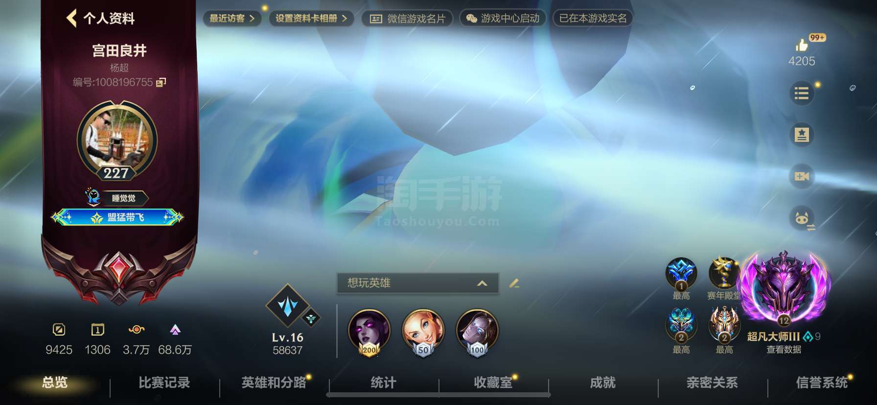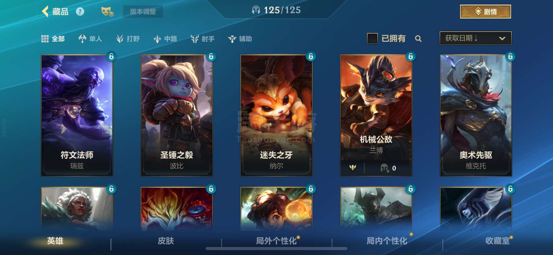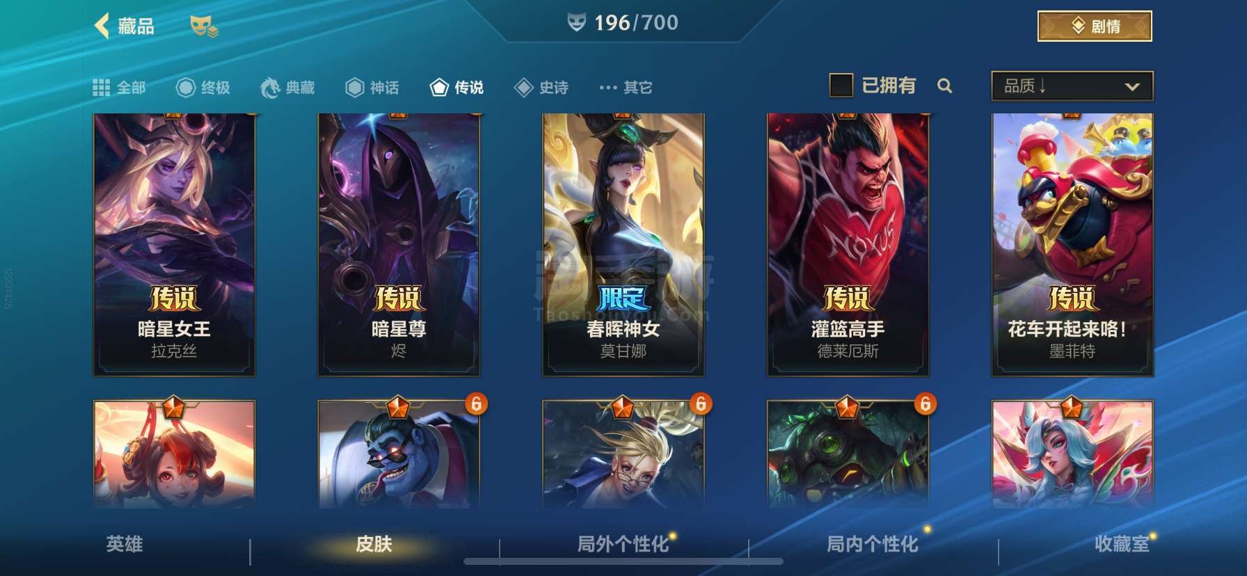 私人号,打了好几年了,不晓得花了好多钱,基本上出皮肤都会抽一两个,最高段位王者,这个赛季大师