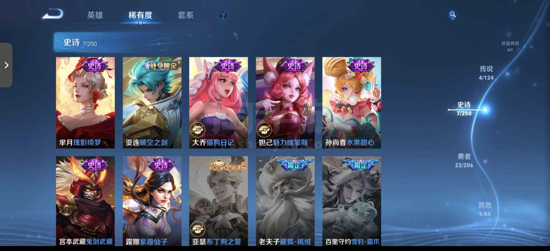 云缨幻光神枪 澜蛇限 西施FMVP 露娜紫霞仙子 宫本鬼剑武藏 还有一百多皮肤碎片 历史荣耀 云缨万战国50