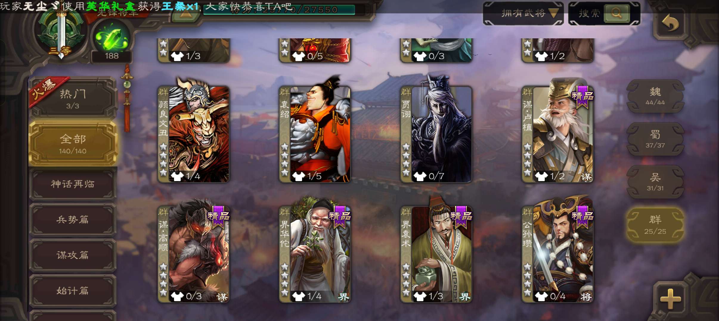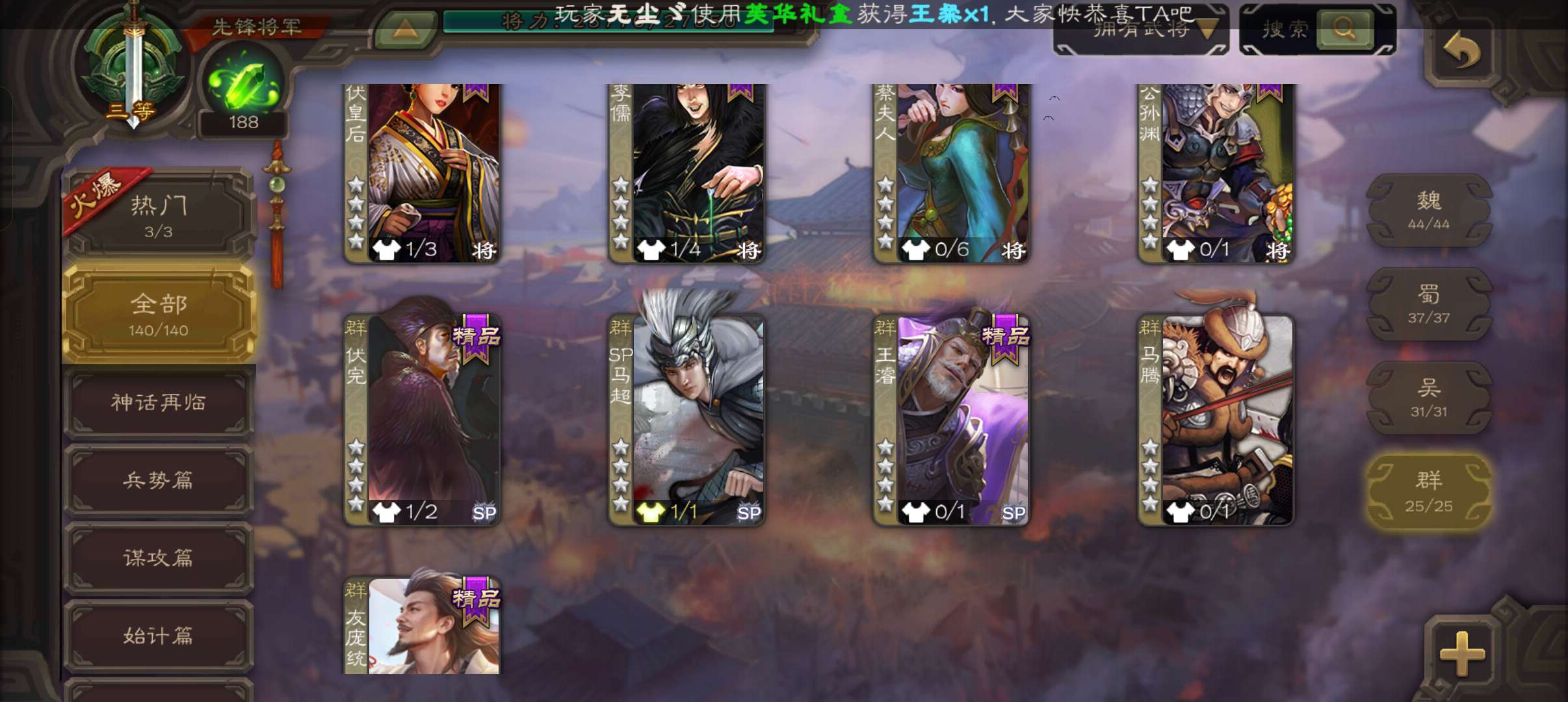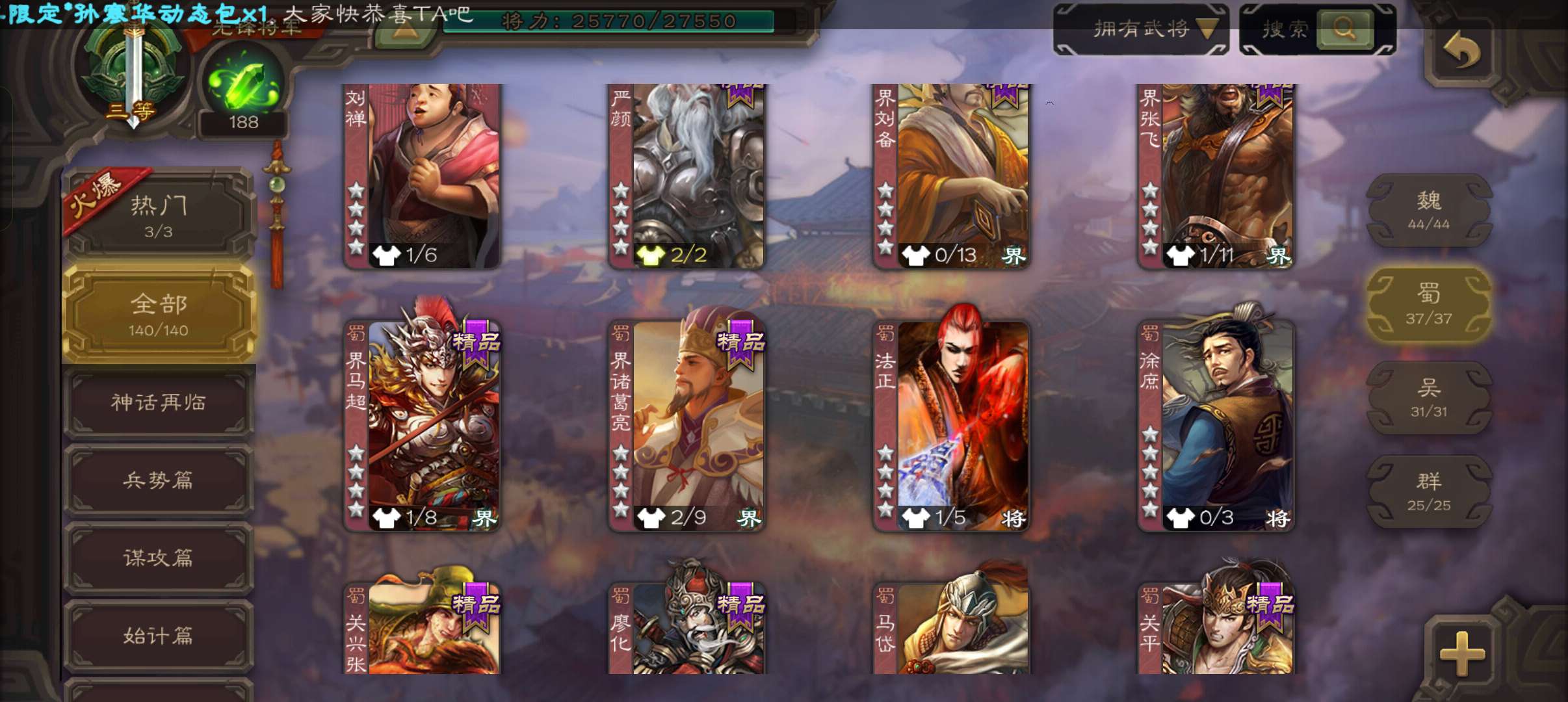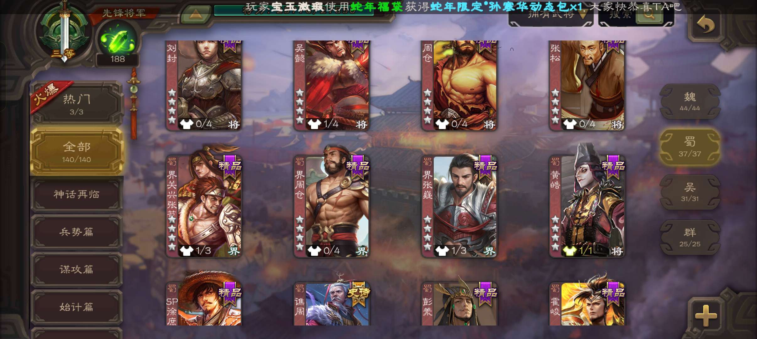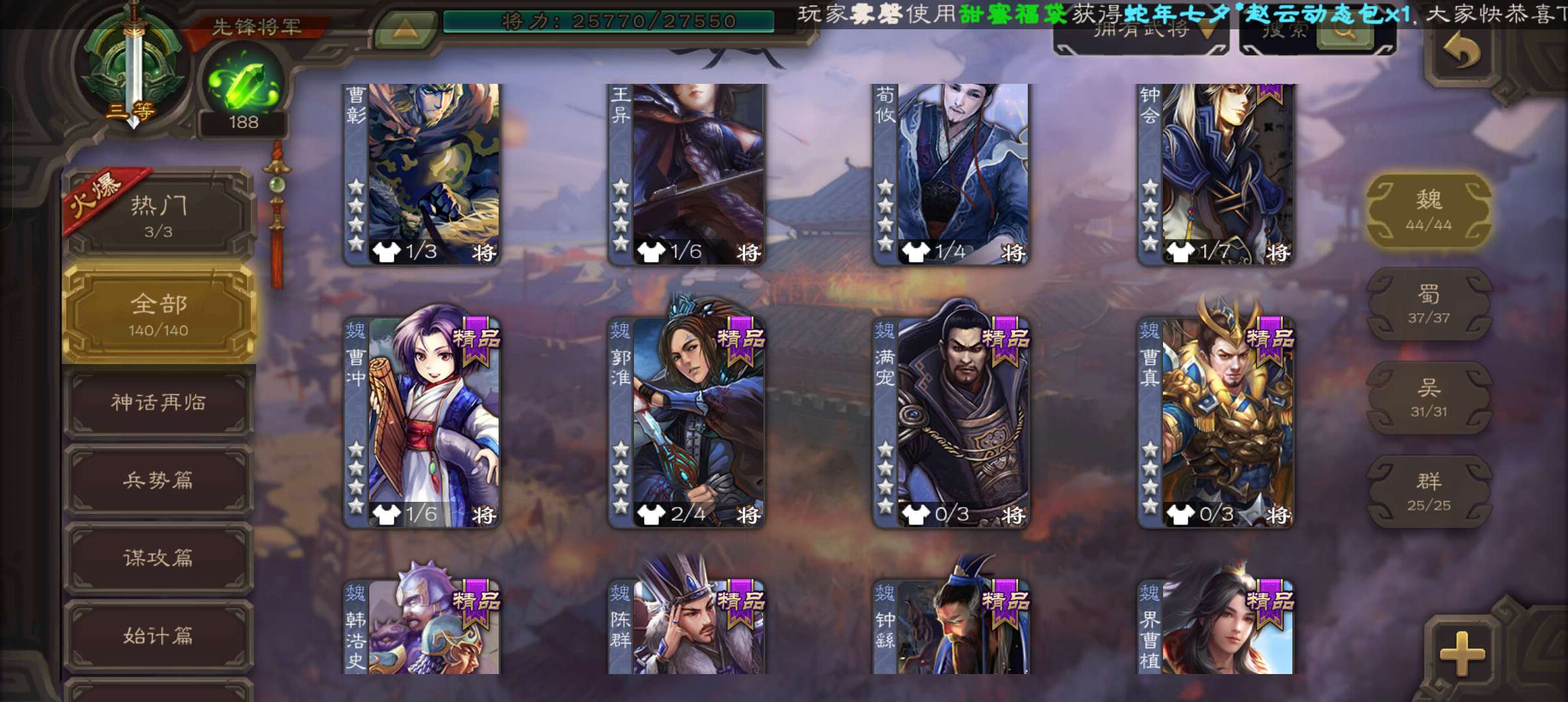 4史诗4神先锋,5万5豆,乌鸦动态界钟会神吕布神刘备谯周,神周瑜神吕蒙动界诸葛亮霍峻谋卢植谋140将