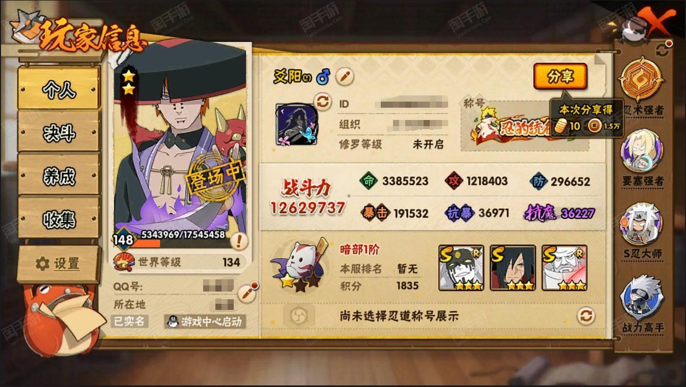 火影忍者【安卓QQ】【编号86982 V11】【30S忍者准32S忍者41A忍者1428W战力-2.6w金币】