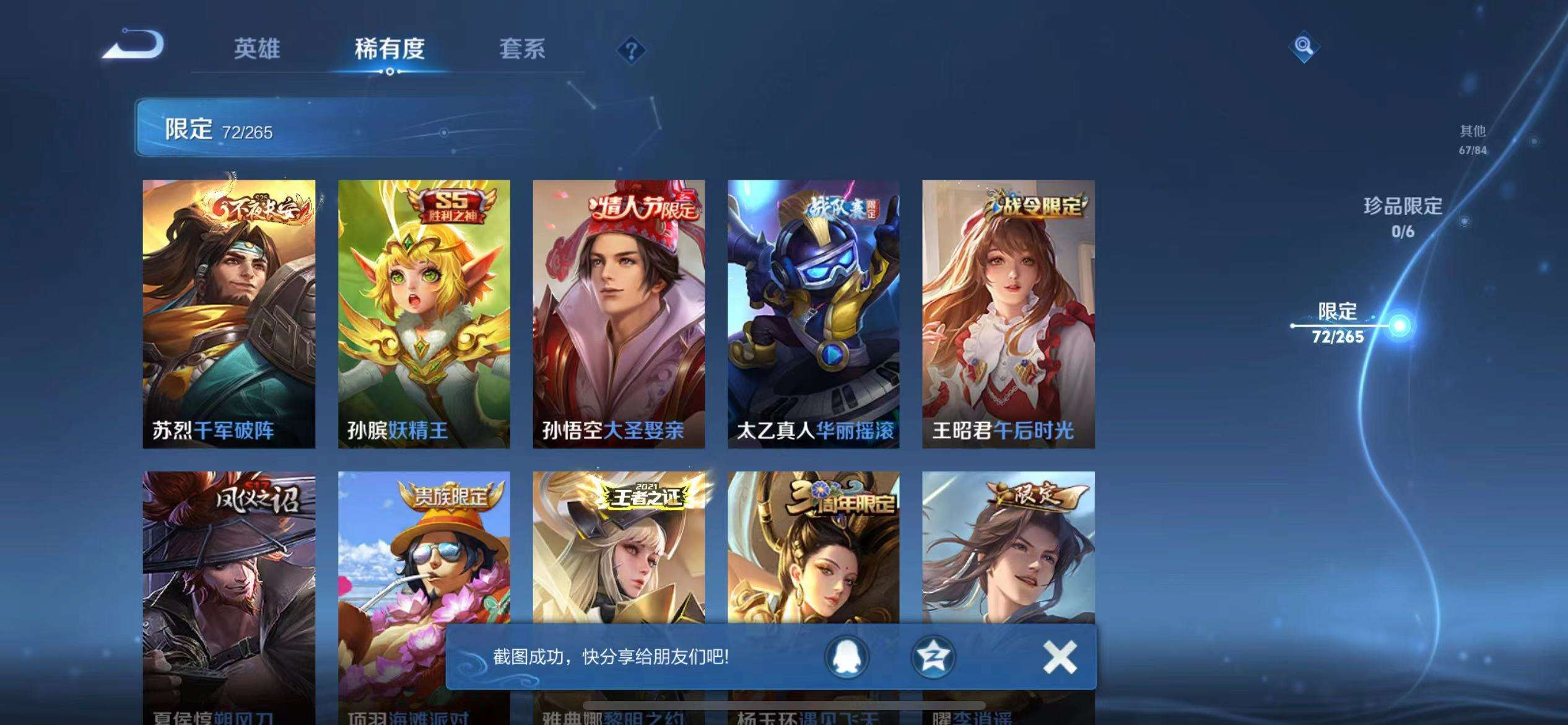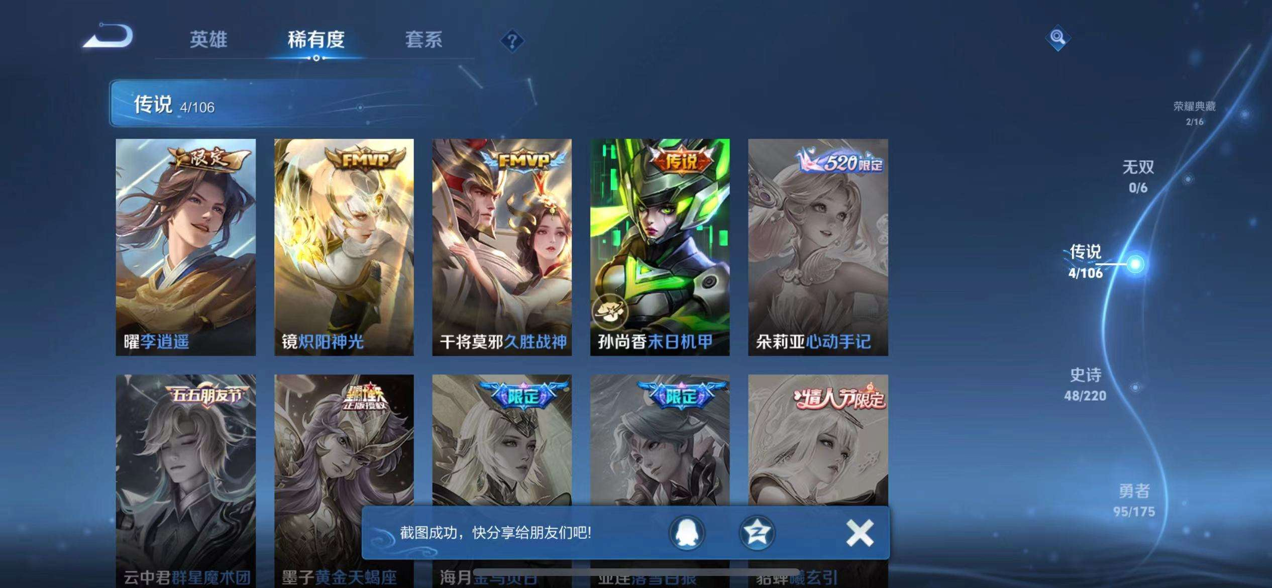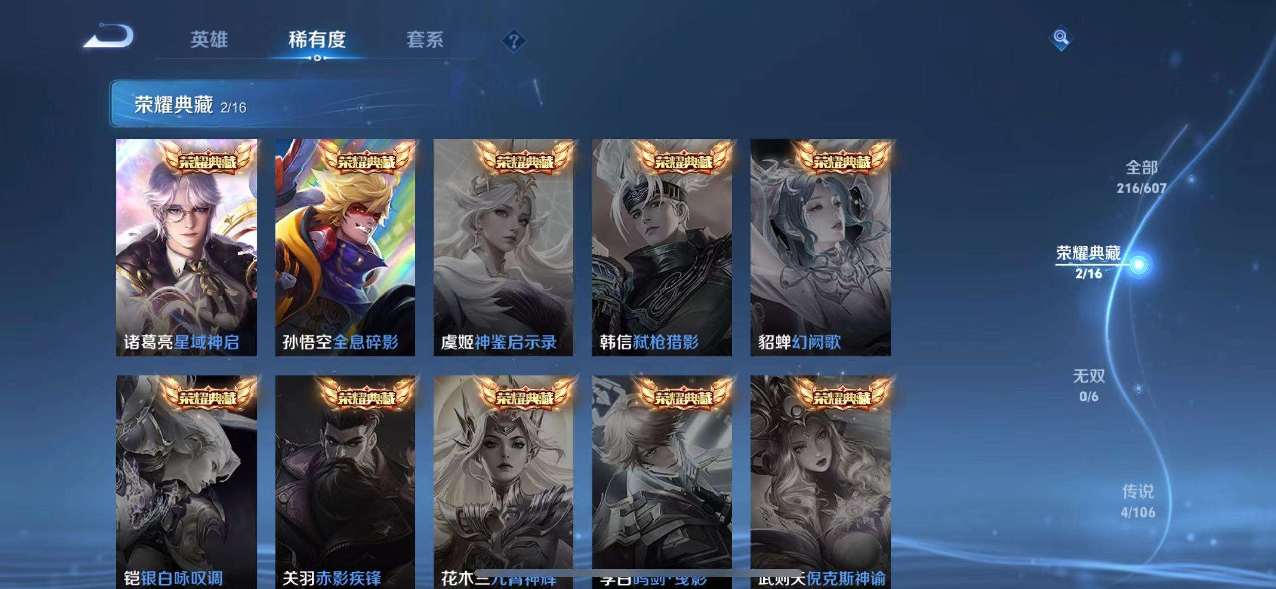 16皮/2典藏/4传说/1星传说/117英雄/诸葛亮-星域神启/孙悟空-全息碎影/曜-李逍遥/干将莫邪-久胜战神/镜-炽阳神光/孙尚香-末日机甲/关羽-冰锋战神/韩信-飞衡/百里守约-朱雀志/橘右京-