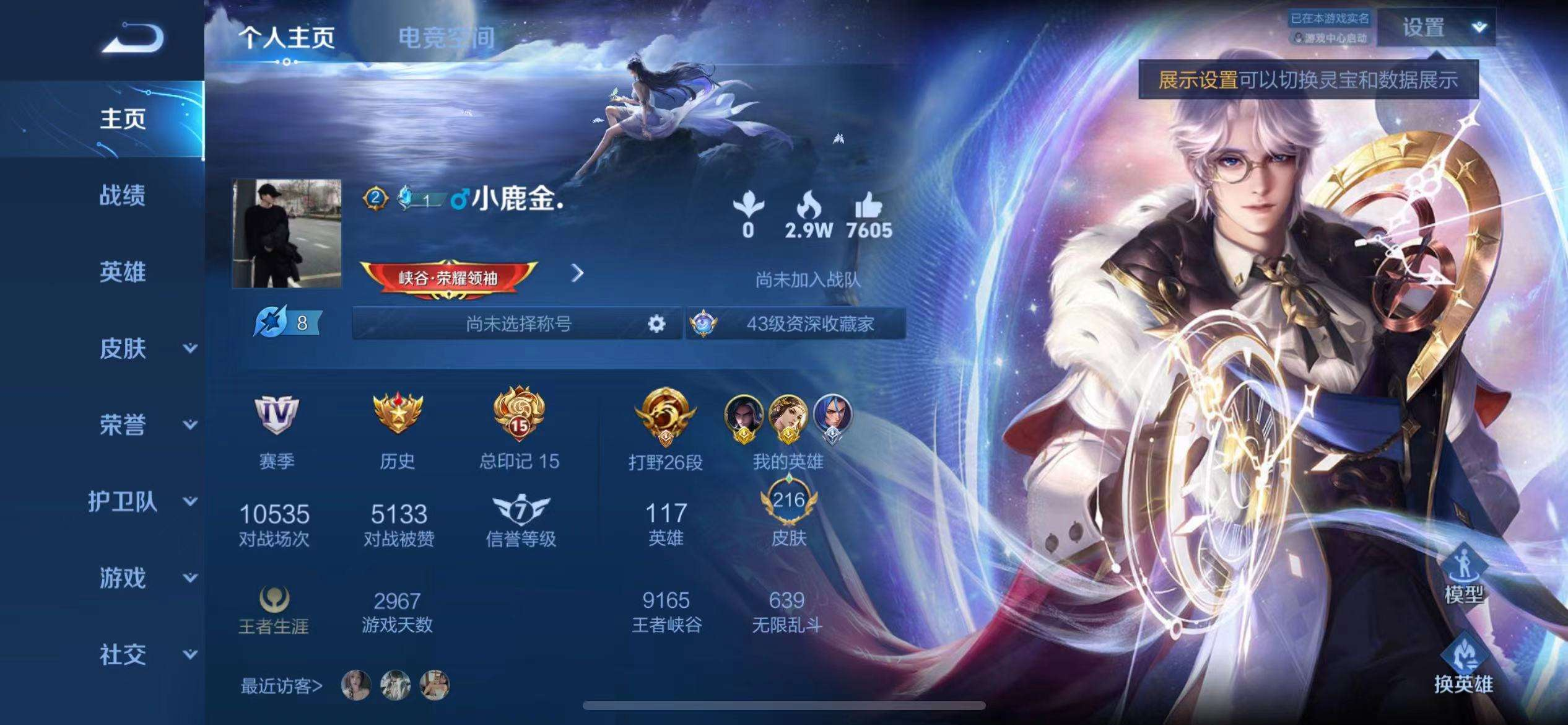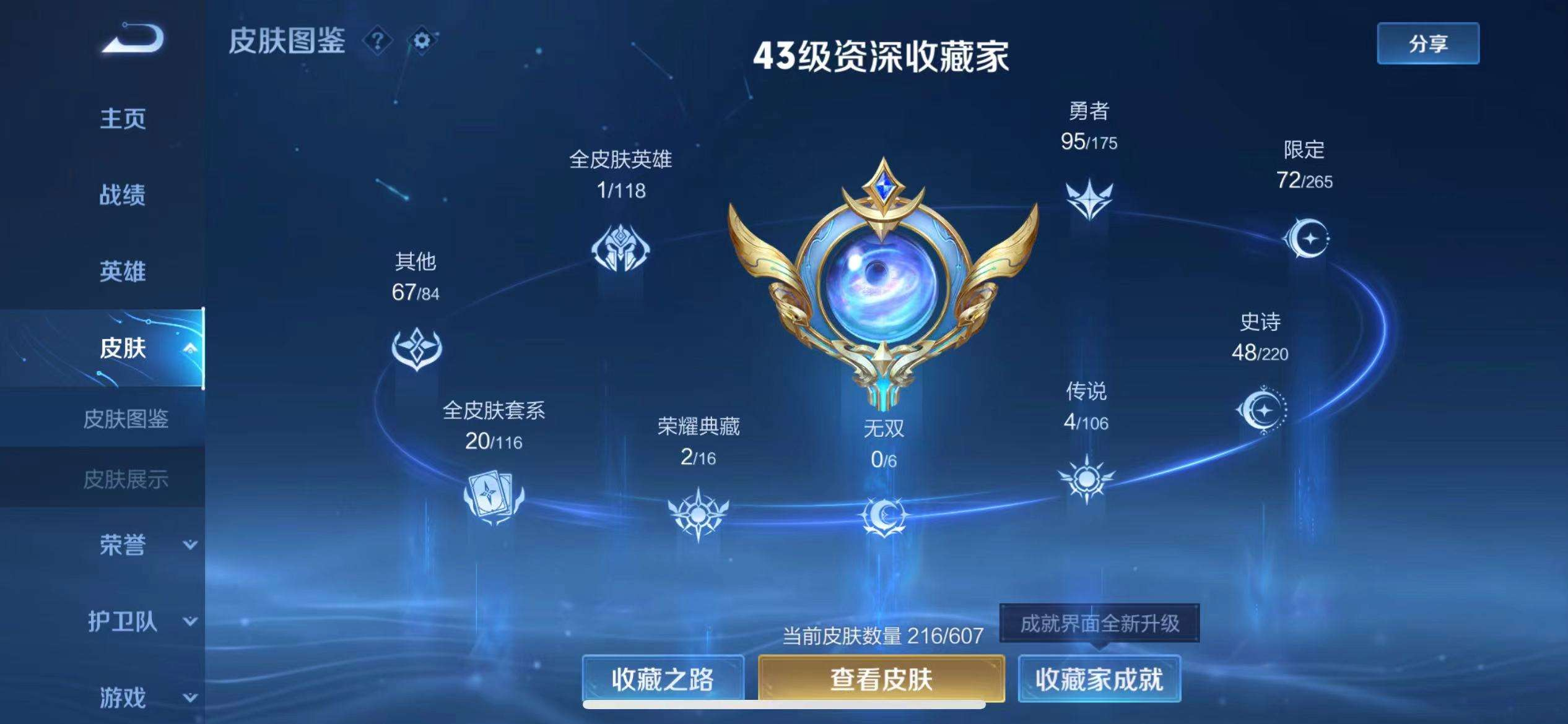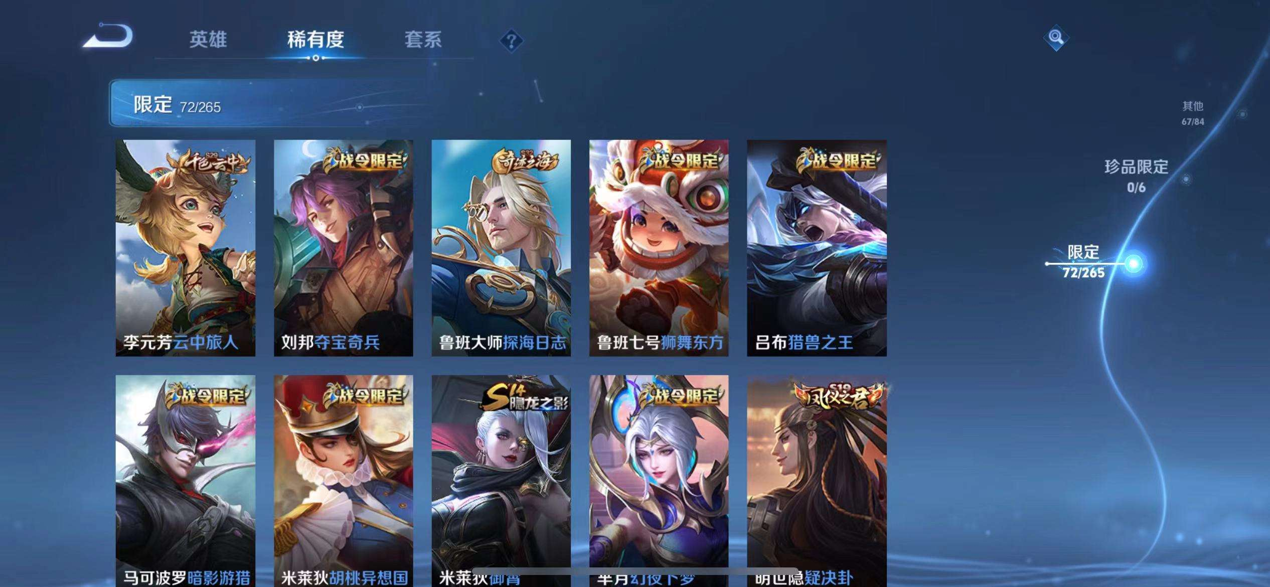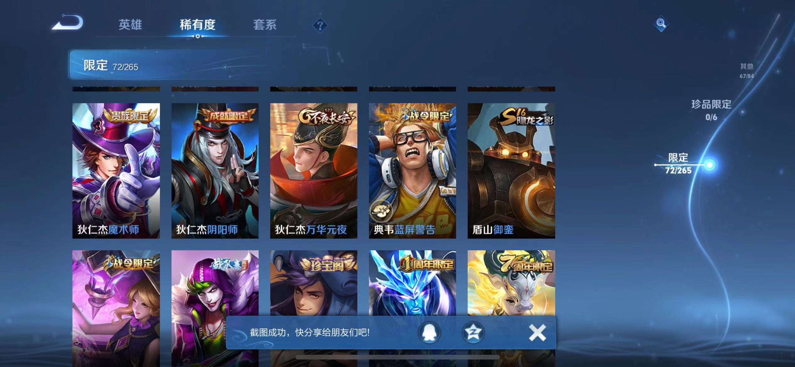 16皮/2典藏/4传说/1星传说/117英雄/诸葛亮-星域神启/孙悟空-全息碎影/曜-李逍遥/干将莫邪-久胜战神/镜-炽阳神光/孙尚香-末日机甲/关羽-冰锋战神/韩信-飞衡/百里守约-朱雀志/橘右京-