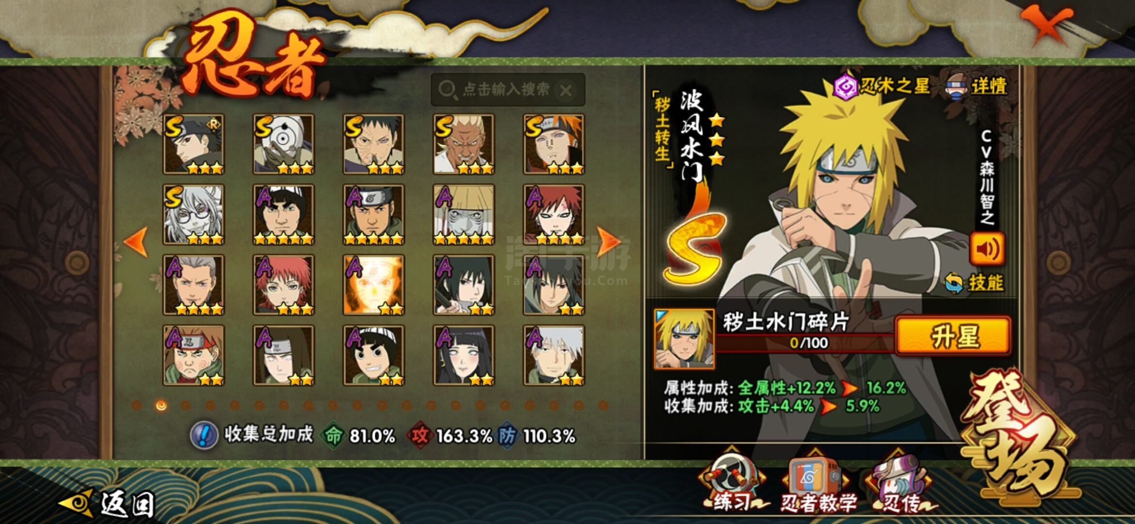 【S级忍者】:猿飞日斩「秽土转生」(3星),波风水门「秽土转生」(3星),千手扉间「秽土转生」(3星),千手柱间「秽土转生」(3星),宇智波鼬「秽土转生」(3星),宇智波斑「秽土转生」(3星),宇智波斑「秽土转生·解」(3星),春野樱「忍界大战」(3星),宇智波带土「忍界大战」(3星),艾「忍界大战」(3星),宇智波鼬「须佐能乎
