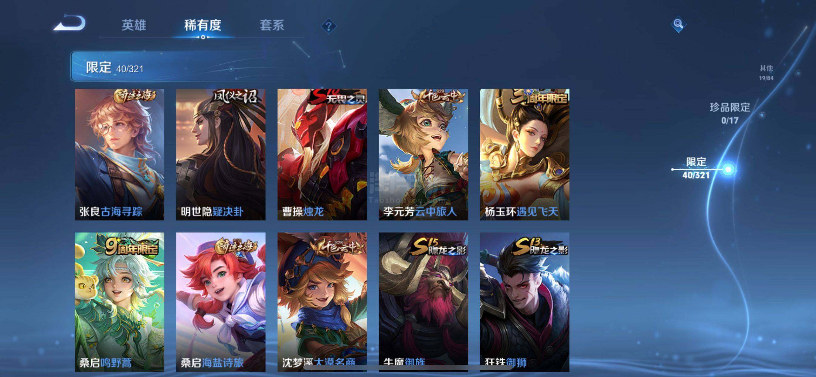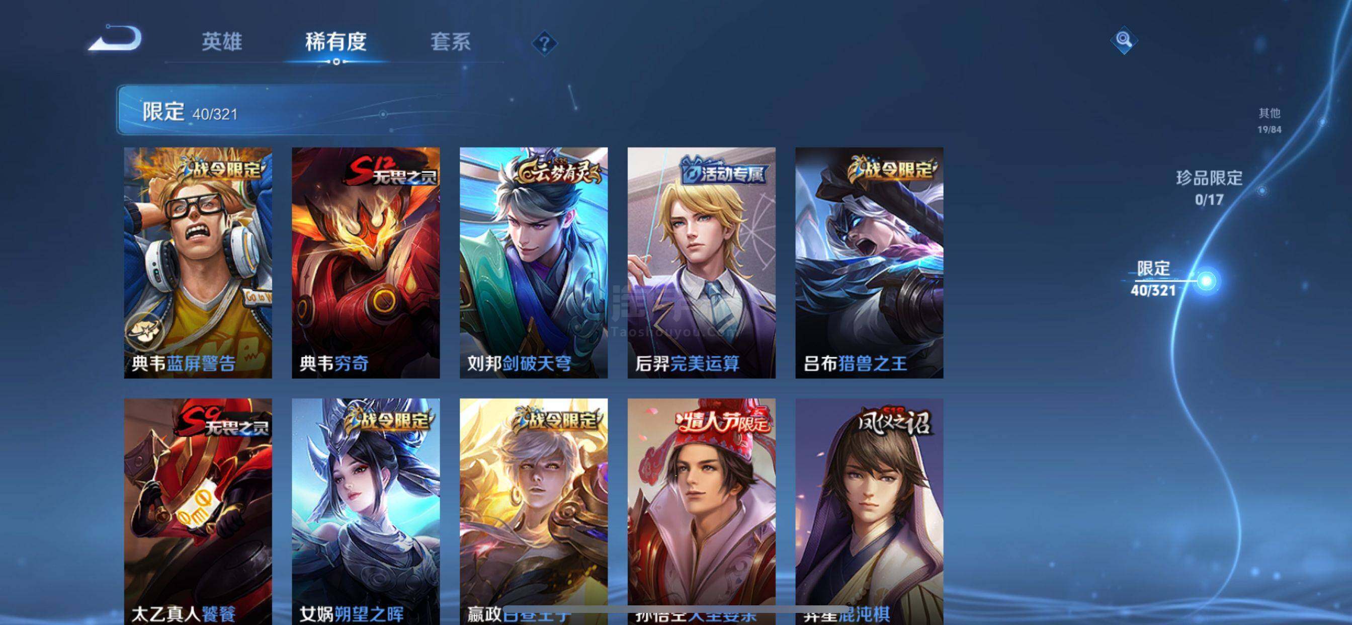 【限定皮肤】:白起狰,狄仁杰阴阳师,赵云皇家上将,嬴政白昼王子,鲁班七号狮舞东方,吕布猎兽之王,曹操烛龙,典韦穷奇,典韦蓝屏警告,达摩沙漠
