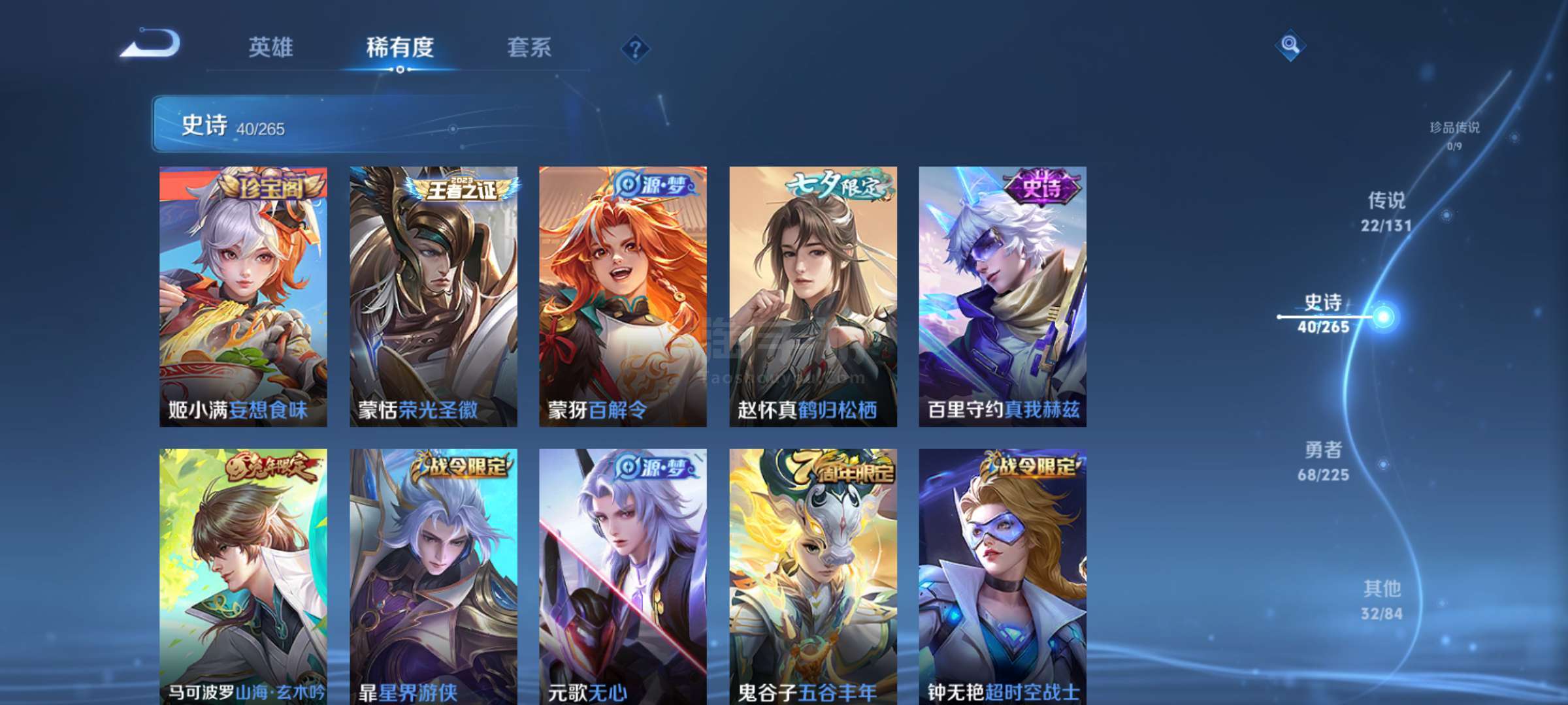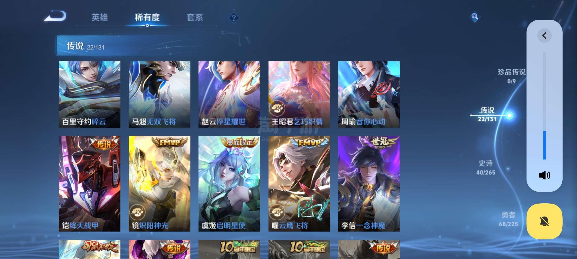 有22个传说。也有一个百里守约的朱雀记马可波罗的兔年限定。金铲铲充到v4