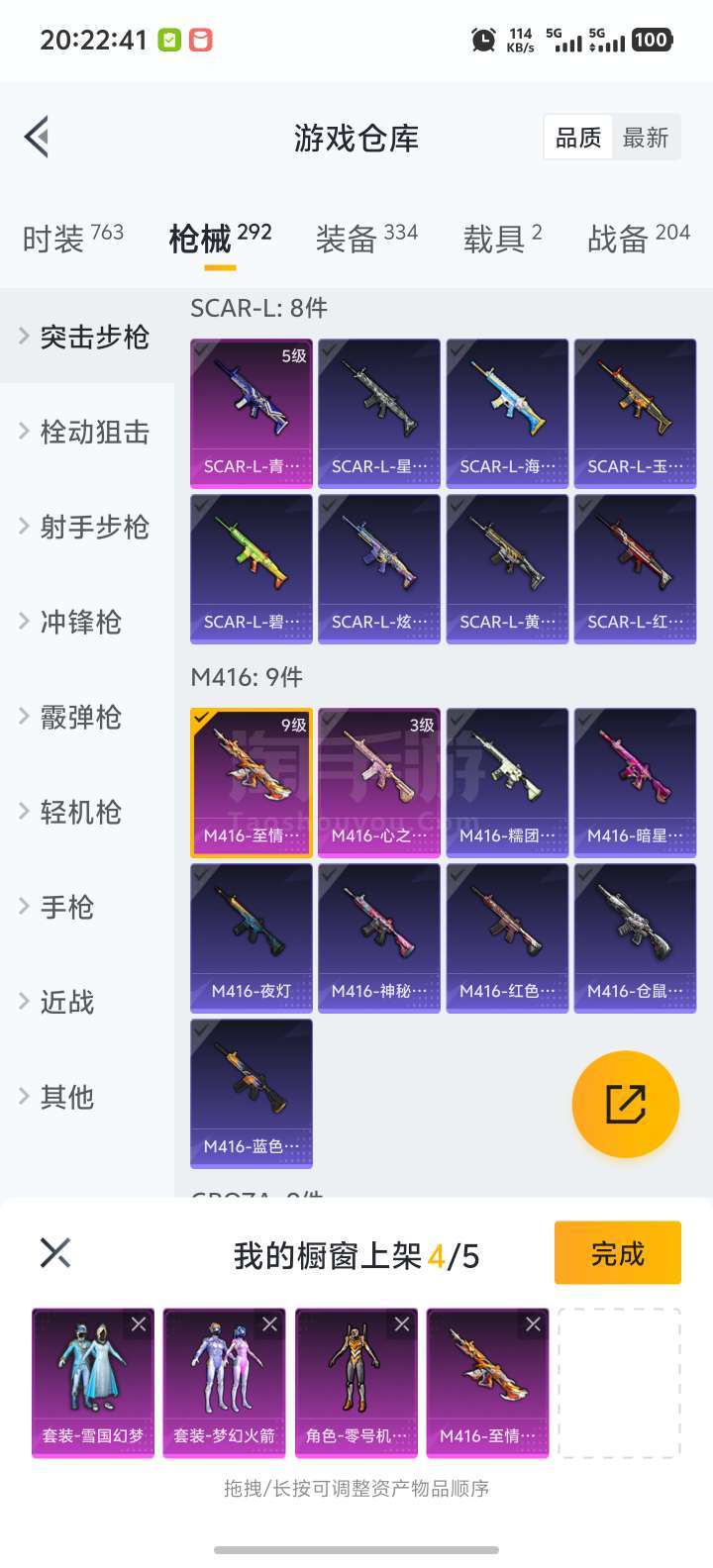 M4至情至圣 火箭少女 黄色螳螂 雪国 AKM炫紫旋律 SCAR-L青春物语 M762甜蜜誓约 载具